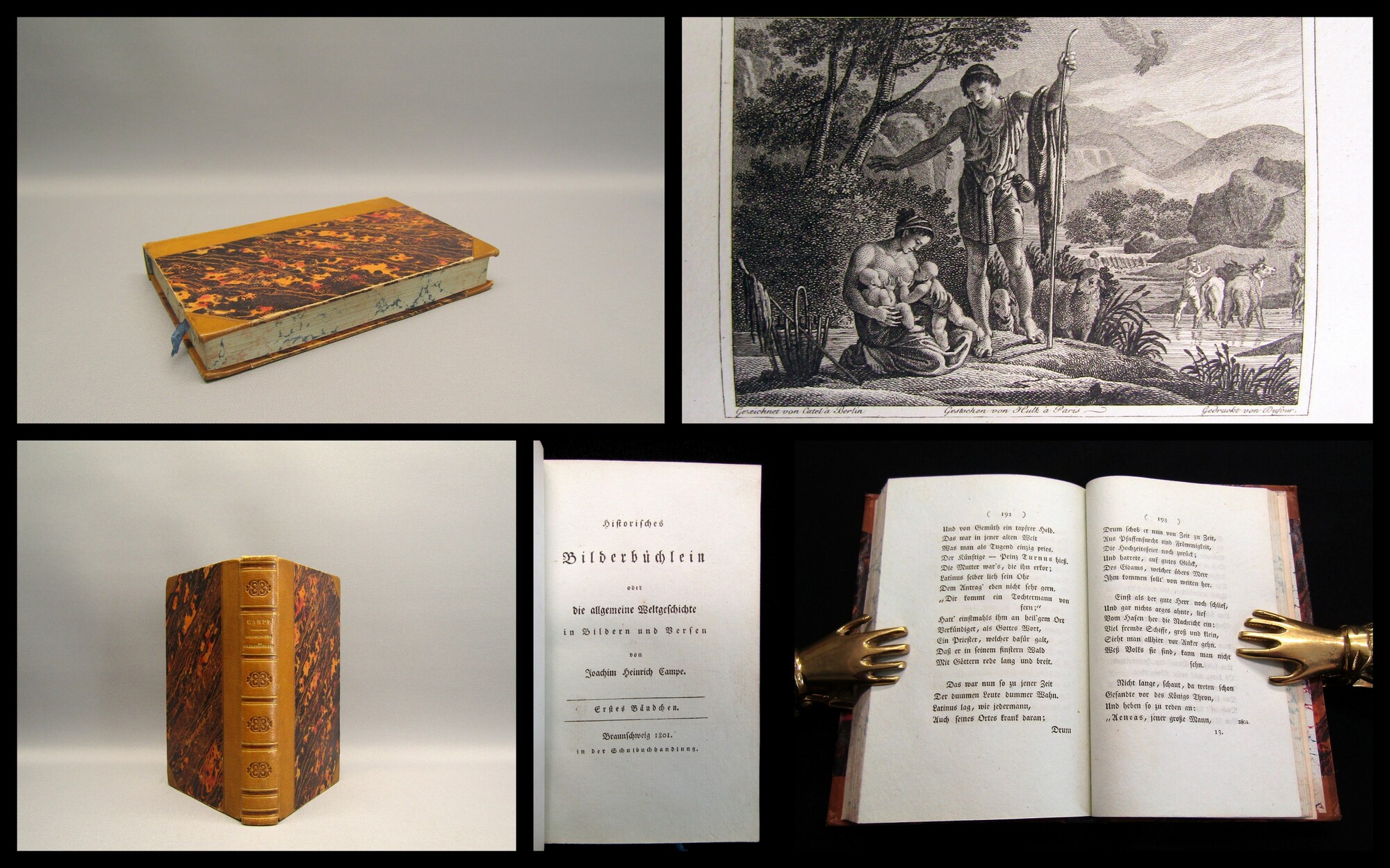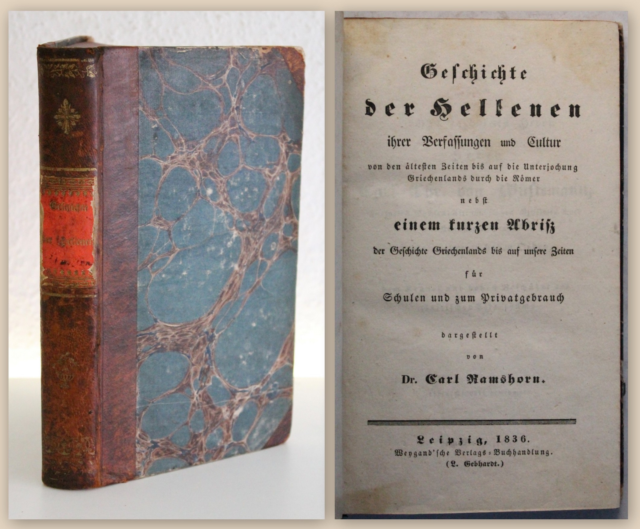 Zapf, Georg Wilhelm/ Riedel, Gottlieb Friedrich. Gallerie der alten Griechen und Römer in zwey und achtzig Abbildungen und einer kurzen Geschichte ihres Lebens. Gestochen von Gottlieb Friedrich Riedel. Augsburg, Christoph Friedrich Bürglen, 1801. 8°(ca.20x16cm) - mit 1 gest. Titel und 82 Kupfertafeln - 1(w)Bl., XIII, 3 Bll., 250 S. - HLdr mit Rückenschild. Einband etwas berieben und bestoßen, Gelenke in Höhe der Kapitale leicht eingedrückt. Ecken mit kleinen Fehlstellen. Mit Exlibris von Erika Schug (geb.Thaller) und kleinem Stempel von der Bibliothek Thaller, außerdem mit einem kleinen Stempel von Ernst Thaller. Papier altersbedingt gering gebräunt, fast durchgehend etwas braun- und fingerfleckig, mit kleinen Feuchtigkeitsflecken auf den ersten paar Seiten. . Bestell-Nr: 8-0-618..........150,00 € (inkl. MwSt. zzgl. Versand) | ![]() | |