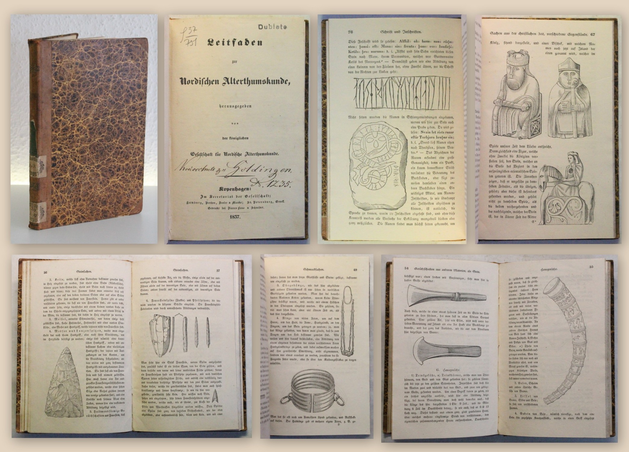 Societe Royale des Antiquaires du Nord. Atlas de L'Archeologie du Nord Representant des Echantillons de L'Arge de Bronze et de L'Arge de Fer. Copenhague, Imprimerie de Thiele, 1857. 2°, mit 22 Stahlstichtafeln, 10 S., HLn. d. Z.. Die qualitativ sehr hochwertigen gestochenen Tafeln zeigen: Waffen, Schilder, Schmuck und Medaillen der Bronzezeit. Einband leicht bereiben und bestoßen, etwas fleckig, mit größerer Fehlstelle im Bezugspapier an der oberen Ecke des hinteren Buchdeckels. Papier unterschiedlich stark fleckig Tafeln nur leicht betroffen. Gesamt gutes Exemplar des hochinteressanten Titels. Bestell-Nr: 8-0-260..........250,00 € (inkl. MwSt. zzgl. Versand) | ||