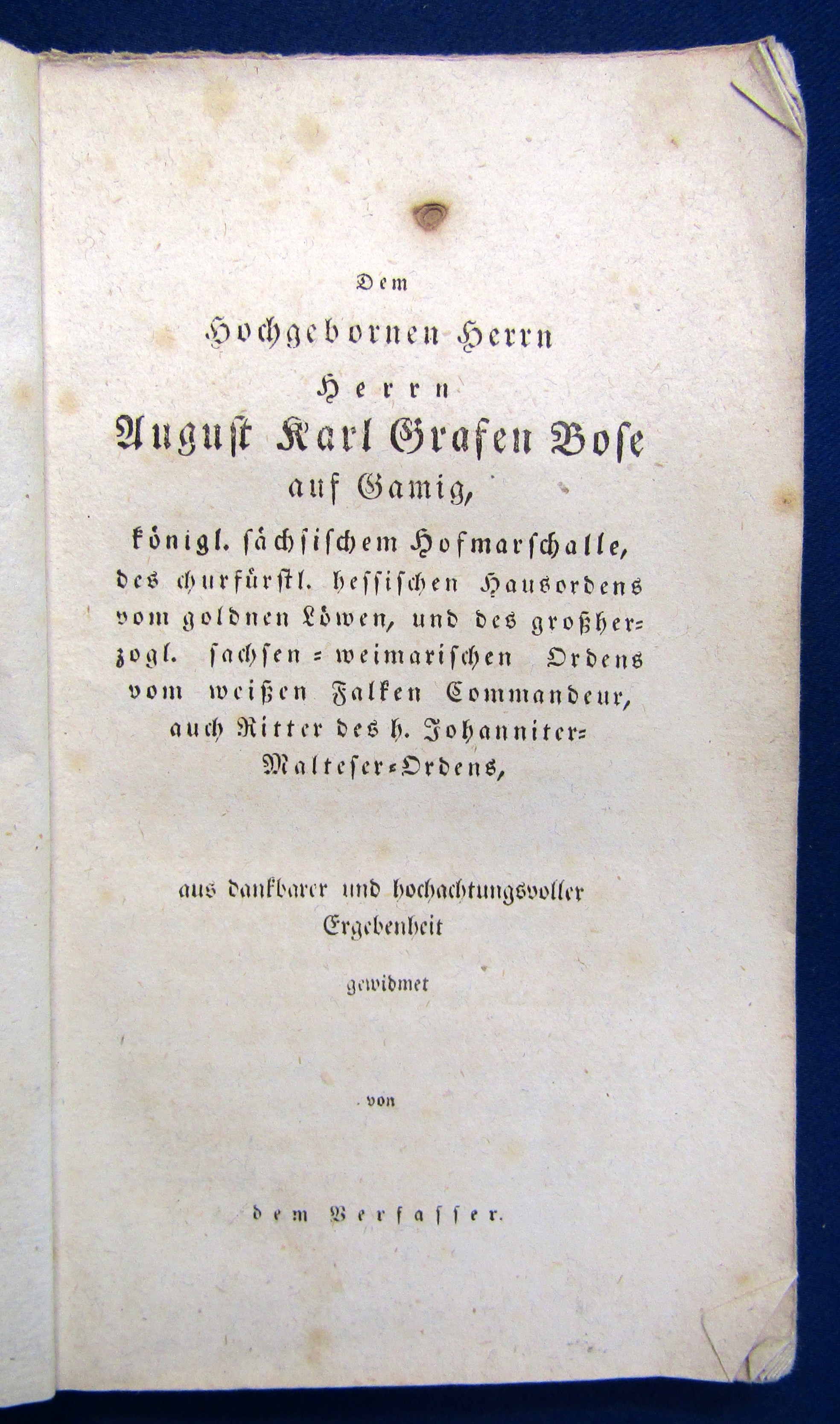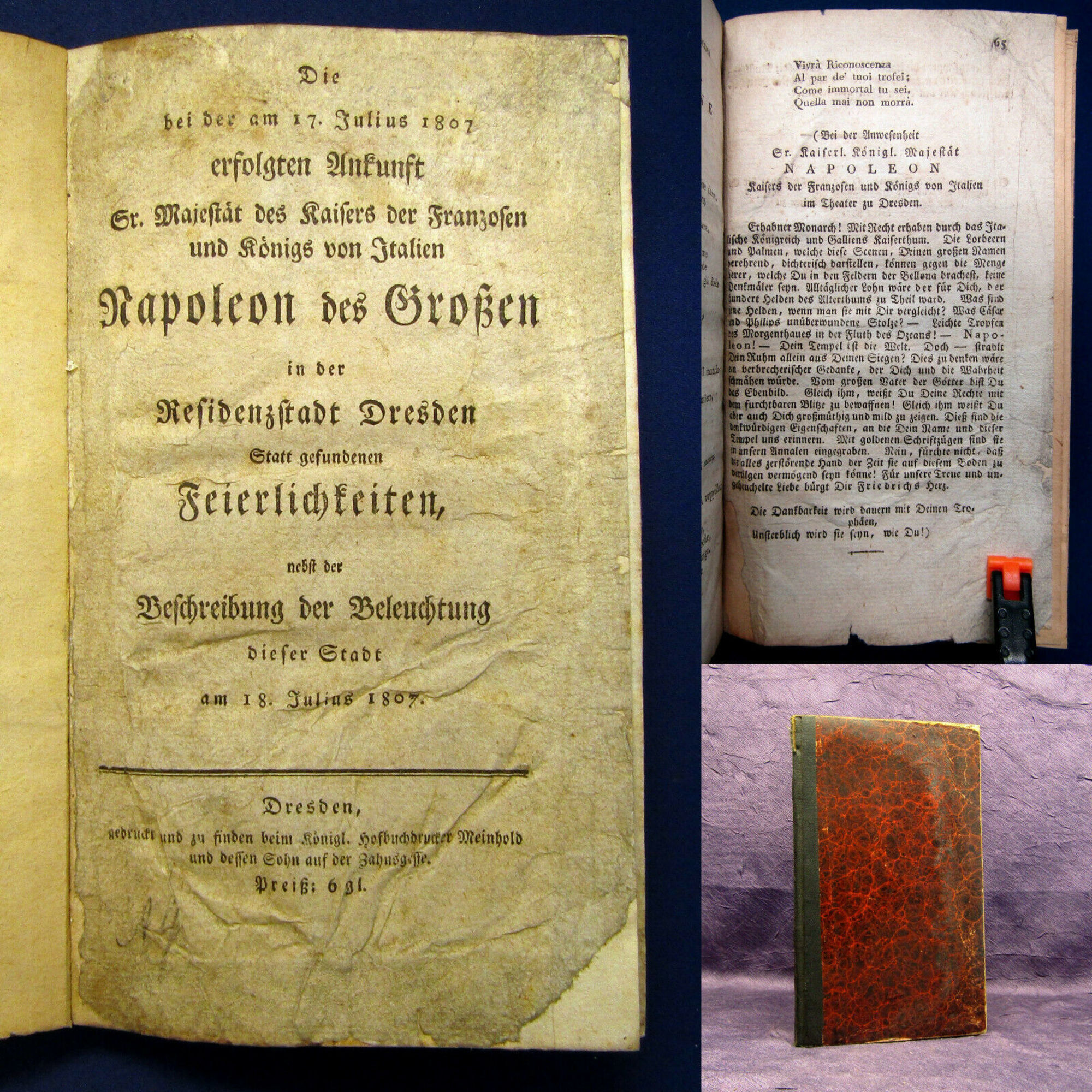 Anonym. Die bei der am 17 Julius 1807 erfolgten Ankunft Sr. Majestät des Kaisers der Franzosen und Königs von Italien Napoleon des Großen in der Residenzstadt Dresden statt gefundenen Feierlichkeiten nebst Beschreibung der Beleuchtung dieser Stadt am 18. Julius 1807.. Dresden, Meinhold, o. J. um 1807. 8°, 66 S., späterer HLn. Sehr selten. Für uns in Bibliotheken nicht nachweisbar. Einband berieben und bestoßen, mit kleineren Fehlstellen, am vorderen Gelenk oben mit kleinem Einriss. Erstes und letztes Blatt stark verschmutzt etwas dünn und hinterlegt. Papierbedingt leicht gebräunt und etwas fleckig. Gesamt noch gutes Exemplar.. Bestell-Nr: 8-0-410..........verkauft | ![]() | |