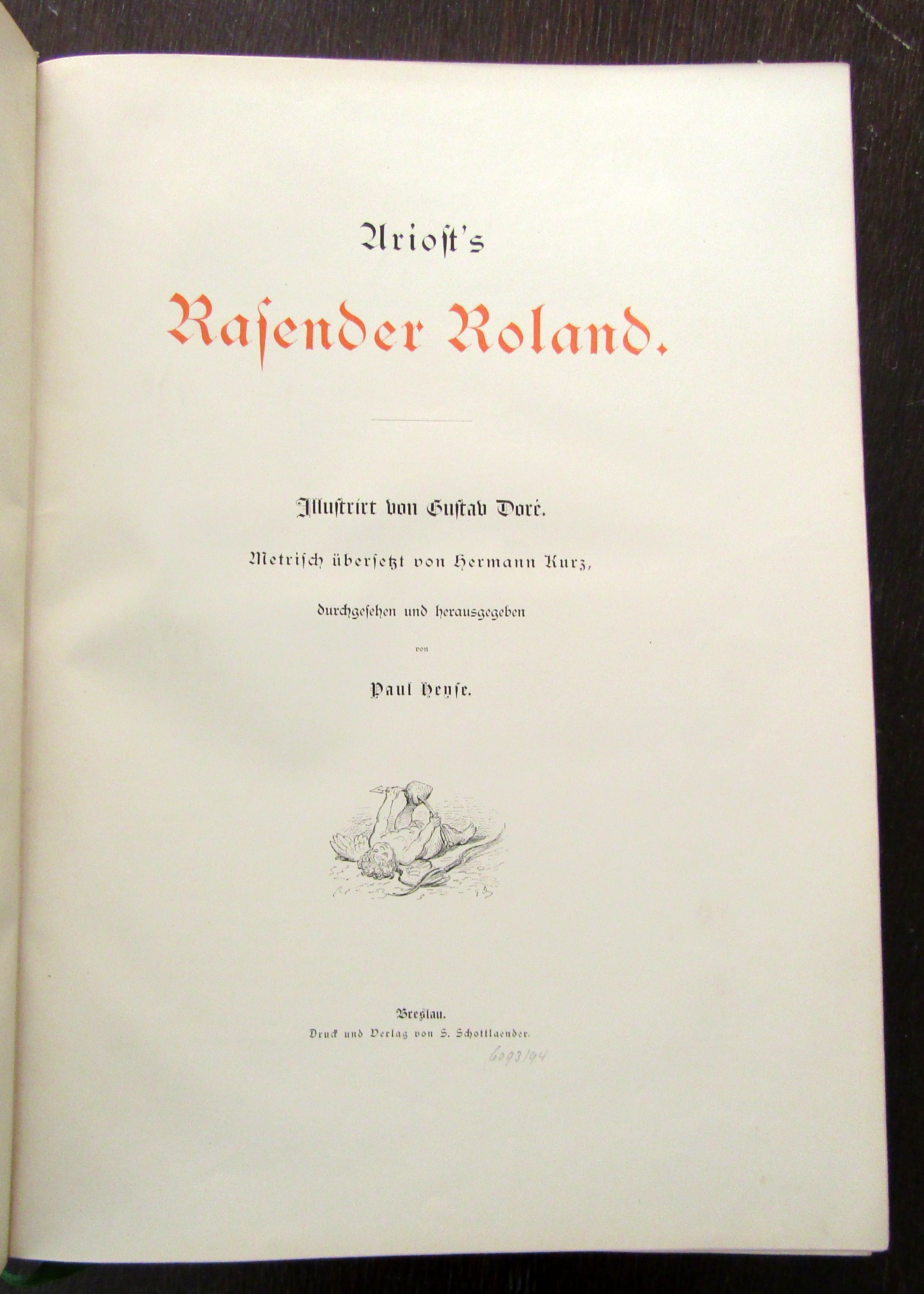 Ariost, Lodovico. Rasender Roland. Metrisch übers. von H. Kurz, durchges. u. hg. von Paul Heyse. 2 Bde.. Breslau, Schottlaender, (1880). Folio; mit 1 Holzschnitt-Titel u. 80 Holzstichtaf. und zahl. Textholzstichen; 3 Bll.; X; 636 S. Blind- u. goldgepr. OLedbde mit dreis. Goldschnitt. Vgl. Vicaire I, 85 f (fr. A.) - Erste deutsche Ausgabe mit den Illustrationen von Gustav Dore. Einbände berieben und bestoßen. Widmung auf Vorsatz. Papier altersbedingt minimal gebräunt. Schöne Exemplare.. Bestell-Nr: 8-0-380..........verkauft | ![]() | |
