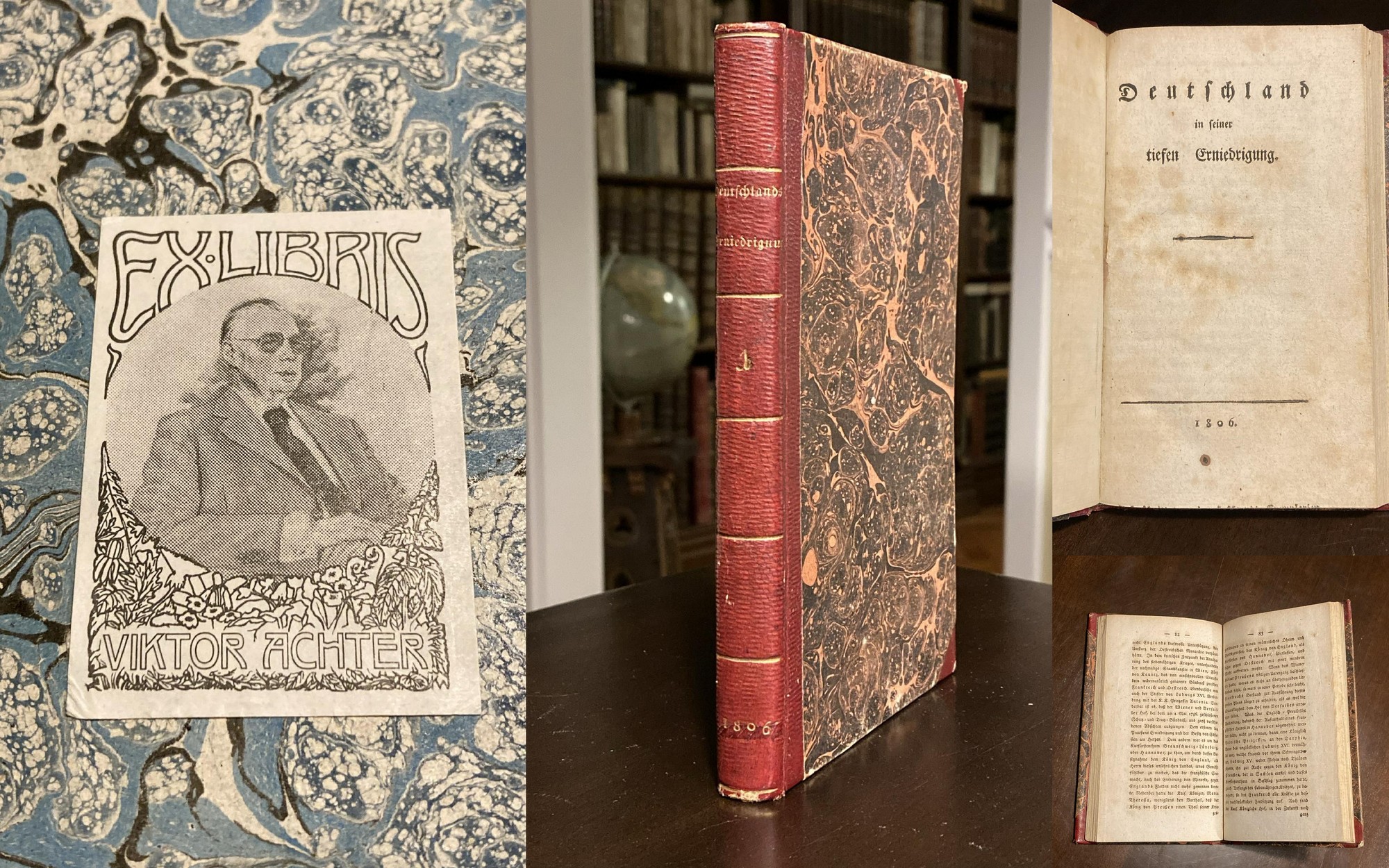 X. Y. Z. (Arndt, Ernst Moritz). Beherzigungen vor dem Wiener Kongreß. o.O. (Leipzig), o. V. (Rein), 1814. Kl.8°, Titel, 186 S. neuerer, dekorativer HLdr. im Stil d. Z. . Holzmann/Bohatta I, 4375. – Goedeke VII, 825, 48 (mit Angabe des Verlegers). – Schäfer/Schawe 538. – Loh 318 - Erste und einzige Ausgabe. – »Die unter Steins Inspiration entstandene Flugschrift behandelt die Normen für eine künftige deutsche Verfassung. […] Die Broschüre war in fast ganz Deutschland streng verboten.« (Schäfer/Schawe) – »verständlicherweise«: Bereits im zweiten Kapitel forderte Arndt, dass »die allgemeine Pressfreiheit durch ein Reichsgesetz geheiligt und geboten werden« müsse. Papierbedingt minimal Gebräunt und vereinzelt leicht fleckig. Sehr schönes Exemplar. Bestell-Nr: 8-0-461..........verkauft | ||
