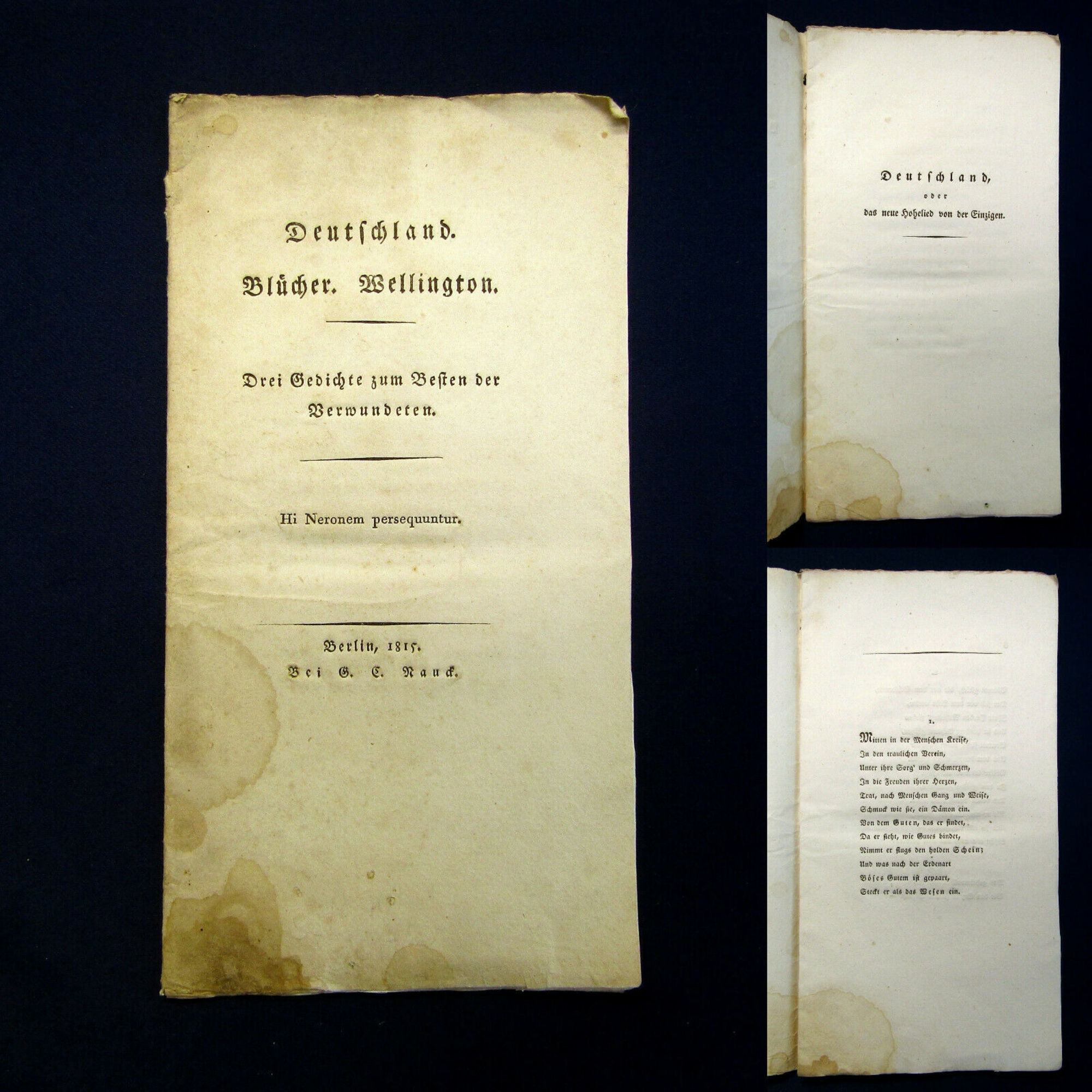 Anonym. Deutschland. Blücher. Wellington. Drei Gedichte zum Besten der Verwundeten. Berlin, Rauck, 1815. 8°, 15 S., Brosch. Sehr seltene Gedichte-Sammlung: hier nur das Gedicht "Deutschland" enthalten, in 10 Versen. Broschur etwas angeschmutzt, Papier teils wasserfleckig. Gesamt noch gutes Exemplar. Bestell-Nr: 8-0-396..........verkauft | ![]() | |