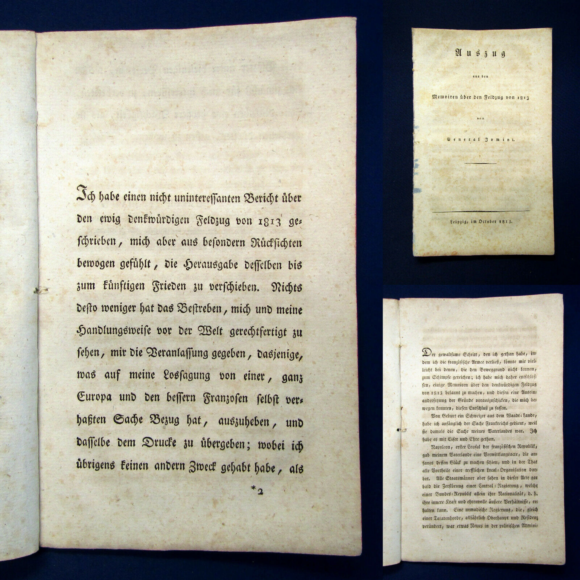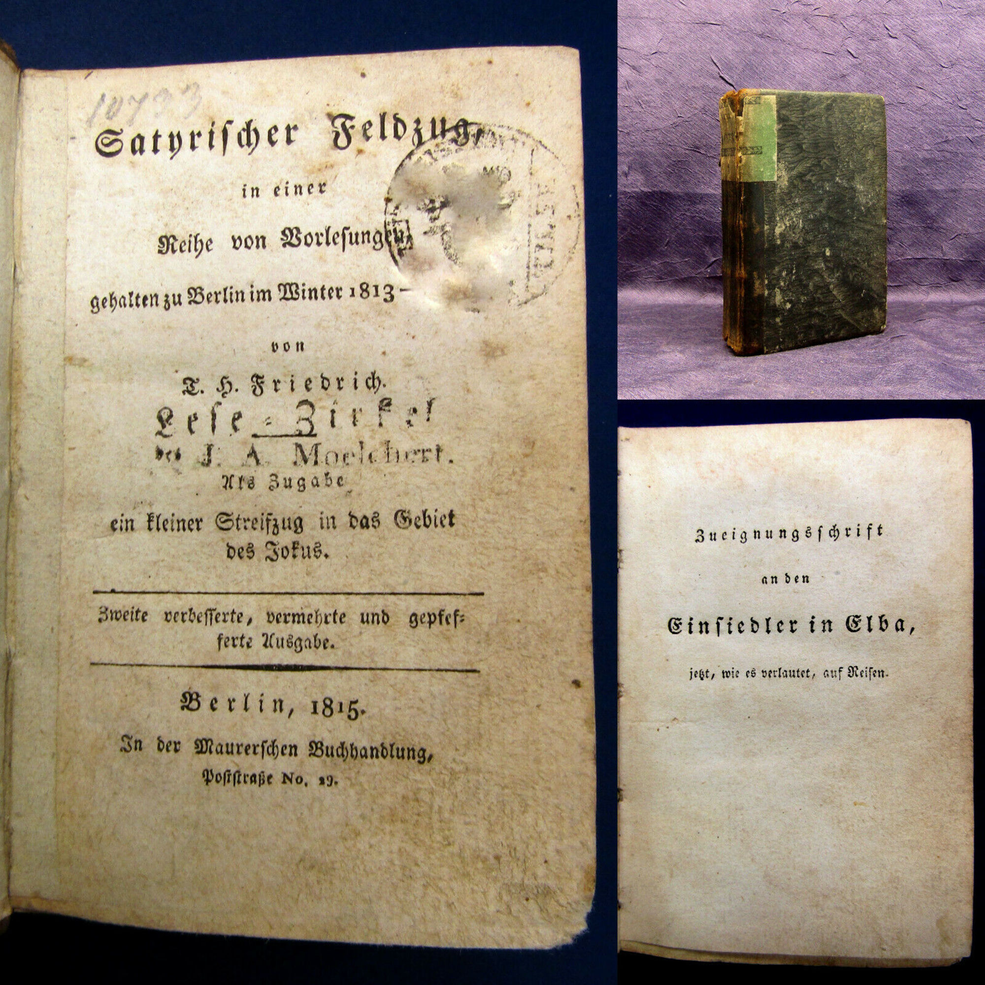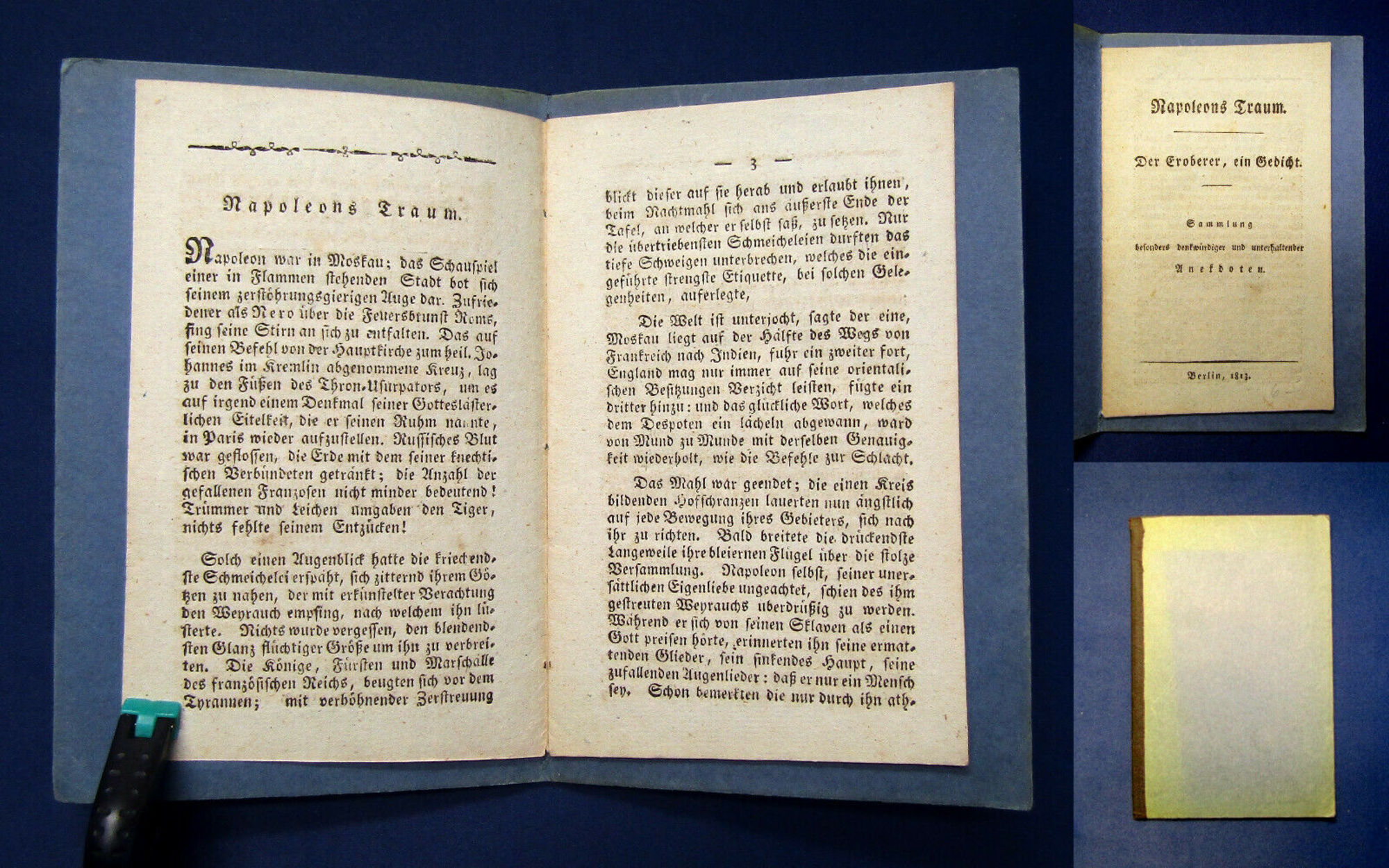 Anonym. Napoleons Traum. Der Eroberer, ein Gedicht. Sammlung besonders denkwürdiger und unterhaltender Anekdoten. Berlin, o. V., 1813. Kl.8°, 16 S., Brosch. Sehr selten Anonym verfasste Kleinschrift ohne Verlagsangabe aus der Zeit der Napoleonischen Kriege. Vereinzelt minimal fleckig. Sehr schönes Exemplar.. Bestell-Nr: 8-0-421..........verkauft | ![]() | |