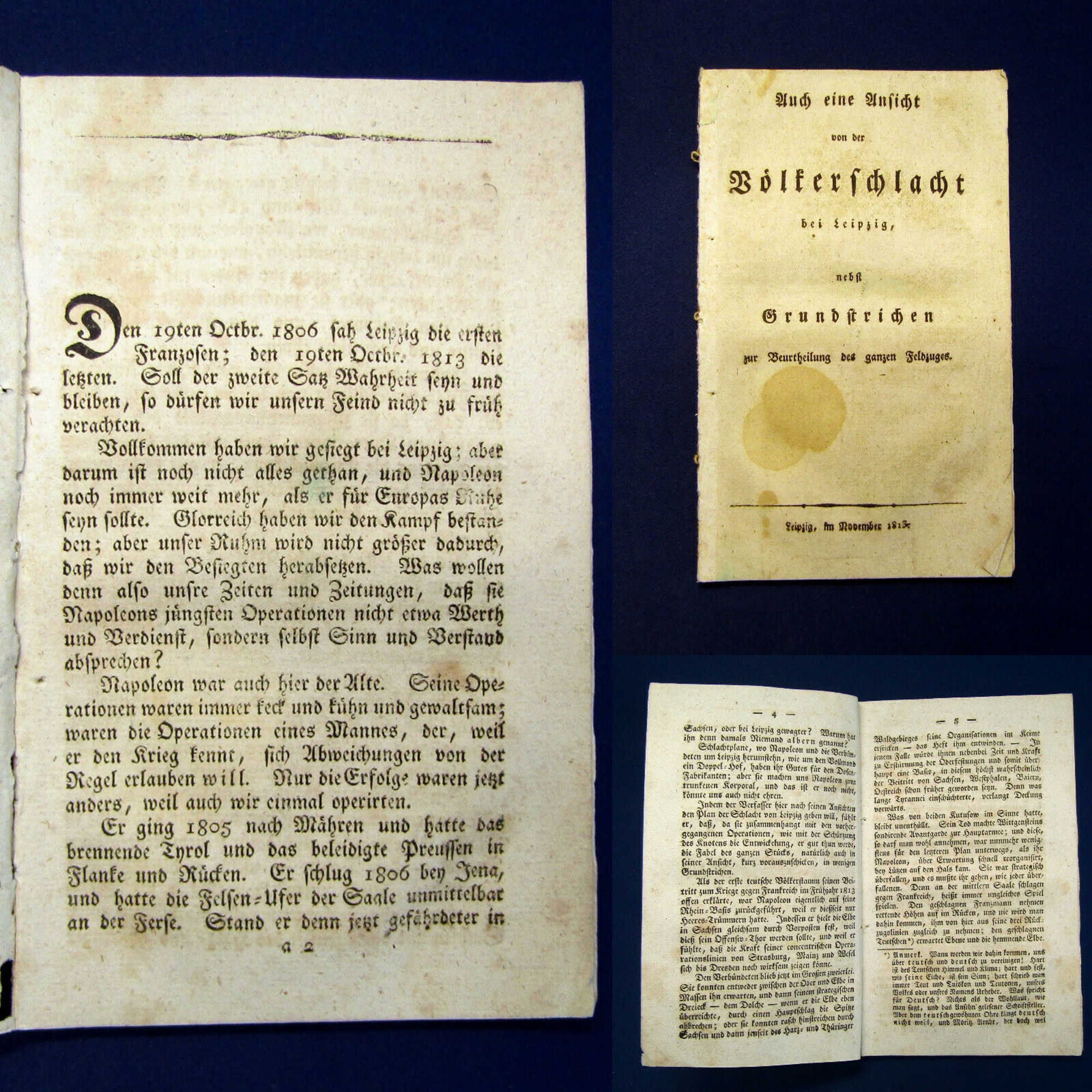 Anonym Müller, Karl . Auch eine Ansicht von der Völkerschlacht bei Leipzig : nebst Grundstrichen zur Beurtheilung des ganzen Feldzuges. Leipzig [Berlin], o. V. Mittler, 1813. Kl.8°, 30 S., Brosch. Seltene Kleinschrift zur Völkerschlacht von Karl Müller (1775–1847), preußischer Agent und Publizist. Broschur etwas angeschmutzt, Papier minimal gebräunt und leicht fleckig. Gesamt gutes Exemplar. Bestell-Nr: 8-0-398..........150,00 € (inkl. MwSt. zzgl. Versand) | ![]() | |