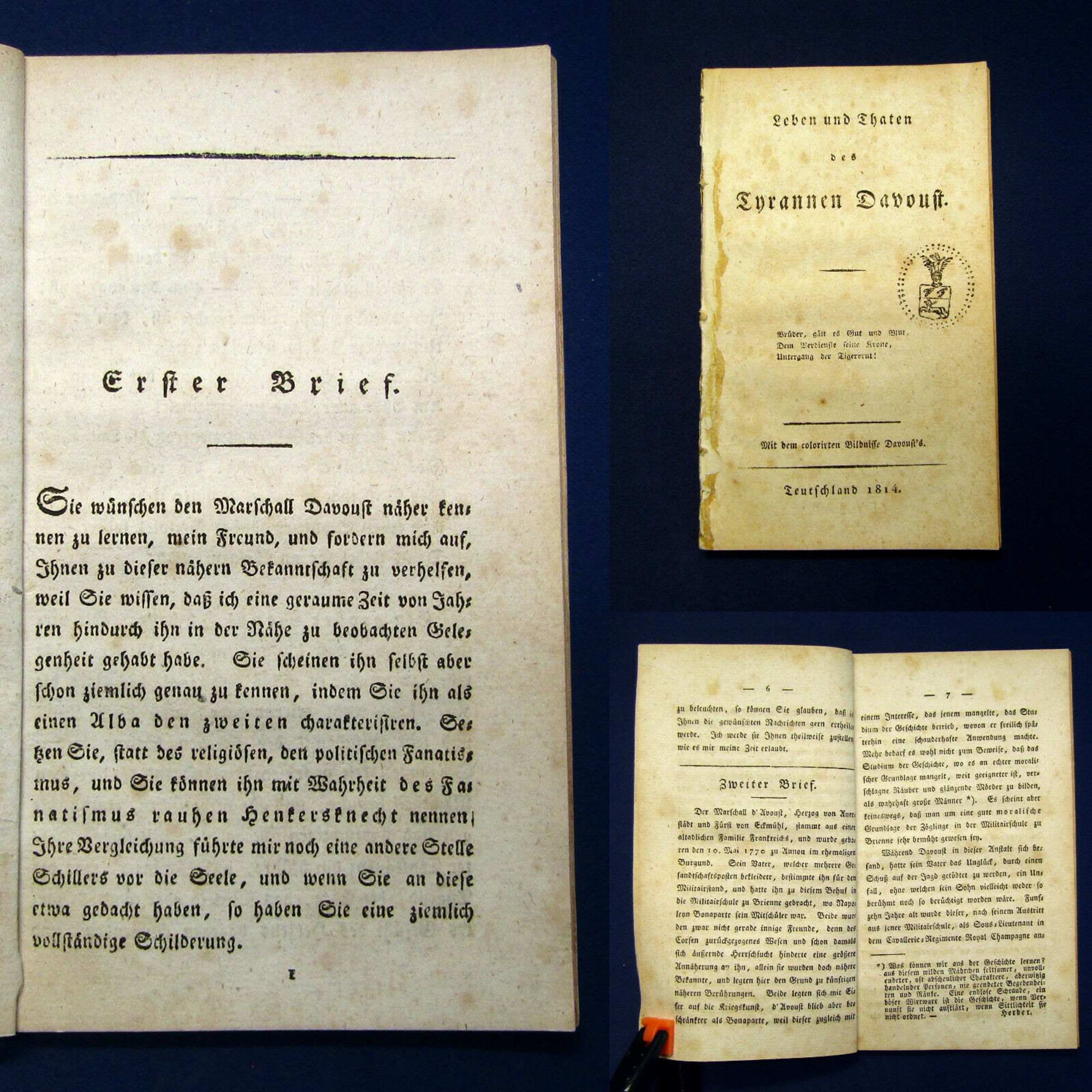 Anonym [Davout, Louis Nicolas]. DAVOUSTIANA. oder Marschall Davoust's und anderer französischer Generale Ungerechtigkeiten und Schandthaten. Nebst edlen Beispielen des Heldenmuths und der Vaterlandsliebe der Preussen und Russen.. o.O. Leipzig, o. V. Joachim, o. J. um 1814. 8°, 23 S. Rückenbroschur. Hinrichs - Nur die Angabe auf "Kosten des Verfassers" ohne Verlags-, Orts,- oder Jahresangabe. Laut Hinrichs: Leipzig, Joachim, 1814. Broschur von Außen etwas angeschmutzt, Papier minimal gebräunt und vereinzelt leicht fleckig. Gesamt gutes Exemplar. Bestell-Nr: 8-0-420..........verkauft | ||