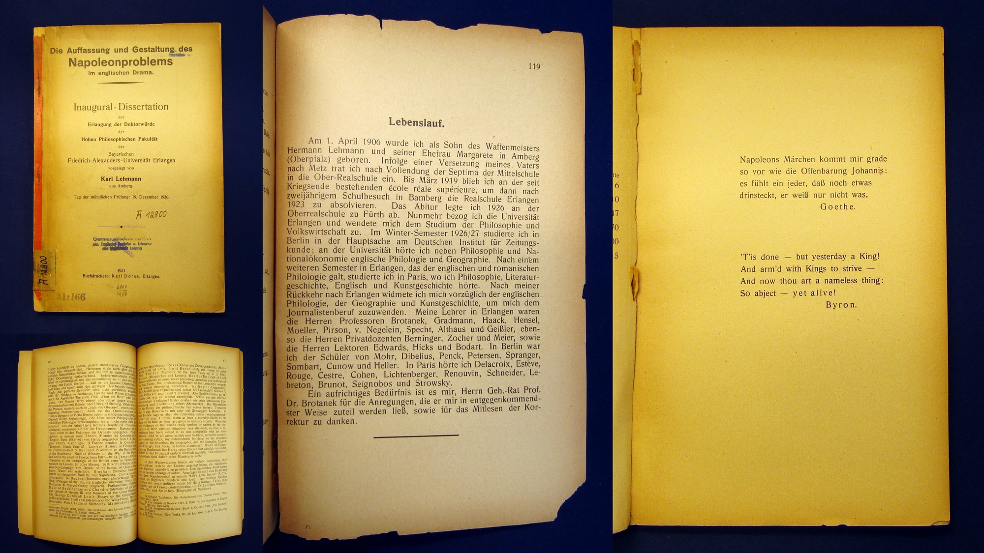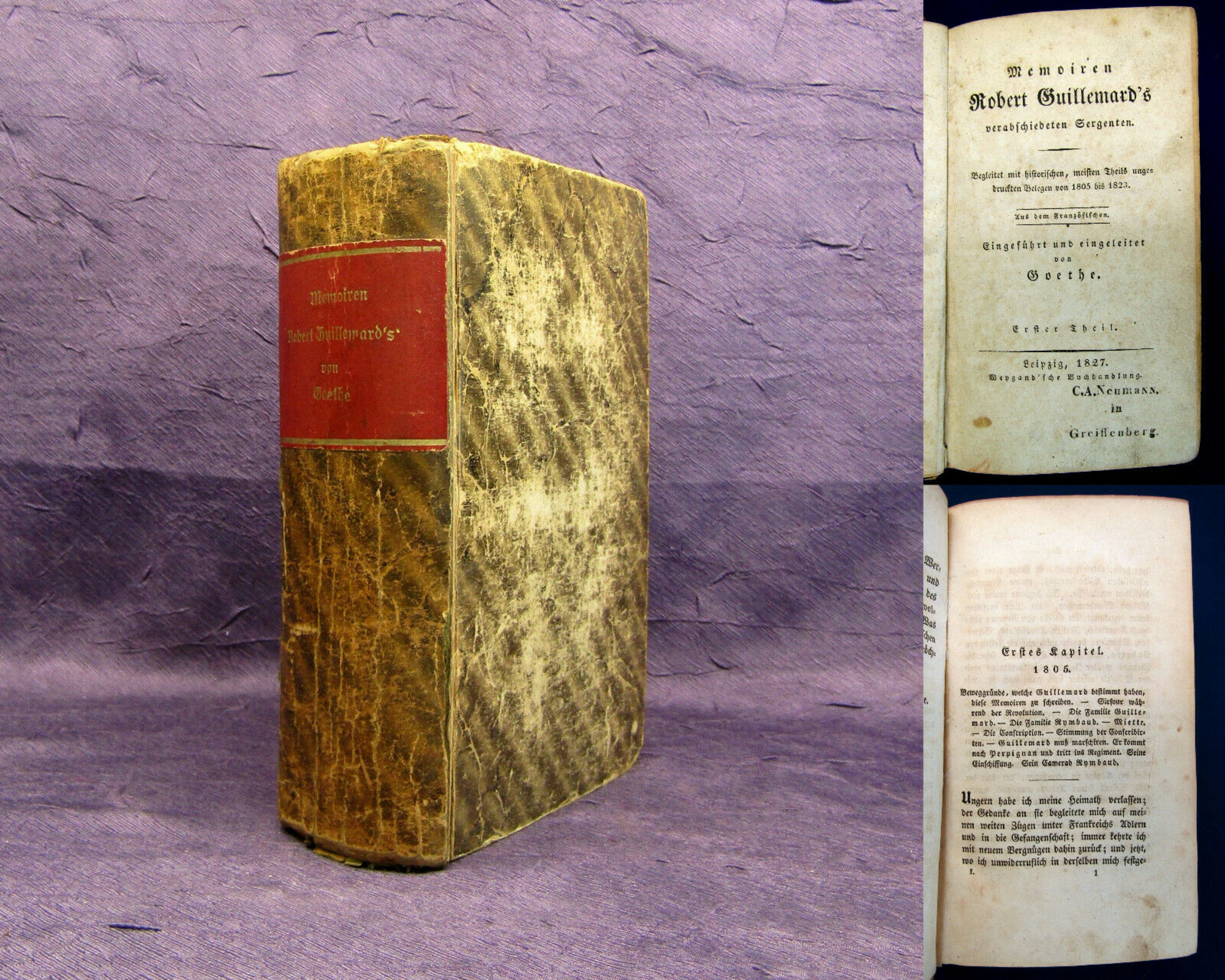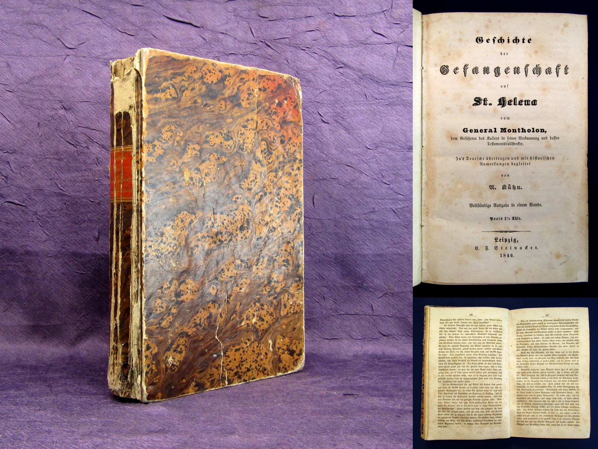 Antommarchi, Francois. Memoiren des Dr. F. Antommarchi, oder die lezten Augenblicke Napoleons. Erster und Zweyter Band in einem Buch. Stuttgart u. Tübingen, Cotte, 1825. 8°, 368 (von 370), 2 Bll (ohne die 2 Bll.). 211 S. späterer Pp. Fromm I,505 f; Kircheisen Bibliogr. 4143. - Erste deutsche Ausgabe der Erinnerungen des korsischen Mediziners A. (1780-1838), des letzten Leibarztes des Diktators. Gilt bis heute als erstes Quellenwerk der Napoleon-Biographik für die Jahre 1819-1821. Einband etwas berieben und bestoßen, Bindung teils leicht gelockert. Papier stark gebräunt und fleckig, mit Wasserschaden, Stempel (Lino) auf Titel und letzten Bll., Es fehlen gesamt 3 Bll. zwischen 1. und 2. Band., Seite 79/80 im 2. Bd. mit Eckausriss dadurch leichter Textverlust. Unschöner Zustand aber als Arbeitsexemplar noch brauchbar. Bestell-Nr: 8-0-425..........120,00 € (inkl. MwSt. zzgl. Versand) | ![]() | |