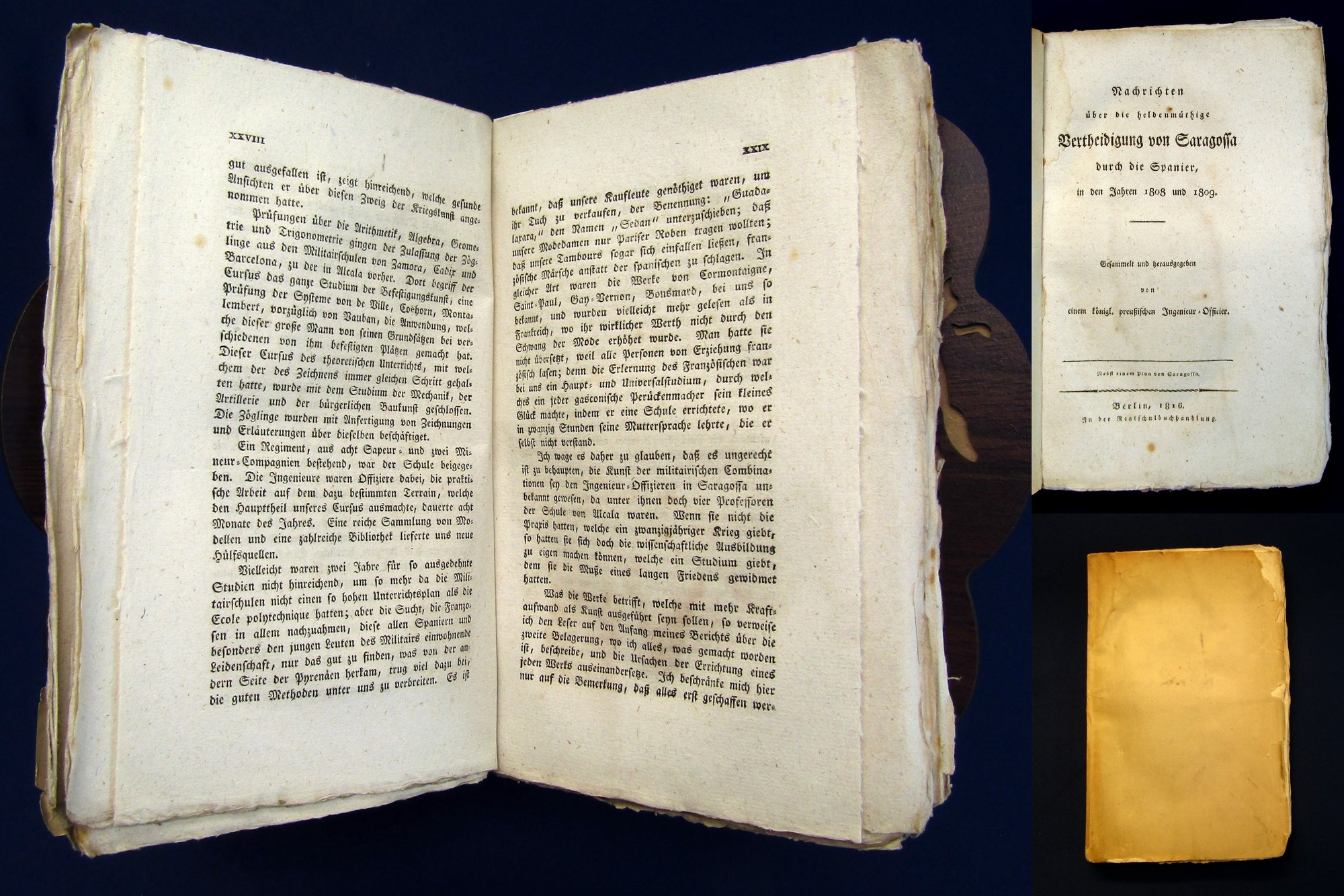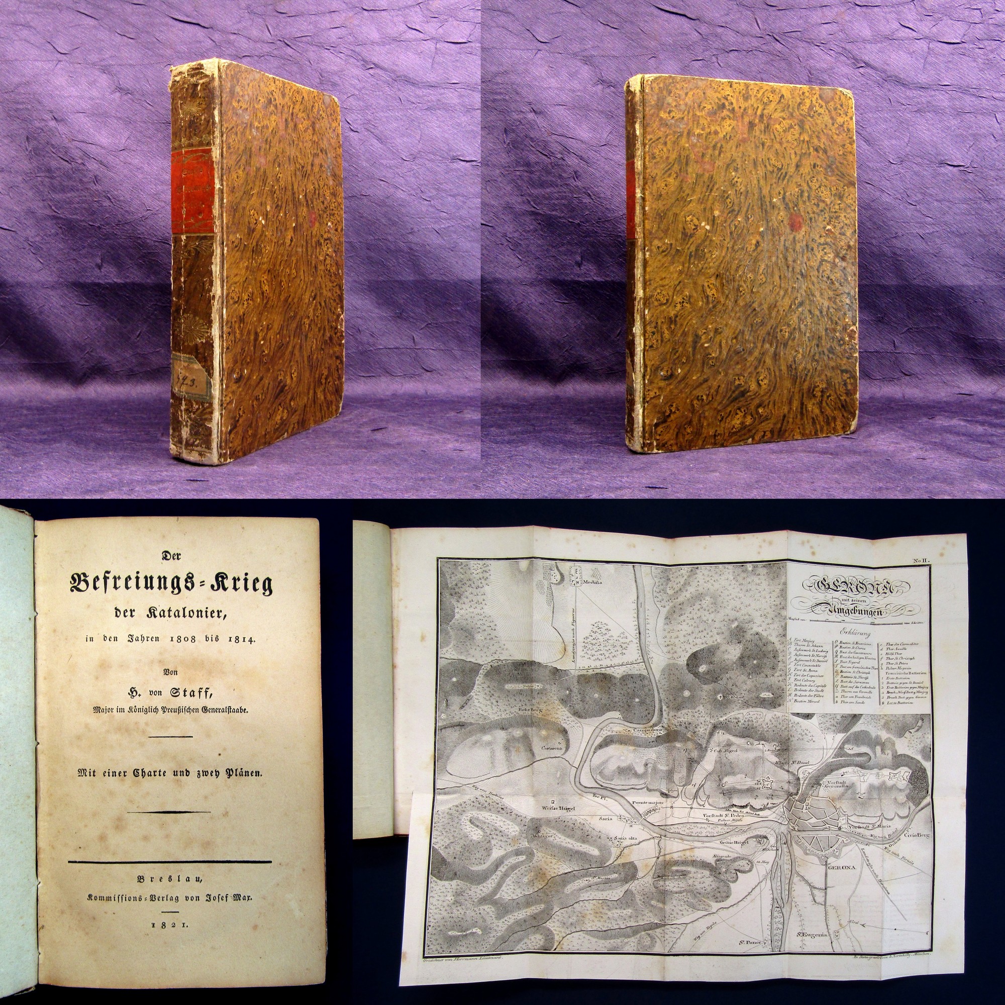Staff, Hermann von. Der Befreiungs-Krieg der Katalonier, in den Jahren 1808 bis 1814. Bresslau, Josef Max, 1821. 8°,mit 1 Karte (Karte fehlt) und zwei mehrfach gefaltenen Plänen 5 Bll., XVIII, 359 S. Pp. d. Z. Erste Ausgabe. Die die Pläne mit der Umgebung von Gerona bzw. der Belagerung von Tortosa. Einband berieben und bestoßen, mit kleinem Nummernschildchen auf Rücken, Papierbedingt gebräunt und stellenweise fleckig. Die gefaltete Karte fehlt. Gesamt noch gutes Exemplar dieser seltenen EA.. Bestell-Nr: 8-0-422..........verkauft | ![]() | |