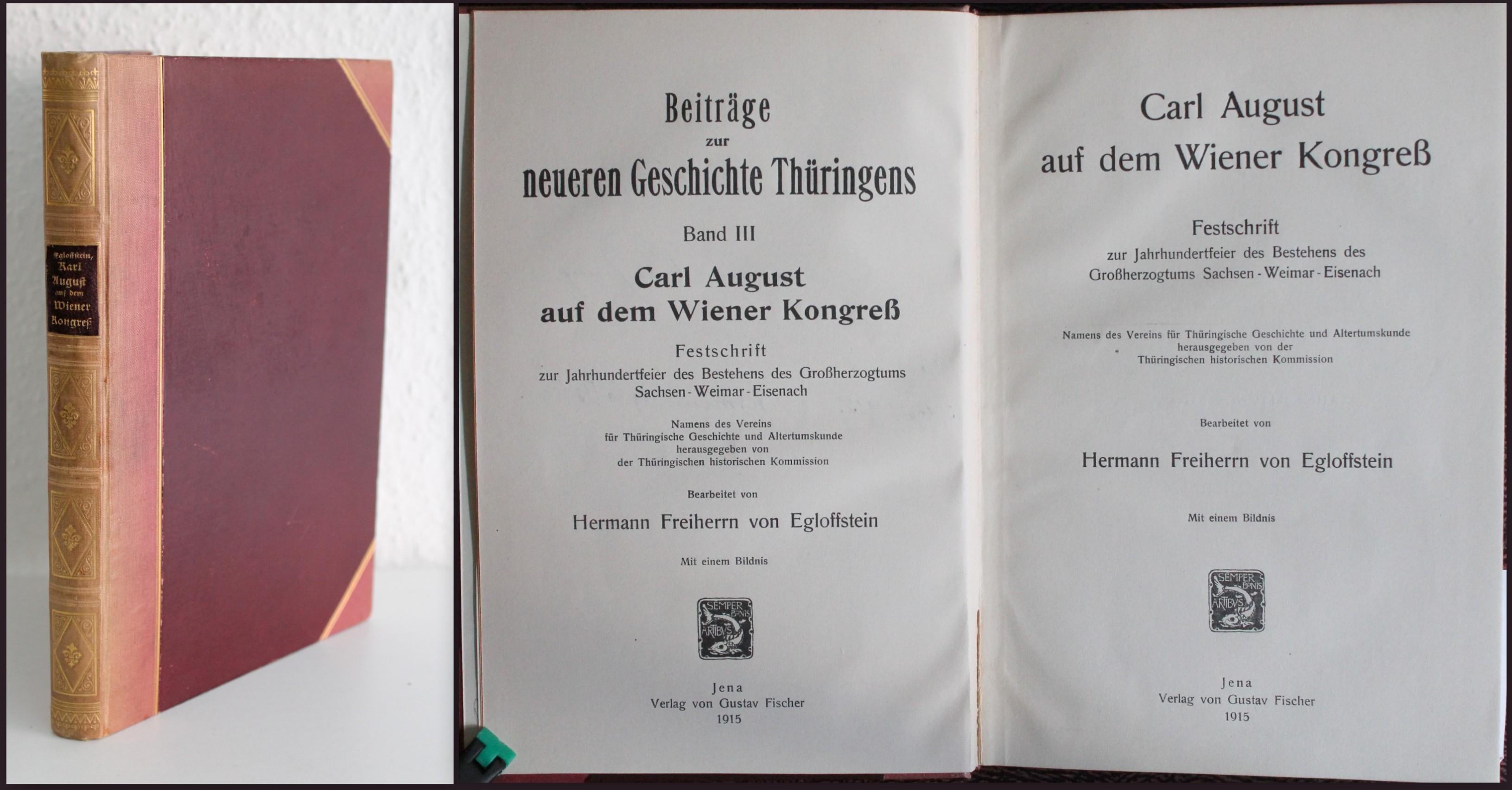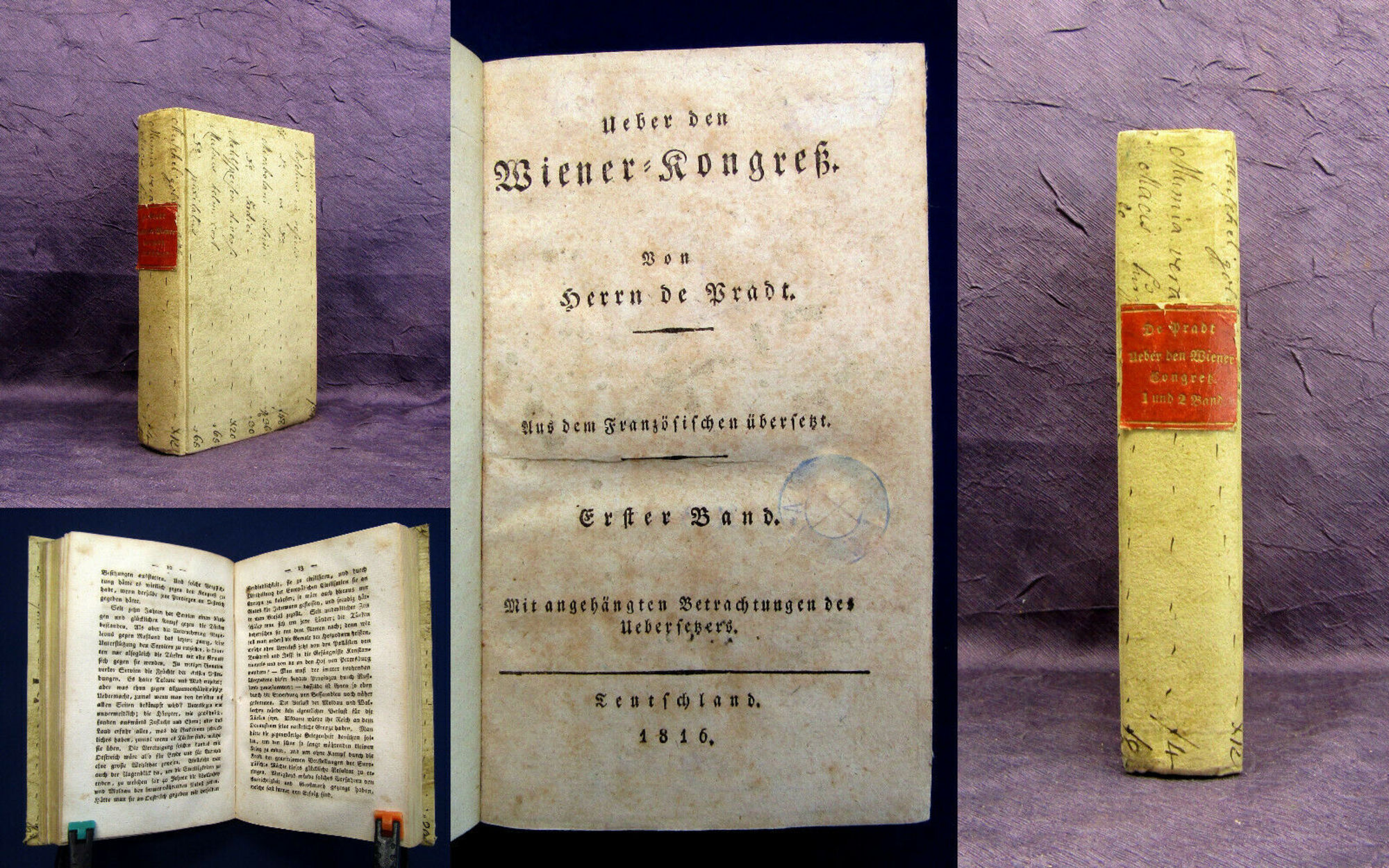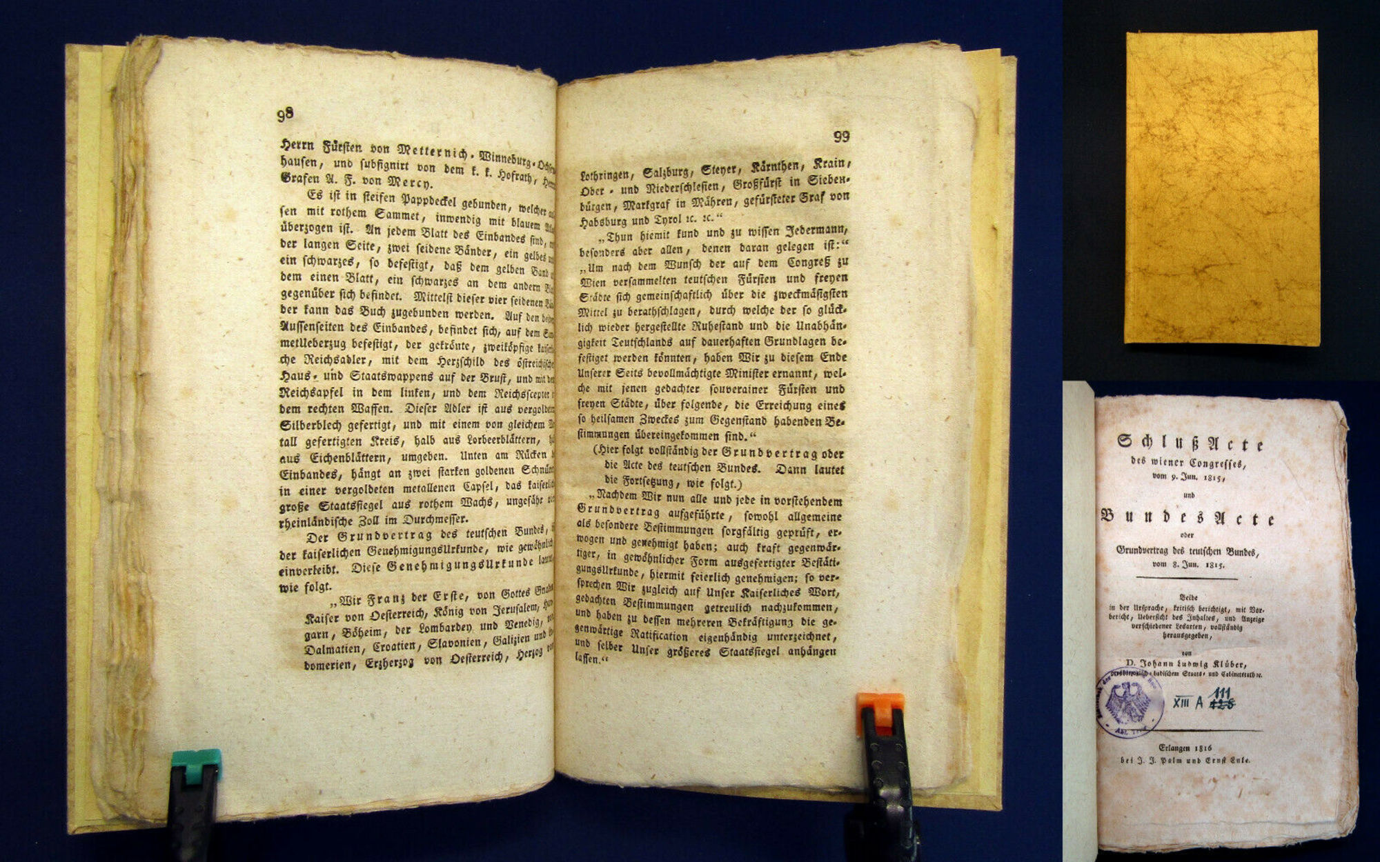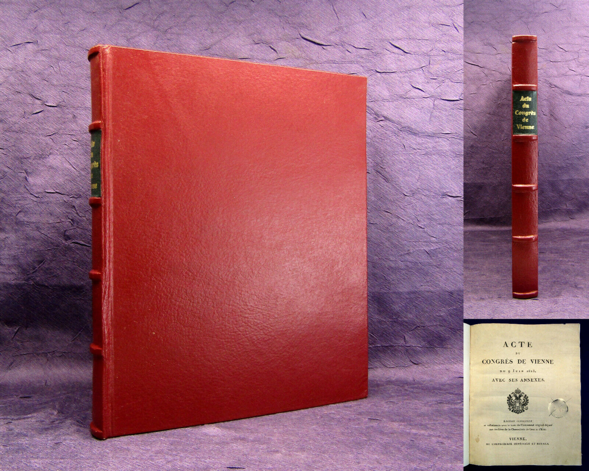 . Acte du Congrès de Vienne du 9 Juin 1815, avec ses annexes. Edition officielle et collationee evec le texte de l`instrument original déposé aux Archives de la Chancellerie de Cour et d`Etat.. Vienne, De L, 1815. 4°, 4 Bll, 334 S. 1 Bl, neuer Ledereinband im Stile der Zeit. Erste Ausgabe der Akte des Wiener Kongresses vom 9. Juni 1815 mit ihren Anlagen. In Französischer Sprache. Ursprünglich aus der Großherzoglichen Bibliothek Neustrehlitz. Papierbedingt minimal gebräunt, teilweise leicht fleckig, Stempel auf Titel. Gesamt sehr schönes Exemplar.. Bestell-Nr: 8-0-442..........verkauft | ![]() | |