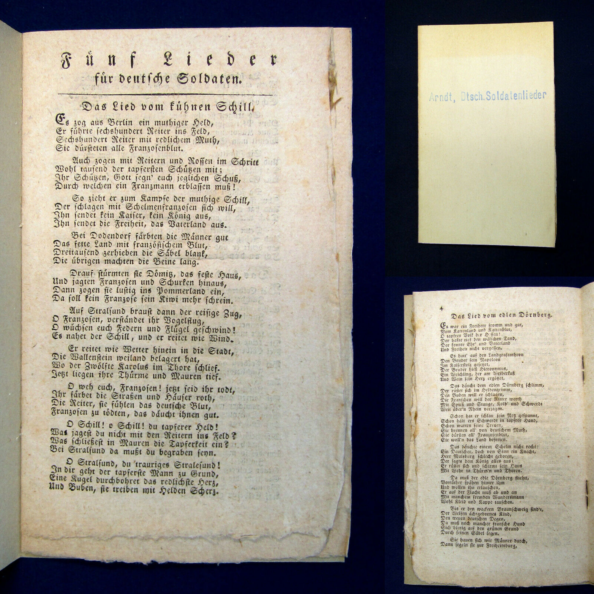 Arndt, Ernst Moritz. Fünf Lieder für deutsche Soldaten. o. O. [Berlin], o. V. [Reimer], o. J. [1813]. Kl.8°, 8 S., Orig.-Bosch mit neuerem Pappumschlag. Goed. VII, 824, 33. Borst 1165. Griesebach 364 - Als Flugblatt gegen Napoleon erschienen. Enthält neben dem "Lied vom kühnen Schill" auch das sehr populär gewordene "Des deutschen Veaterland" ("Was ist des deutschen Veaterland...") unverstümmelt mit 10 Strophen, deren sechste (gegen Fürstentrug und Kaiserraub) auch in Arndts späteren Gedichtsammlungen nicht mehr gedruckt wurde. Papierbedingt leicht gebräunt, 2 Kanten unbeschnitten. Gesamt schönes Exemplar. Bestell-Nr: 8-0-423..........verkauft | ![]() | |