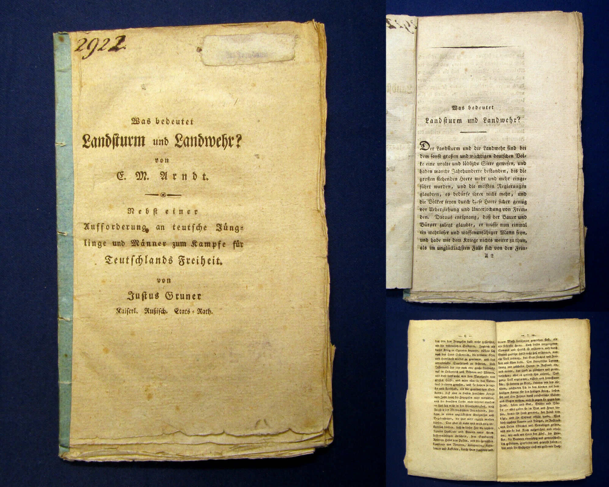 Arndt, Ernst Moritz und Justus Gruner. Was bedeutet Landsturm und Landwehr? von Ernst Mortz Arndt Nebst einer Aufforderung an teutsche Jünglinge und Männer zum Kampfe für Teutschlands Freiheit von Justus Gruner. o. O., o. V., o. J. [1813]. 8°, 32 S., Rücken Brosch. Seltene Flugschrift Arndt's und Gruners. Papier gebräunt und minimal fleckig, etwas knickspurig, handschriftliche alte Nummerierung auf vorderem Broschurdeckel, mit alt überklebten Stempel auf vorderem Broschurdeckel. Gesamt gutes Exemplar. Bestell-Nr: 8-0-424..........150,00 € (inkl. MwSt. zzgl. Versand) | ![]() | |