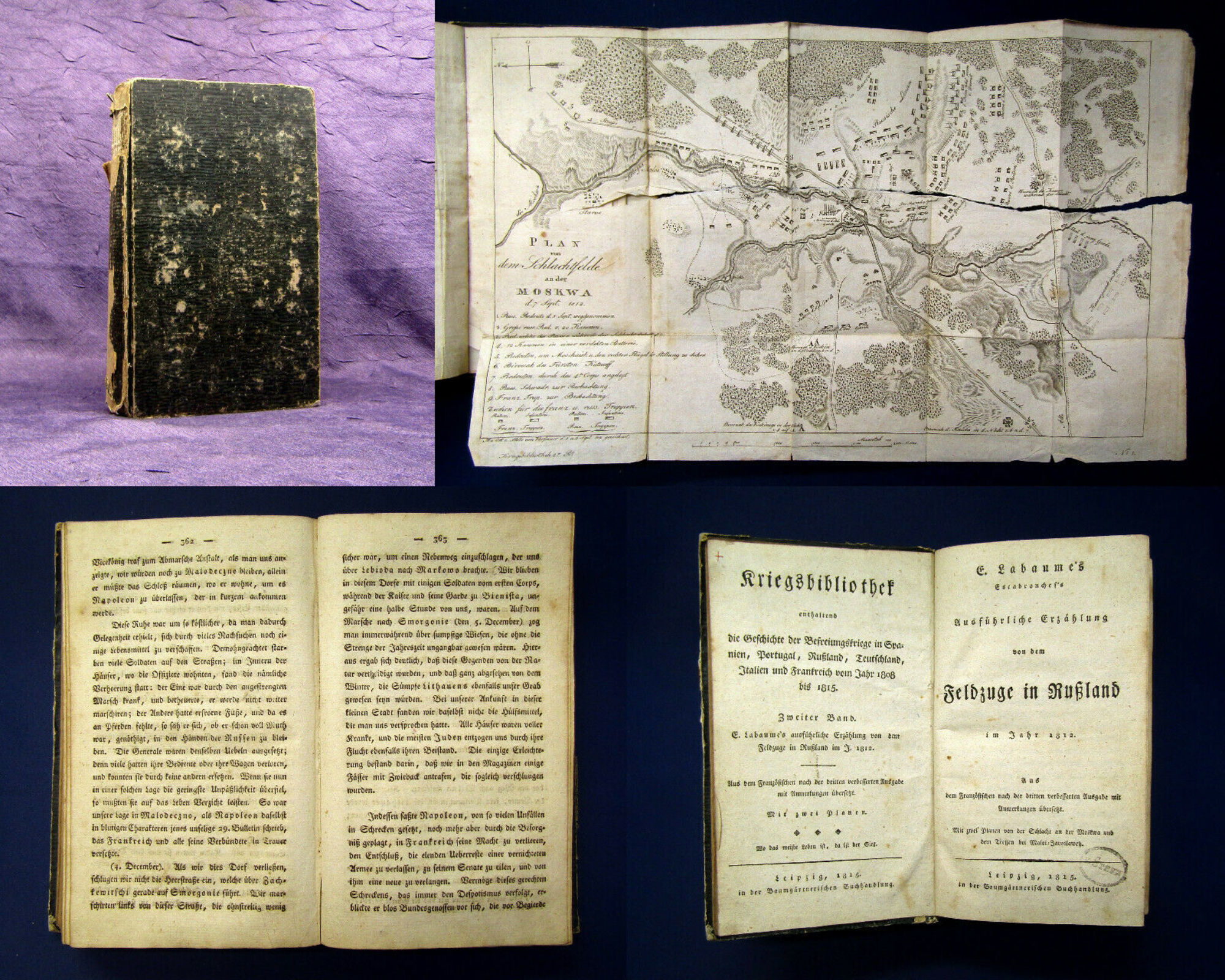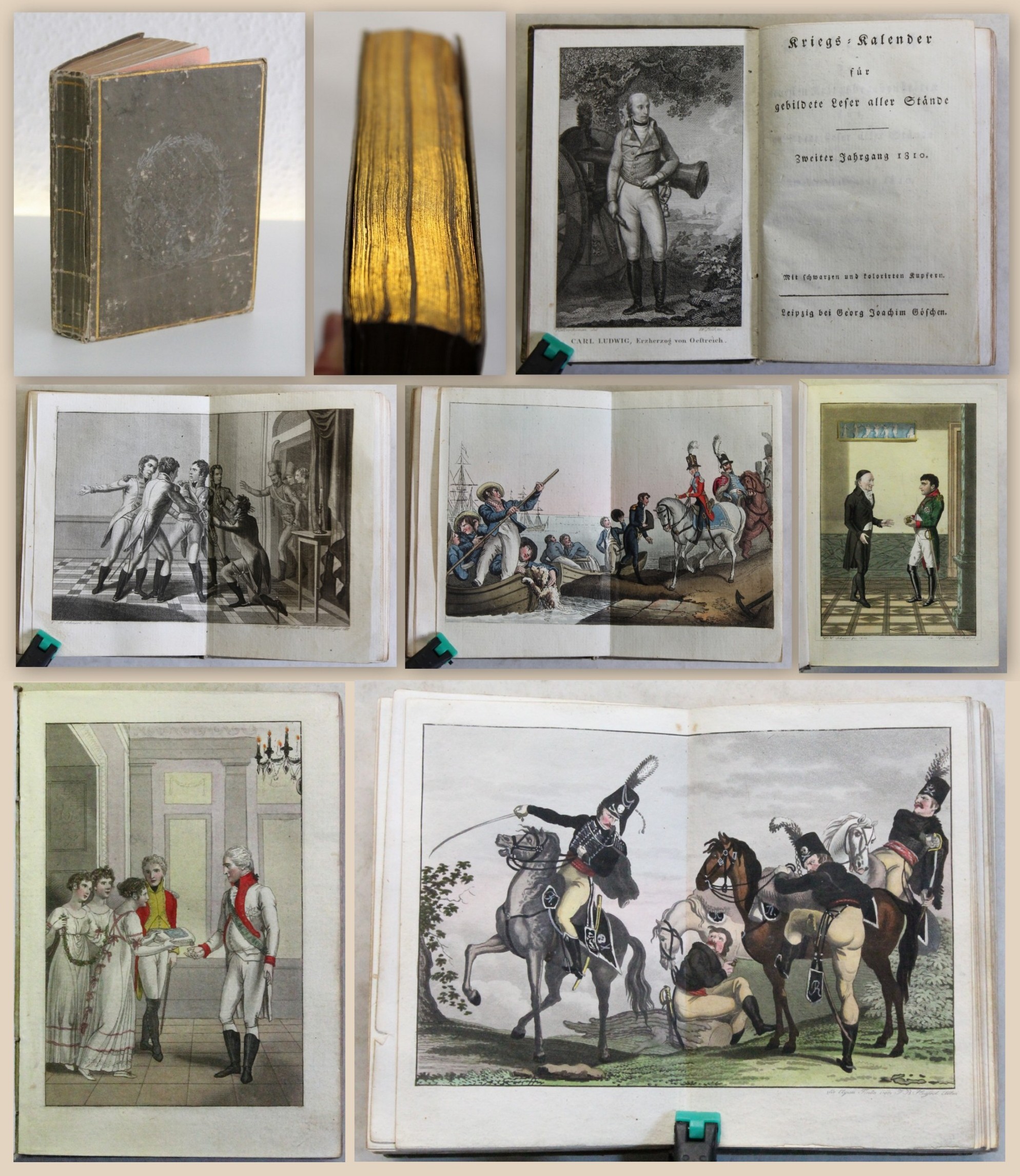 . Kriegs-Kalender für gebildete Leser aller Stände - Zweiter Jahrgang 1810. Leipzig, Georg Joachim Göschen, 1809. 12°, mit 16 (7 kolorierten), teils doppelblattgroßen, teils ausfaltbaren gestochenen Tafeln, XVIII, 434 S., 1 Bl., Ppbd. d. Zt. Erschien unter dem Nebentitel "Taschenbuch der neuesten Kriegsbegebenheiten für gebildete Leser aller Stände." Die Tafeln zeigen Szenen des Krieges, Herrscher etc. Einband berieben und etwas bestossen, Block etwas verzogen. Papier sauber, sehr vereinzelt gering fleckig, die Tafeln schön alt koloriert. Gutes Exemplar. Bestell-Nr: 8-3-193..........verkauft | ![]() | |
