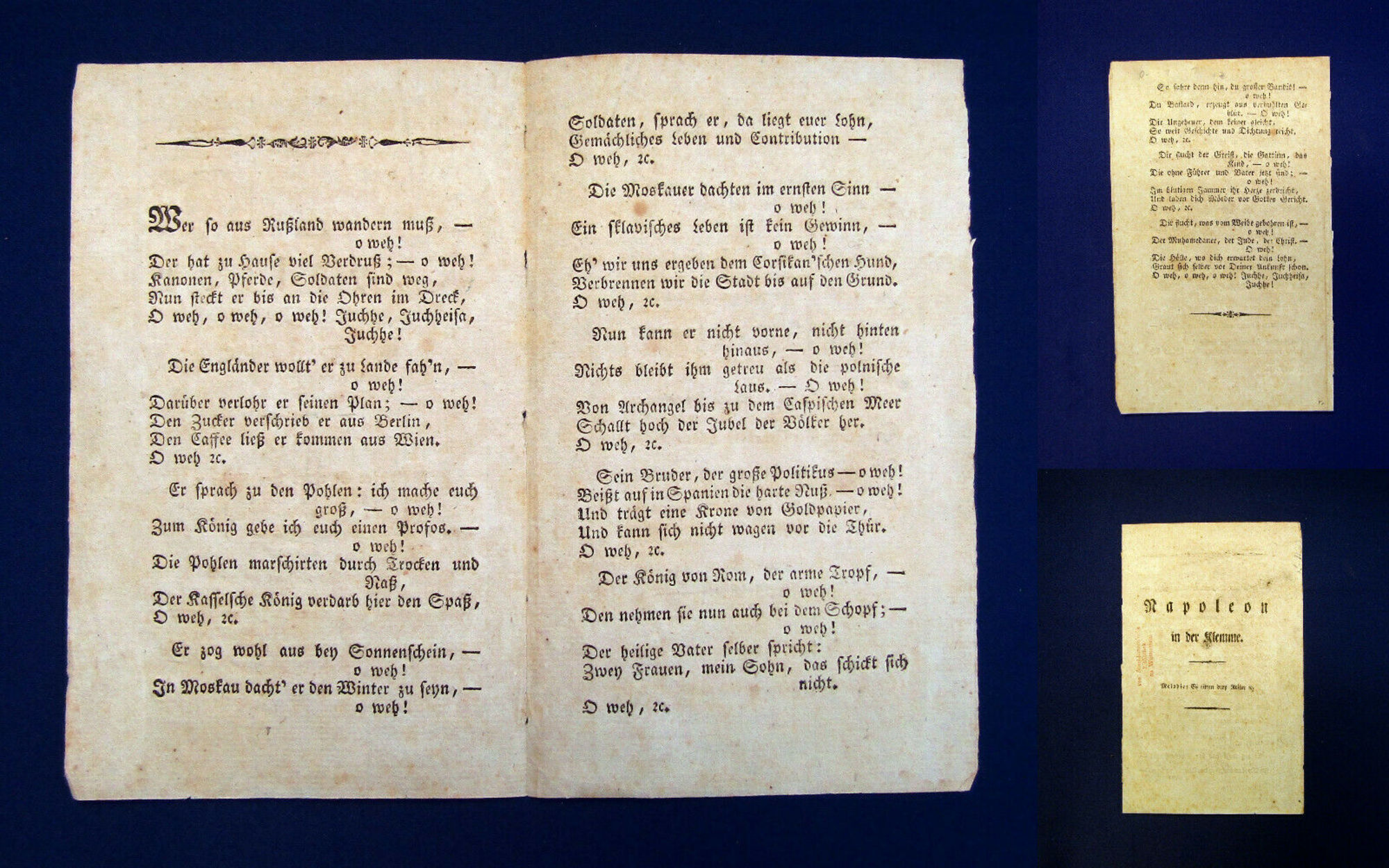 Anonym. Napoleon in der Klemme. Melodie: Es ritten drey Reiter etc. o.O., o. V., o.J. [um 1813]. Kl., 2 Bll. ungebundenes Faltblatt. Seltenes Schmählied über Napoleon und seine Taten, ursprünglich aus der Bibliothek Stockhausen zu Wülmersen. Papier minimal gebräunt und ein wenig fleckig. Titel mit schwachem altem Stempel. Gesamt schönes Exemplar.. Bestell-Nr: 8-0-431..........verkauft | ![]() | |