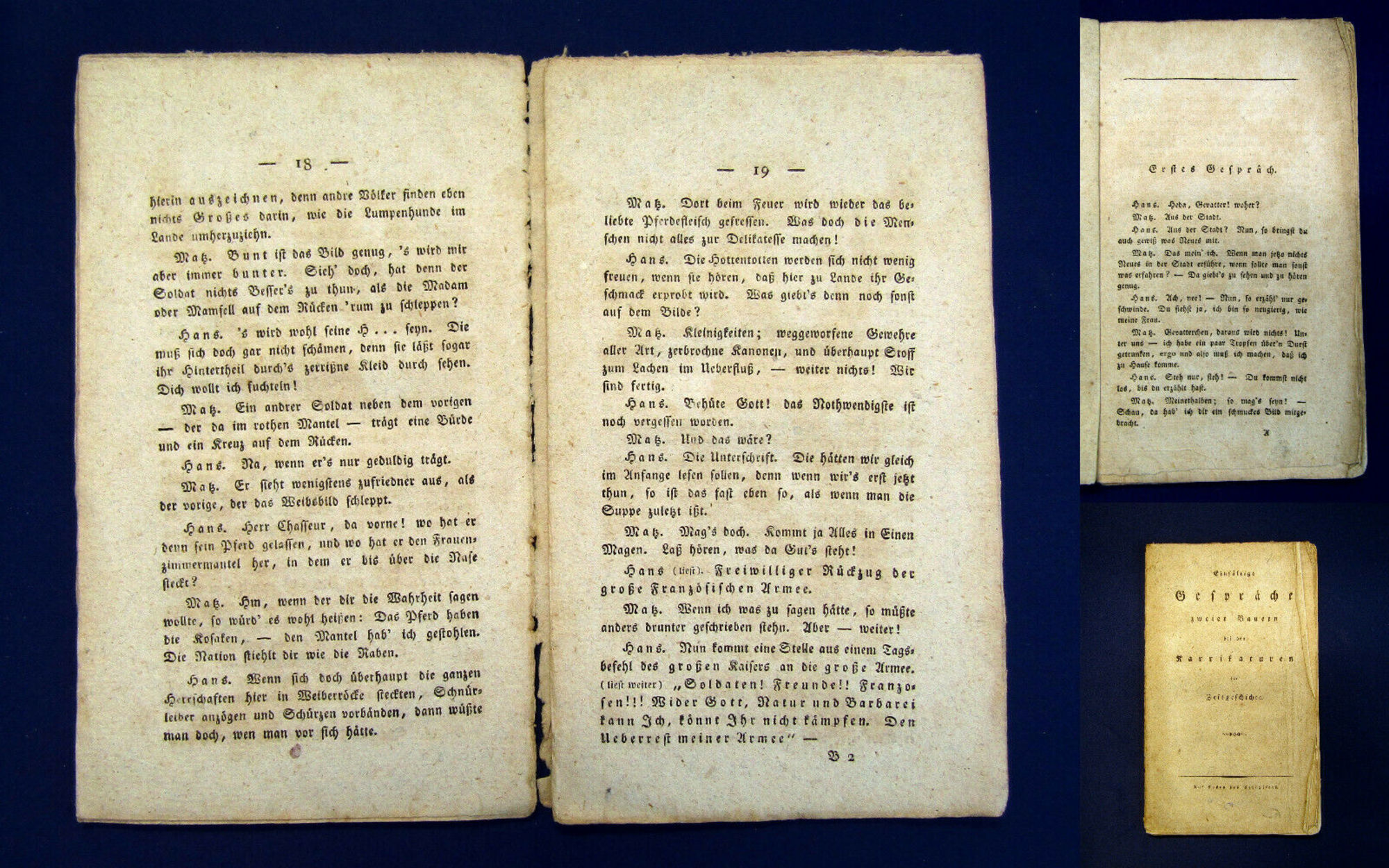 Anonym. Einfältige Gespräche zweier Bauern bei den Karrikaturen zur Zeitgeschichte. o.O. (Leipzig), o. V. "Auf Kosten des Verfassers" (Joachim), o.J. [1814]. 8°, 31 S. Broschur ungebunden. vgl. hbz NRW - Seltene Flugschrift aus der Zeit der Befreiungskriege. Exemplar aus der Sammlung Dr. Gottfried Doehler (1863-1943) war ein deutscher Germanist und Schriftsteller. Papier etwas angeschmutz, minimal gebräunt und schwach fleckig, Titelblatt knickspurig und verso mit altem Stempel "Sammlung Dr. Gottfried Doehler" Gesamt gute Exemplar. Bestell-Nr: 8-0-432..........verkauft | ![]() | |