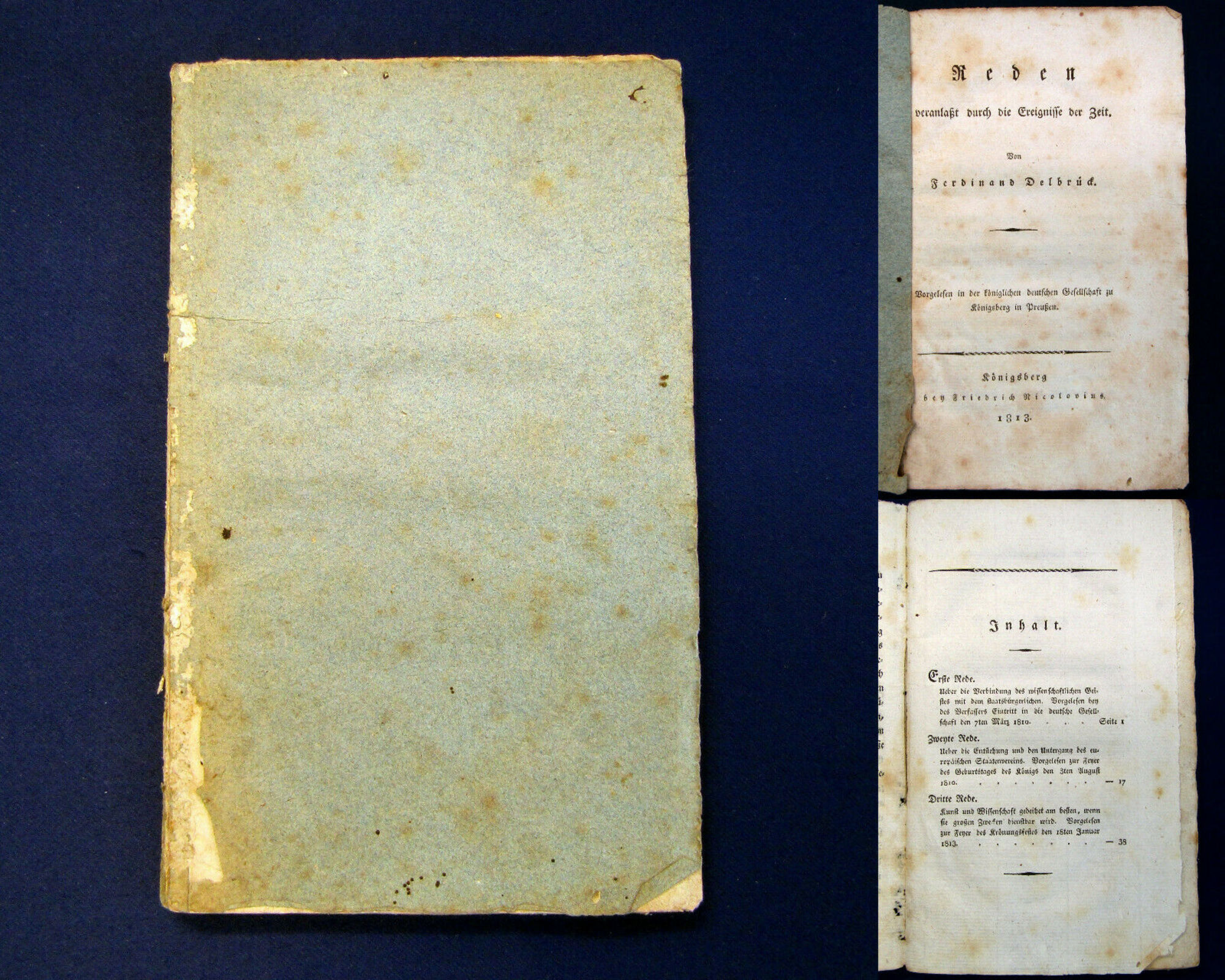 Anonym (Müller, Johann Ernst Friedrich Wilhelm). Ein deutsches Wort zu deutschen Bürgern gesprochen. Leipzig, Joachim, o.J. [1813]. 8°, Titel, 14 S. OBrosch. Einzige Ausgabe. Papierbedingt gebräunt und minimal fleckig. Broschur etwas knitterig. Gesamt gutes Exemplar. Bestell-Nr: 8-0-452..........verkauft | ||