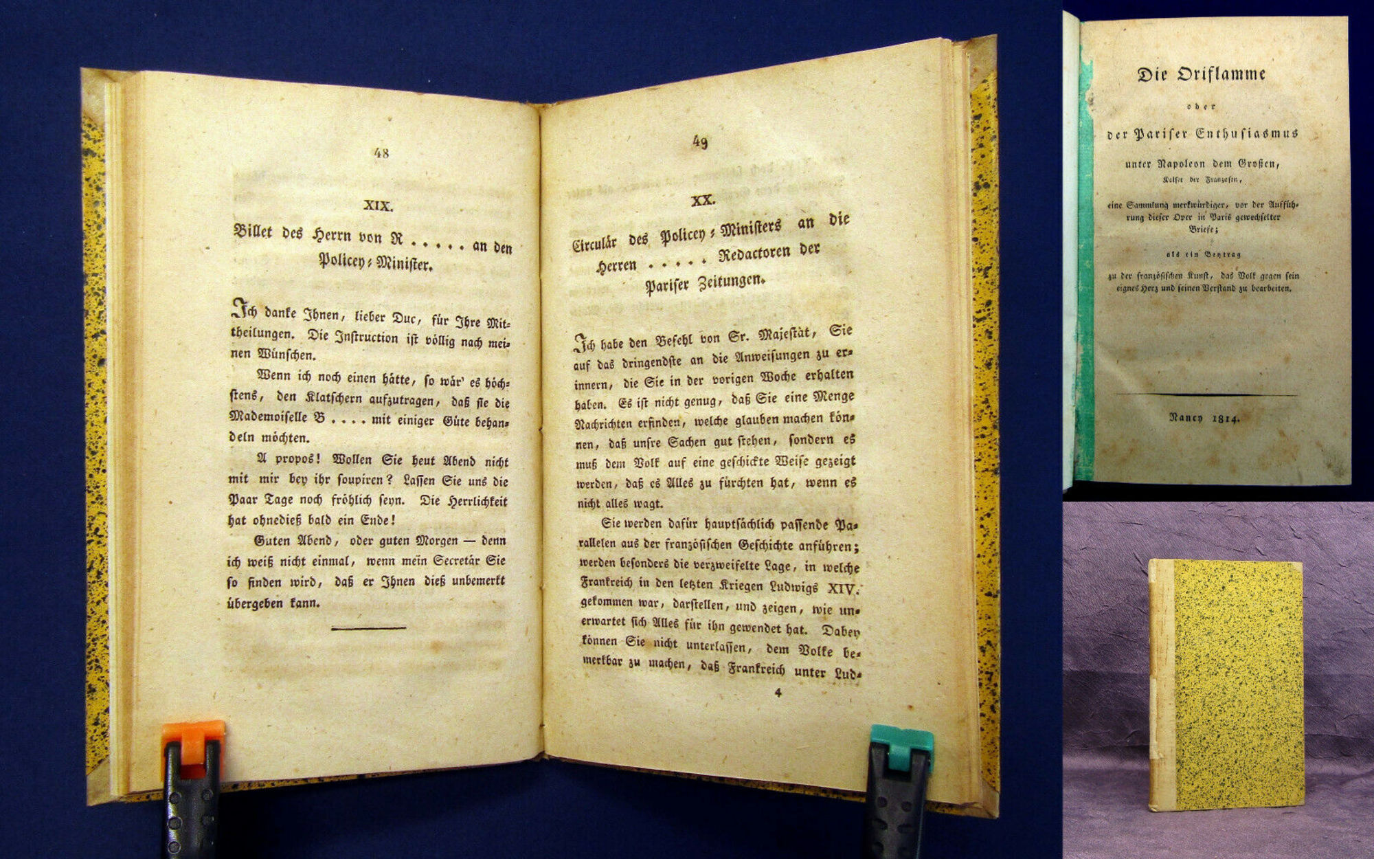 Anonym. Fiktive Flugschrift - Napoleons Aufenthalt in der andern Welt. Berlin, o. V., o. J. um 1810. 8°, 8 S., Broschur ungebunden. Seltene Flugschrift beschreibt: Einen alten Priester aus der Normandie, der sich einen neuen französischen Kalender kauft und am 15 August statt Himmelfahrt Maria den Namen Sankt Napoleon erblickt. Der Priester sucht den heiligen St. Napoleon im Himmel, in der Hölle und im Fegefeuer, leider vergebens. Schließlich findet ihn der Priester in der Wüste, da er nirgends eintreten konnte. Napoleon weist dem Priester auf den rechten Weg, wo durch der Priester in den Himmel kommt. Papier minimal gebräunt leicht fleckig und etwas knickspurig. gesamt gutes Exemplar.. Bestell-Nr: 8-0-394..........300,00 € (inkl. MwSt. zzgl. Versand) | ||