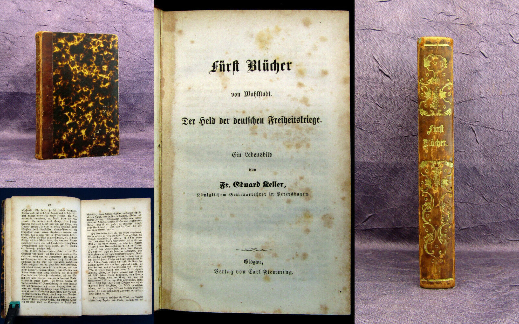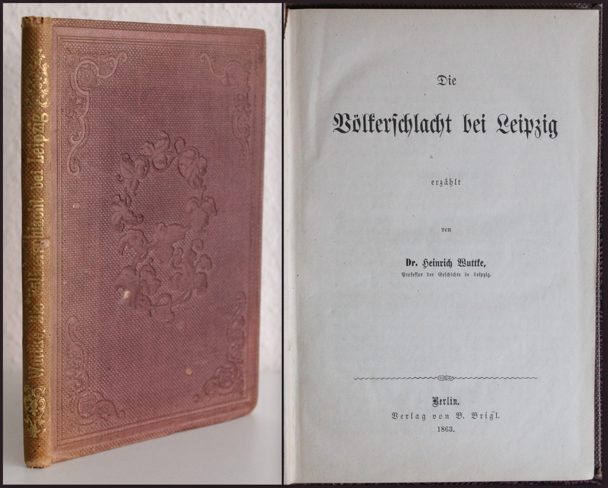 Wuttke, Dr. Heinrich. Die Völkerschlacht bei Leipzig. Berlin, B. Brigl, 1863. gr. 8°, mit 1 ausfaltbaren Karte, S. 3-228, Ln. d. Zt. Erste Ausgabe. Einband etwas berieben oder bestossen, Kapitale etwas ausgefranst, vorderer Deckel lichtrandig und mit 4 kleinen Fleckchen, Rücken aufgehellt. Papierbedingt durchgehend leicht gebräunt sonst sauber. Es fehlt der Vorsatz und der itpaginierte Vortitel, somit beginnt das Werk mit dem Titel (S.3). Bestell-Nr: 8-1-115..........verkauft | ![]() | |