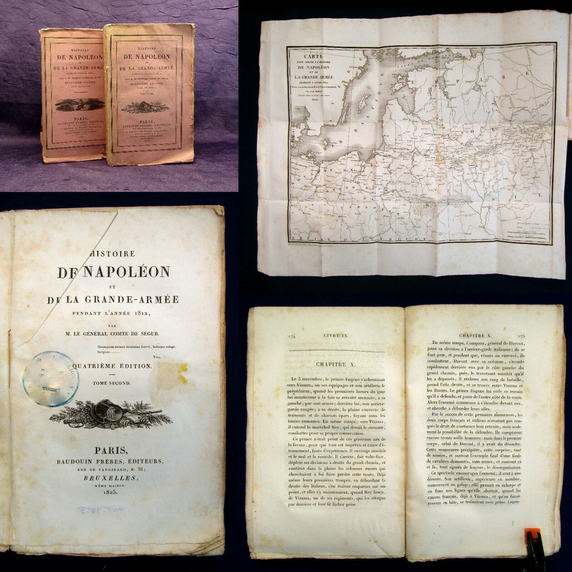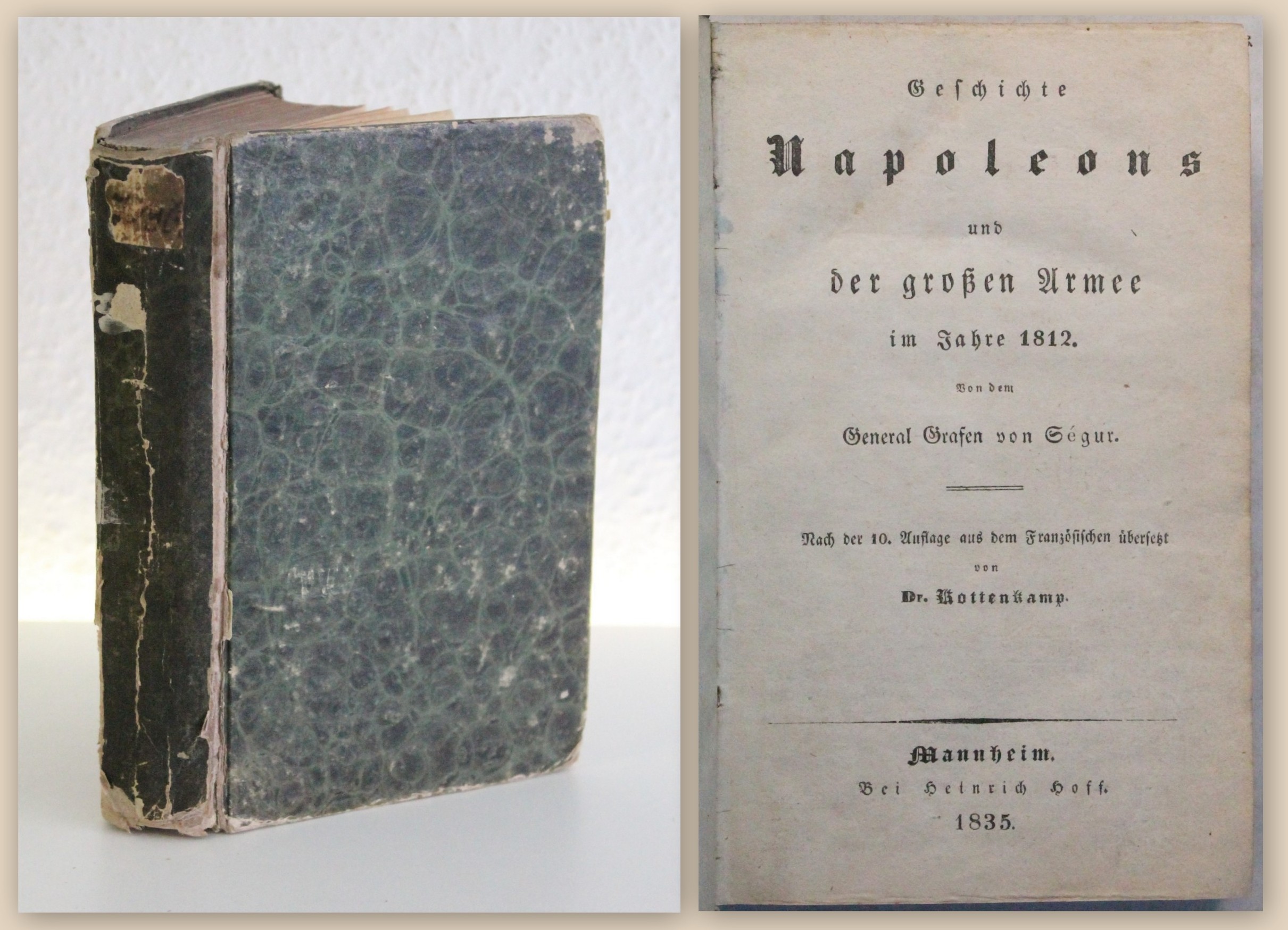 Segur, Comte de. Histoire De Napoleon et De La Grande-Armee Pendant L'annee 1812. Paris, Baudouin Freres, 1825. 8°, mit einer mehrfach gefalt., gest. Karte, 2 Bll.,435; 2 Bll, 477 S.,1 Bl., OBrosch. Vierte französische Ausgabe. Broschurdeckel knickspurig, etwas randrissig leicht fleckig, Broschur außen mit kleineren Fehlstellen, papierbedingt minimal gebräunt und etwas fleckig, Stempel aus Titel. Gesamt gutes Exemplar. Bestell-Nr: 8-0-471..........verkauft | ![]() | |