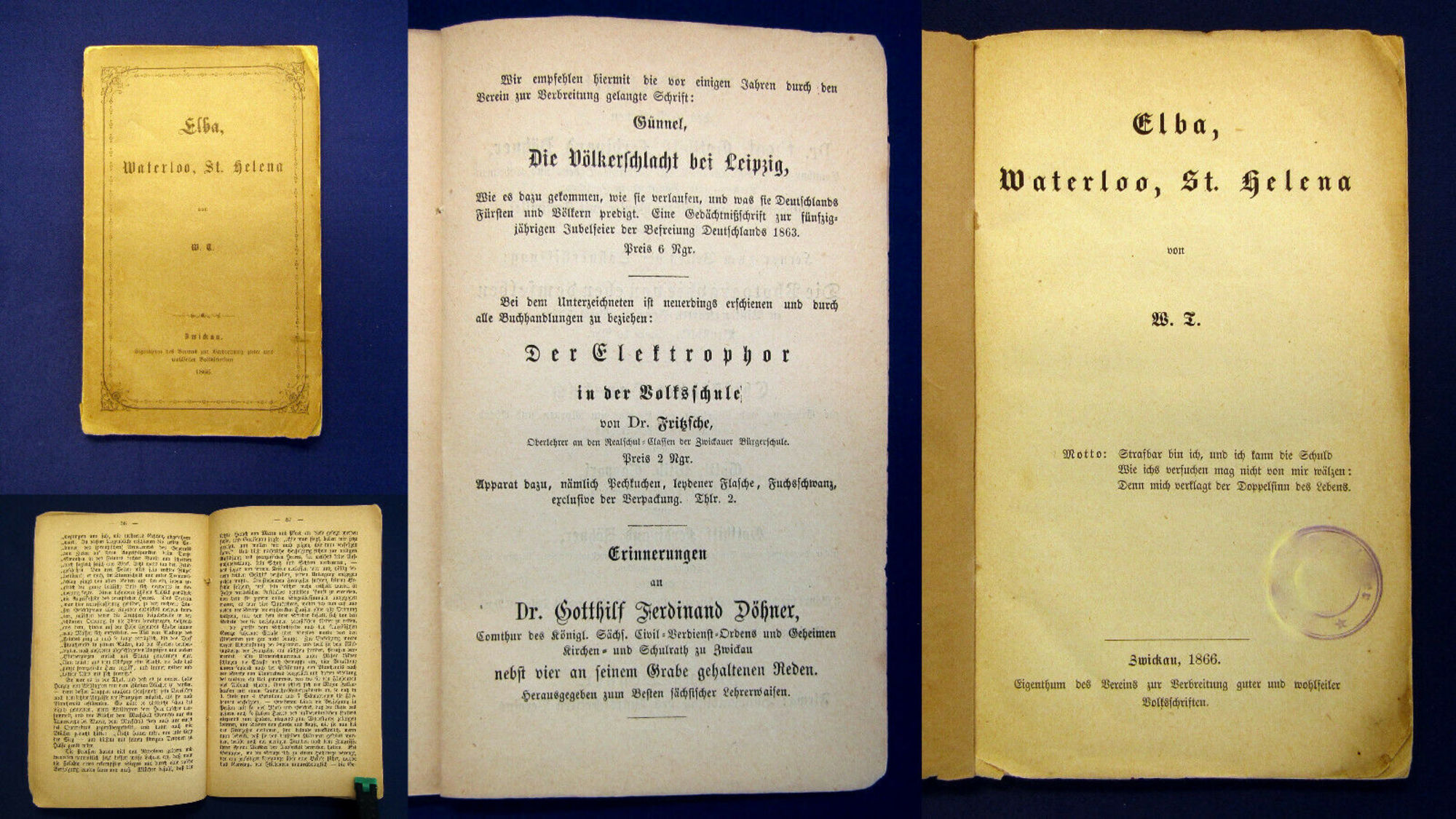 Anonym [W.T. - Wanderer, Treumund ?]. Elba, Waterloo, St. Helena von W.T. [...] . Zwickau, Verein zur Verbreitung guter u. wohlfeiler Volksschriften, 1866. 8°, 86 S., 1 Bl., OBrosch. Einzige Ausgabe dieser seltenen Kleinschrift. - Einband (Broschur) berieben, bestoßen, etwas knickspurig und mit kleineren Fehlstellen. Papier altersbedingt gebräunt, etwas eselsohrig. Bestell-Nr: 8-0-474..........95,00 € (inkl. MwSt. zzgl. Versand) | ![]() | |