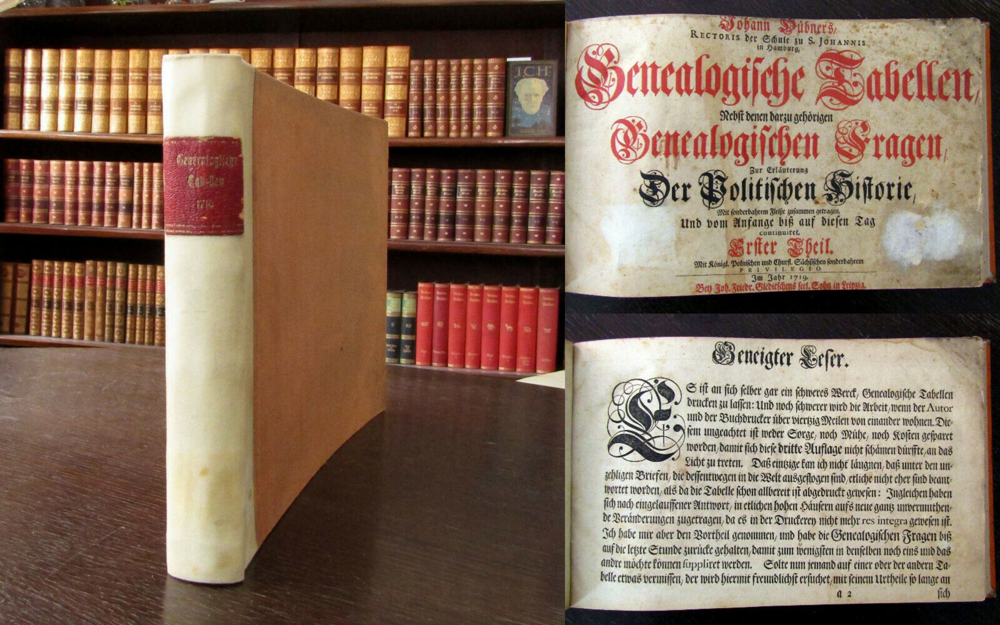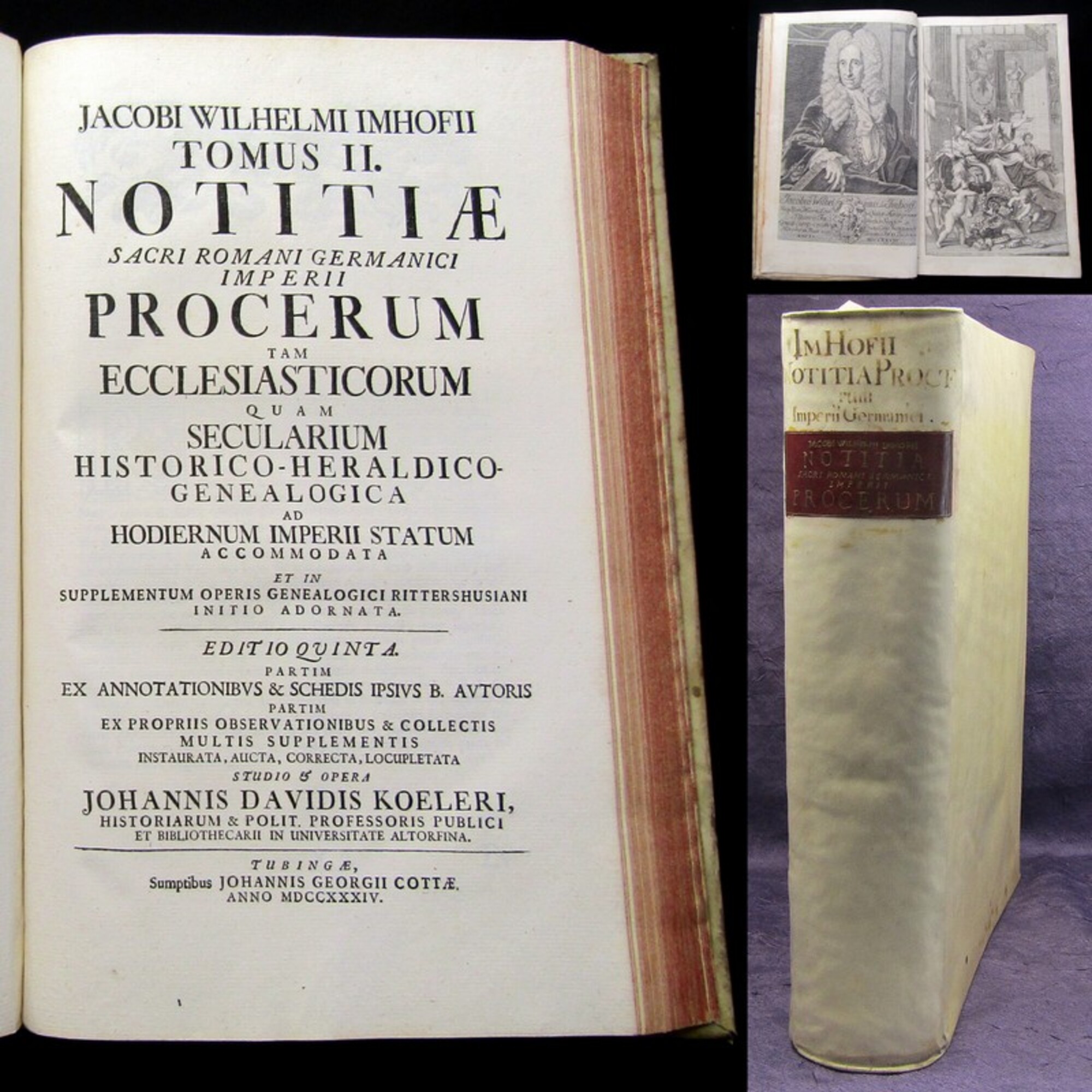 Birken (Bircken), Sigm.v.,. Königreich- auch Chur- und Fürstlich- Sächsischer Helden-Saal (...) samt dessen Genealogien, Wapen und Bildnissen (...). Nürnberg, Johann Adam Stein, 1755. 8°, mit gestochen Titel, 71 Kupfertafeln, 21 Stammtafeln, 11 nn Bll., 324 S., 496 S., 15 nn Bll., Ldr. d. Z. Mit 11 Wappen- und 60 Porträtkupfern. Reich illustriertes Werk zur Geschichte Sachsens. Einband berieben und bestoßen, minimale Einrisse in den Gelenken im Bereich der Kapitale, Stempel auf fliegendem Vorsatz und hinterem Spiegel, Papier sauber. Gesamt schönes Exemplar.. Bestell-Nr: 8-1-332..........verkauft | ||