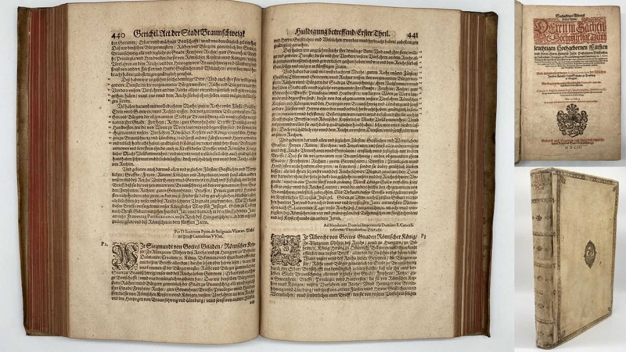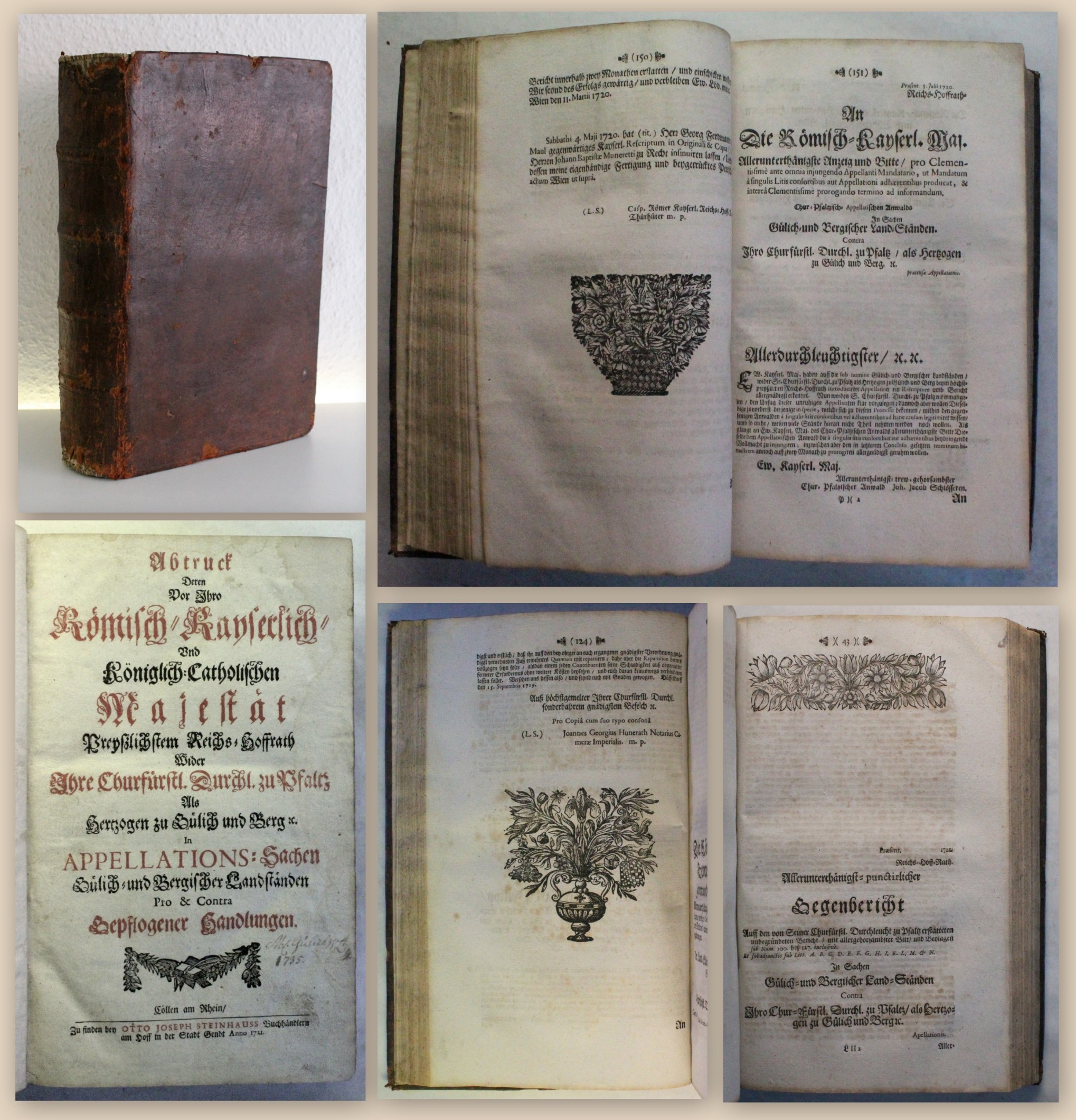 . Abtruck deren vor Ihro Römisch-Kayserlich- und Königlich-Catholischen Majestät Preyszlichstem Reichs-Hoffrath Wider Ihre Churfürstl. Durchl. zu Pfaltz Als Hertzogen zu Gülich und Berg u. In Appelations-Sachen Gülich- und Bergischer Landständen Pro und Contra Gepflogener Handlungen. 4 Tle. in 1 Bd. Köln, Otto Joseph Steinhaus, 1721. kl. Folio, 1 Bl., 152 (st. 156) S.; 152 S.; 348 S.; 98 S., Ldr. d. Zt. Appellation der Jülich-Bergischen Landstände gegen eine vom Kurfürsten erlassene Steuer. Einband berieben und bestossen. Kapitale mit kleinen Fehlstellen. Papier teils leicht wasserrandig, Vorsatz mit privatem Besitzstempel. Titel und Vorsatz mit altem hs. Beitzeintrag. Bestell-Nr: 8-0-50..........verkauft | ![]() | |