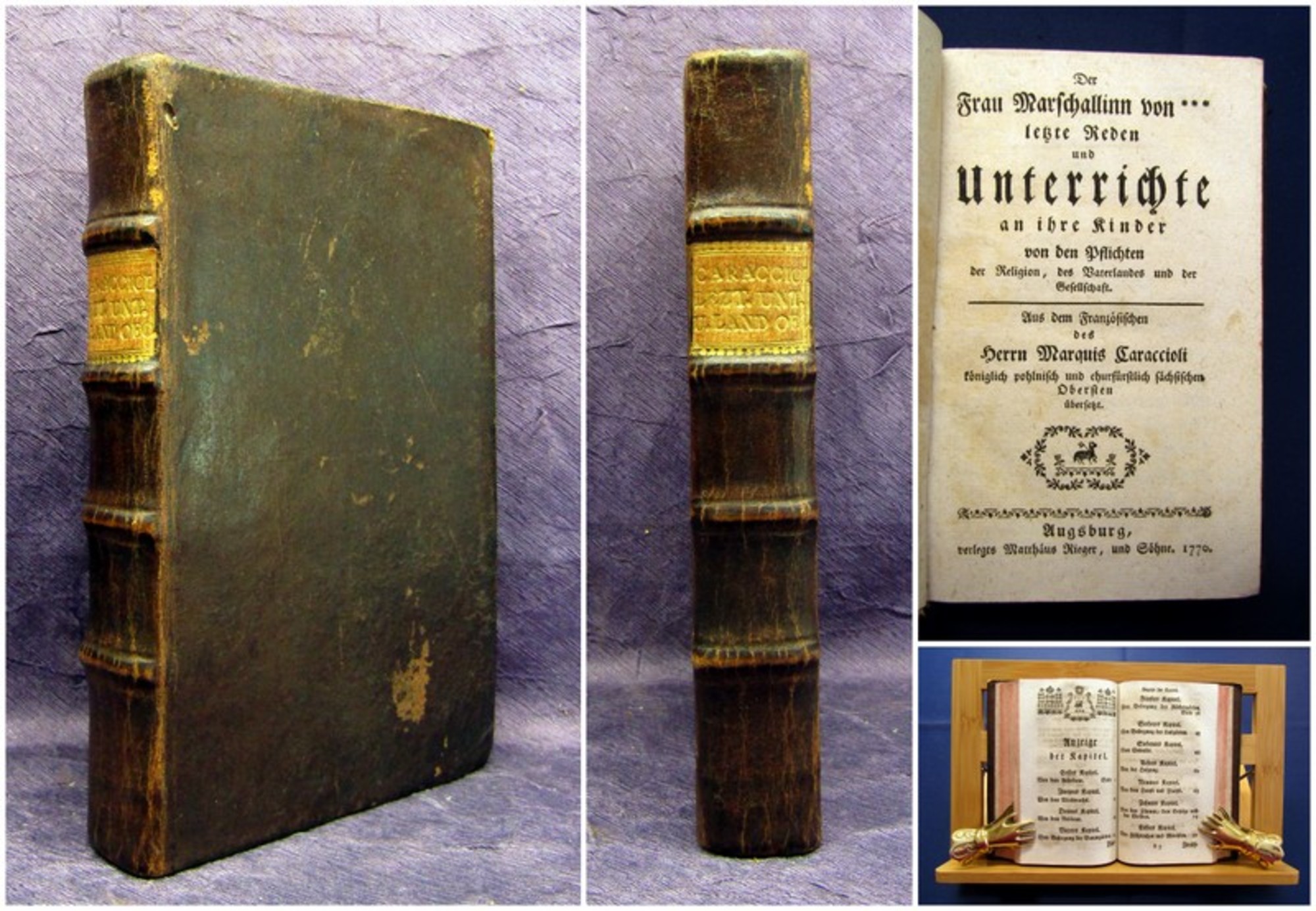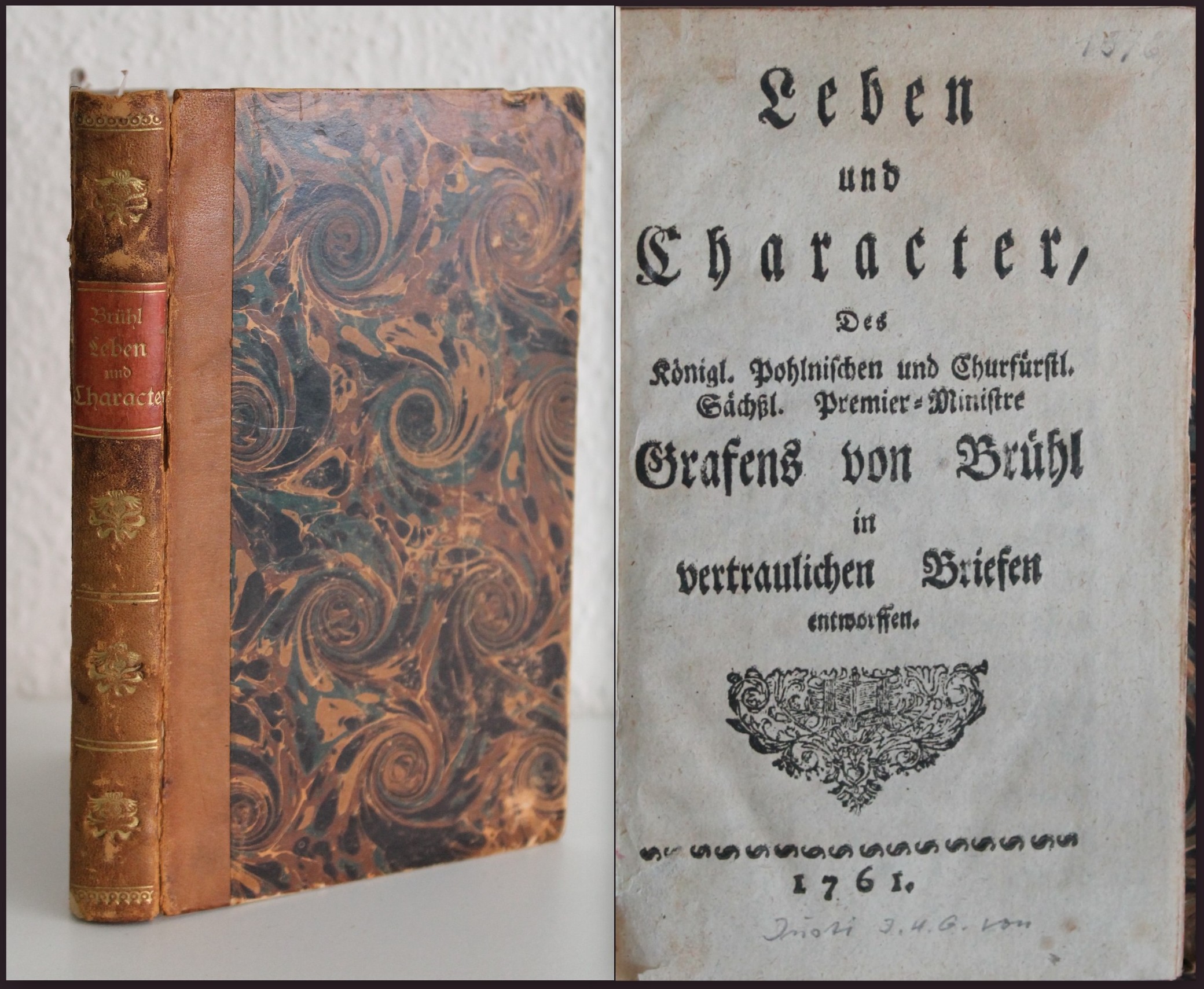 Anonym [Justi, Johann Heinrich Gottlob von]. Leben und Character, Des Königl. Pohlnischen und Churfürstl. Sächßi. Premier-Ministre Grafens von Brühl in vertraulichen Briefen entworffen. 2 Tle. in 1. o.O., o.V., 1761. 8°, 8 Bll., 160 S.; 144 S., spät. HLdr d. im Stil d. Zt. Holzmann-Bohatta III, 610 und VI, 6338 - Frensdorff 428 ff - Die ersten beiden, hier vorliegenden Bände erschienen noch zu Lebzeiten Brühls, welcher durch seine ruinöse und selbstbereichernde Politik bekannt wurde. Ein 3. Teil, ebenfalls anonym erschienen, wurde posthum (1763) durch J. F. Seyfart herausgegeben. Der erste Teil wurde kurz nach erscheinen beschlagnahmt und öffentlich verbrannt, die beiden folgenden Teile entzogen sich des bekannt Werdens. Einband mit floraler goldprägung und Rückenschild berieben und etwas bestossen, Gelenke geplatzt. Papier altersbedingt durchgehend minimal gebräunt. Vorderer weisser Vorsatz mit größerem Eckabschnitt. Insgesamt gutes Exemplar des seltenen Titels. Bestell-Nr: 8-0-87..........verkauft | ![]() | |