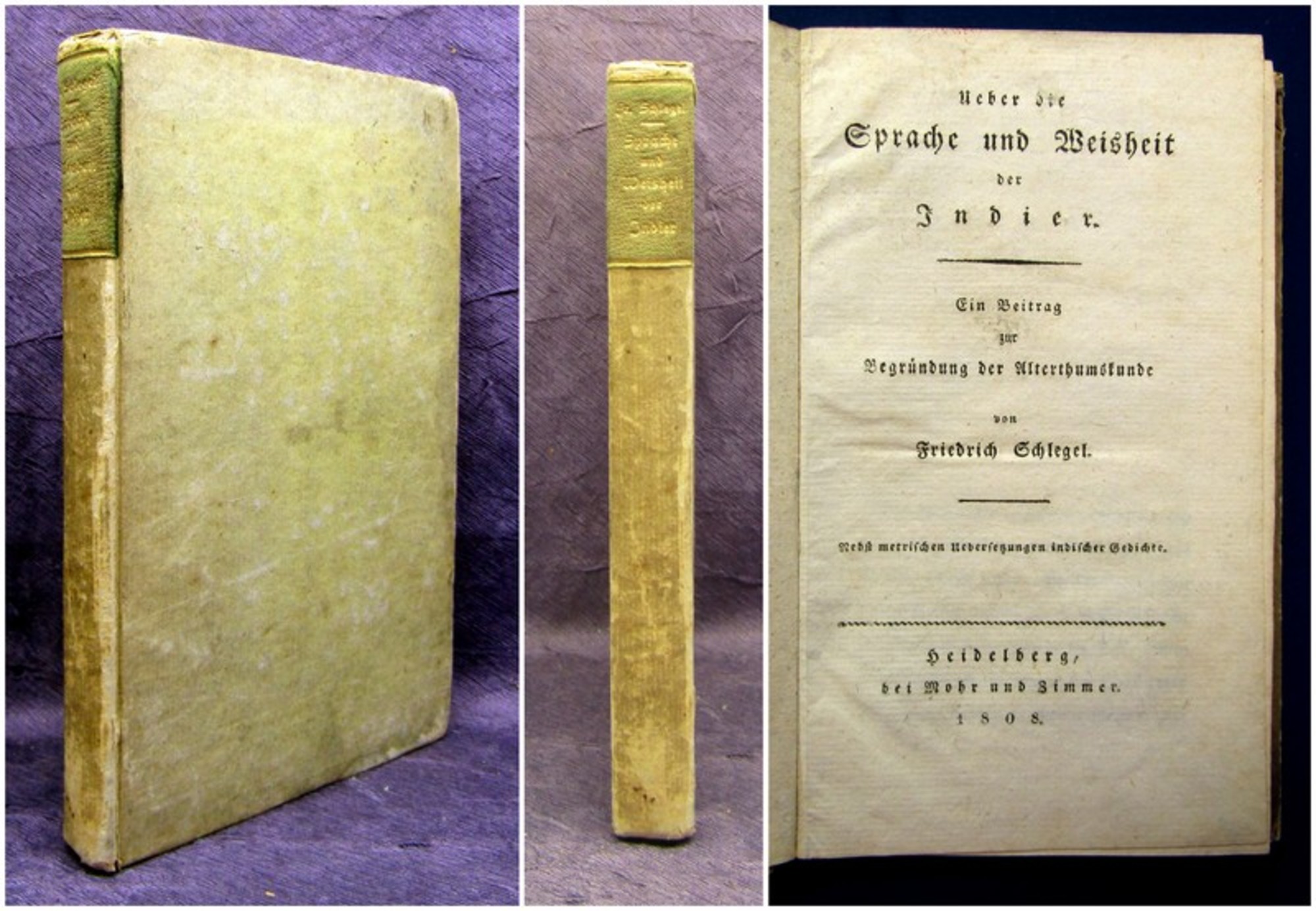 Schlegel, Friedrich. Über die Sprache und Weisheit der Indier. Ein Beitrag zur Begründung der Altertumskunde. Nebst metrischen Übersetzungen Indischer Geschichte - Erstausgabe. Heidelberg, Mohr und Zimmer, 1808. kl 8°(17x11cm), XVI, 324 S., Pp. d. Zt. Erstausgabe n. den Anfängen des 19. Jh. übte sich nahezu eine ganze Philologangeneration darin, Sprach- Genealogien aufzustellen, die beispielsweise die europäischen Sprachen in ihrer Abkunft von einer Ursprache darstellen. Die Entdeckung des Sanskrit machte es möglich, das Deutsche bis zu seinem mutmaßlichen Ursprung in Indien zu verfolgen. Die verbreitetste Vorstellung hierbei war, das ihre Wiege der Kultur in Indien zu finden sei. - bestoßen, ohne Einrisse, Papier leicht gebräunt . Bestell-Nr: 8-0-512..........verkauft | ![]() | |