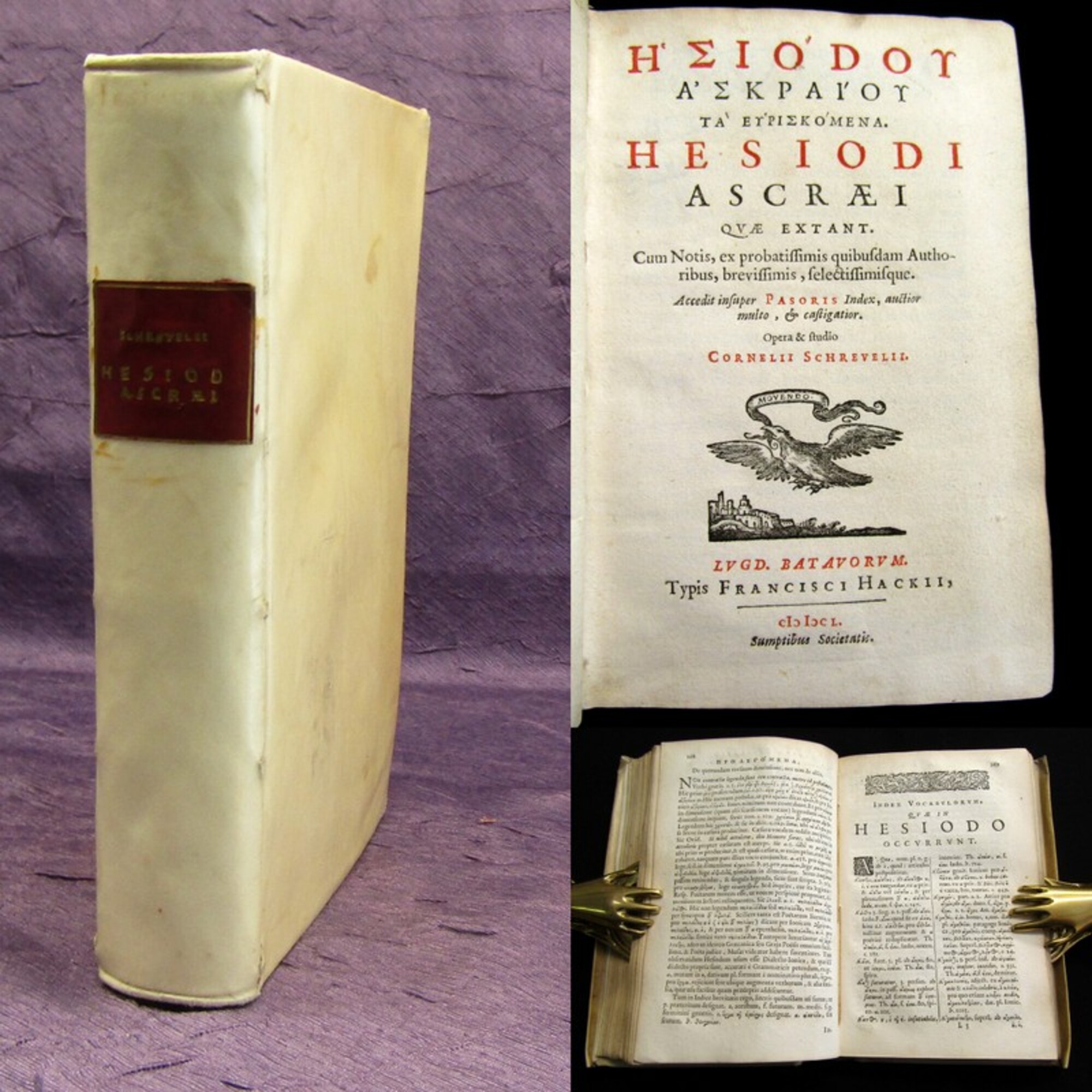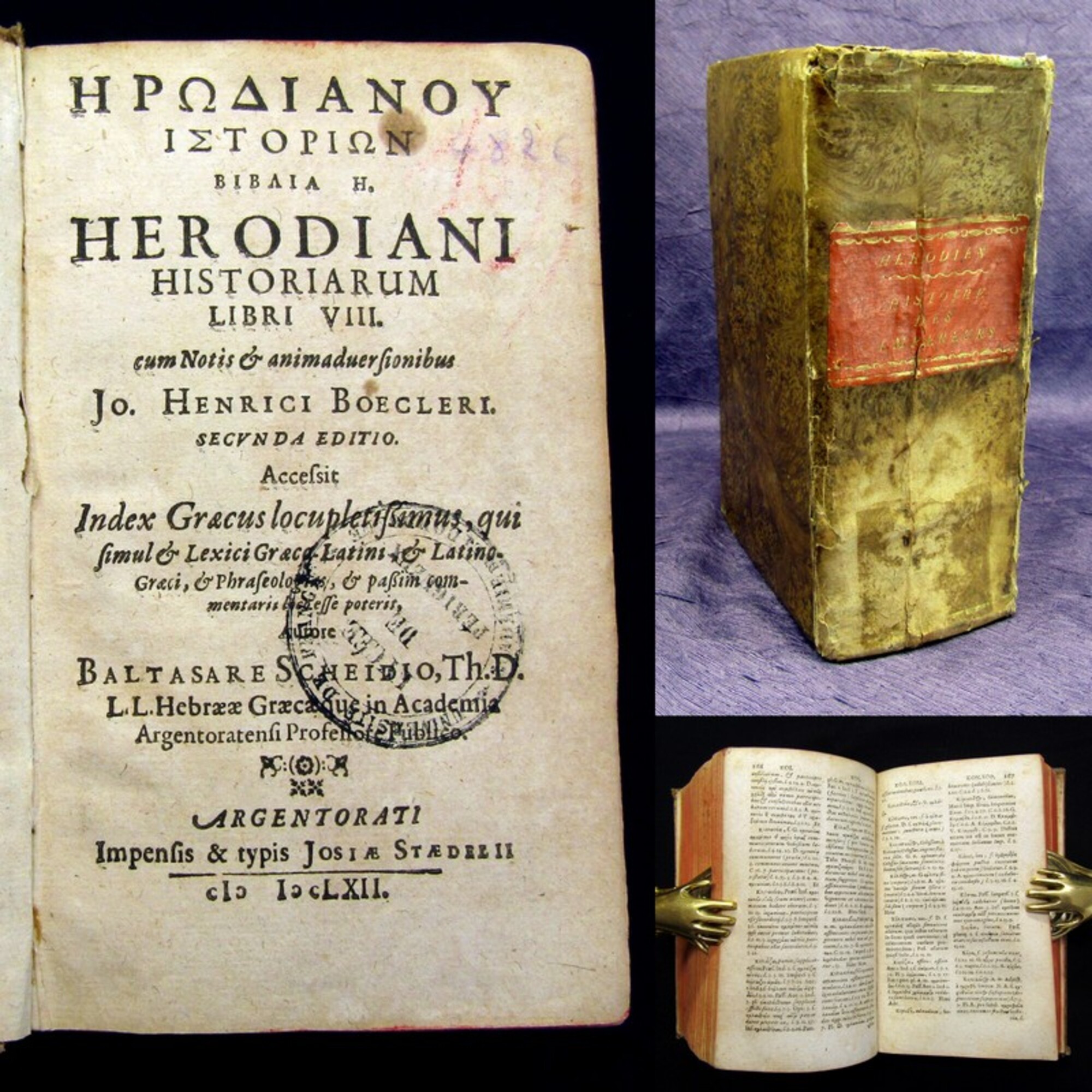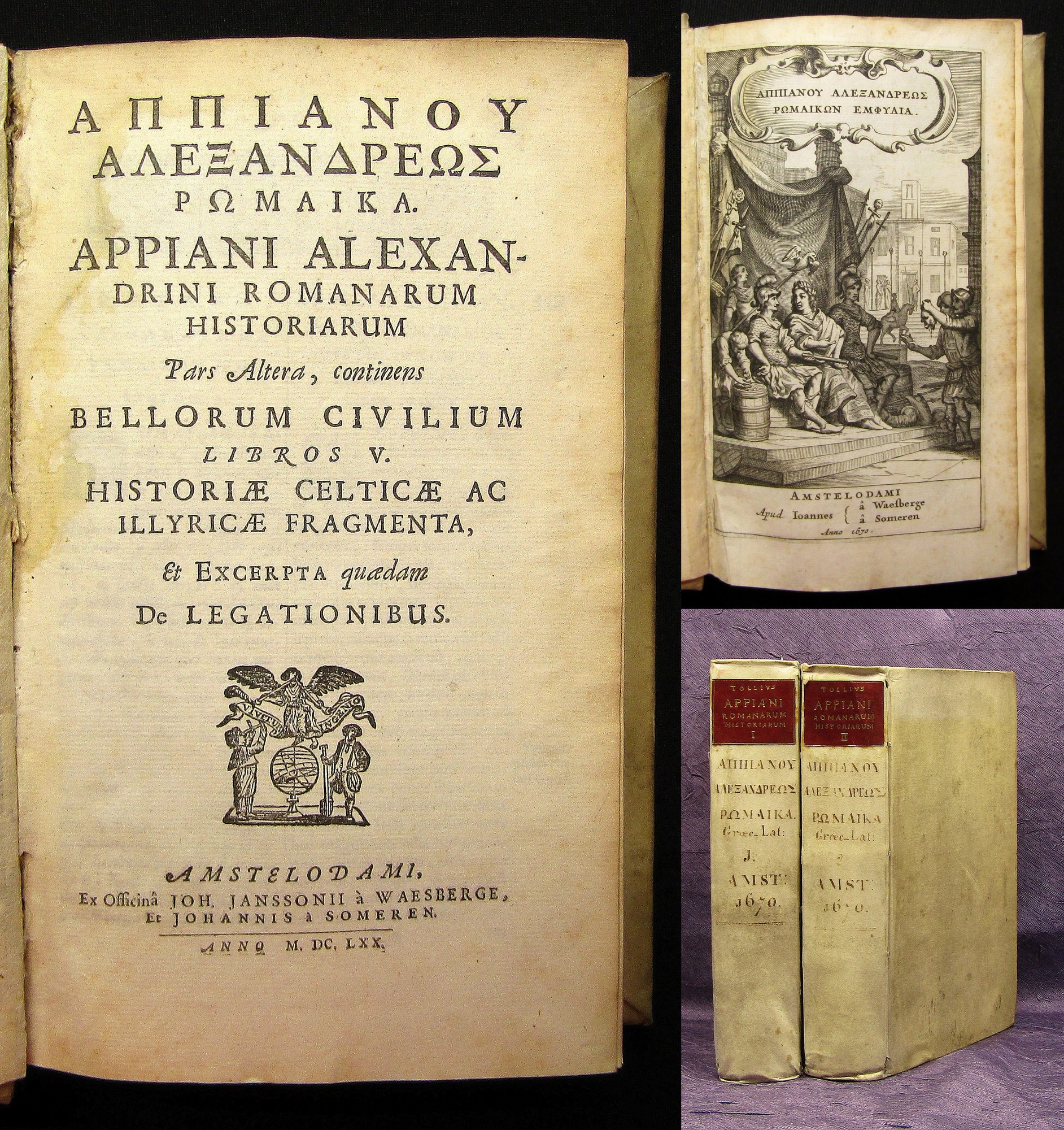 Appianus. Appianu Alexandreos Romaika - Appiani Alexandrini Romanarum Historiarum. Alexander Tollius, Utrumque textum multis in locis emendavit, correxit & Henrici Stephani, Ac Doctorum quorundam Virorum Selectas Annotationes adjecit. Pars prior & Pars altera. 2 Bde. in 2. Amstelodami, Janssonius, Someren, 1670. 8°(20x12cm), 2 Frontispiz, 10 Bll., 1229 S., 45 Bll. (Index), Pergamenteinbände d. Zt. mit hs. Rückentitel. Jöcher IV 1239 - Appianos, 2. Jh. n. Chr., aus Alexandreia, dann Rom als Advokat tätig, verfäßte in grieschicher Sprache eine Römische Geschichte von den Anfängen bis Trajan; die einzelnen Völker und Länder werden in der Reihenfolge behandelt, in der sie dem Imperium einverbleibt worden waren. Größere Teile des Werkes sind erhalten; die Benutzung der schwer nachweisbaren Quellen scheint selbständig zu sein, der Stil ist anspruchslos. - Einbände berieben und bestoßen, hs. Rs., latainisch-grieschicher Paralelltext, Papier altersbedingt gebräunt. Bestell-Nr: 8-0-526..........verkauft | ![]() | |