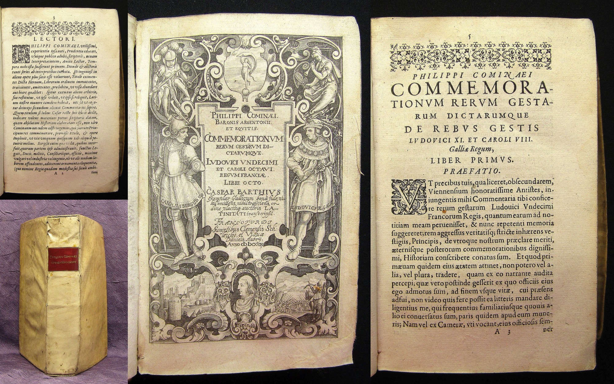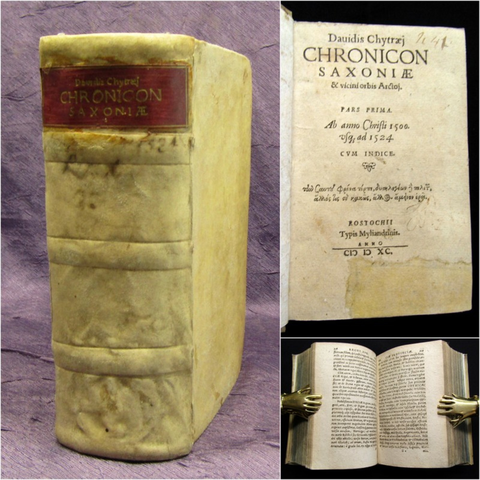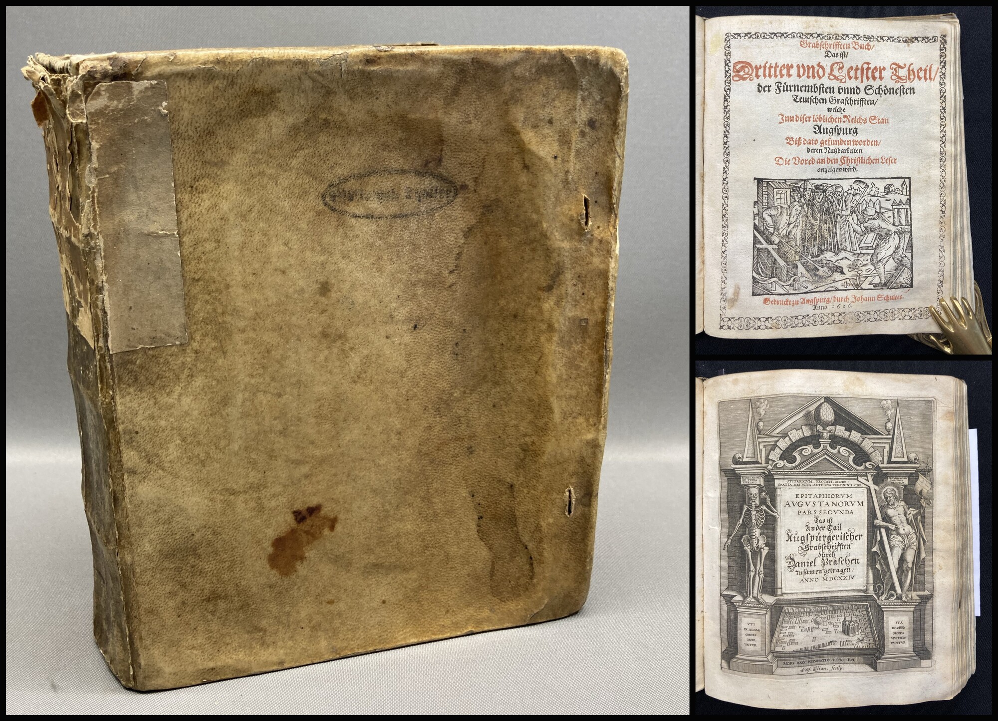 Sleidanus, Johannes / Beuther, Michael. Ordentliche Beschreibung und Verzeychniß allerley fürnemer Händel, so sich in Glaubens und anderen Weltlichen Sachen bei Regierung [...] Carls V., Ferdinand I., Maximilian u. Rudolph II. [...] biß auf [...] 1584 zugetragen [...]. Straßburg, Theodor Rihel, 1605. Folio, 6 nn. Bll., 815(1) S., 6 nn. Bll., blindgepr. Schweinsleder d. Zt. mit Schließenresten. Einband berieben und bestoßen, an Ecken und Kanten teils aufgeplatzt. Ecken teils abgebrochen. Papier gebräunt, durchgehend unterschiedlich stark feuchtrandig, durchgängig etwas wurmstichig. Titel mit 2 alten hs. Besitzeinträgen, Vorsatz mit Ausschnitt oben. Bestell-Nr: 8-2-505..........verkauft | ||