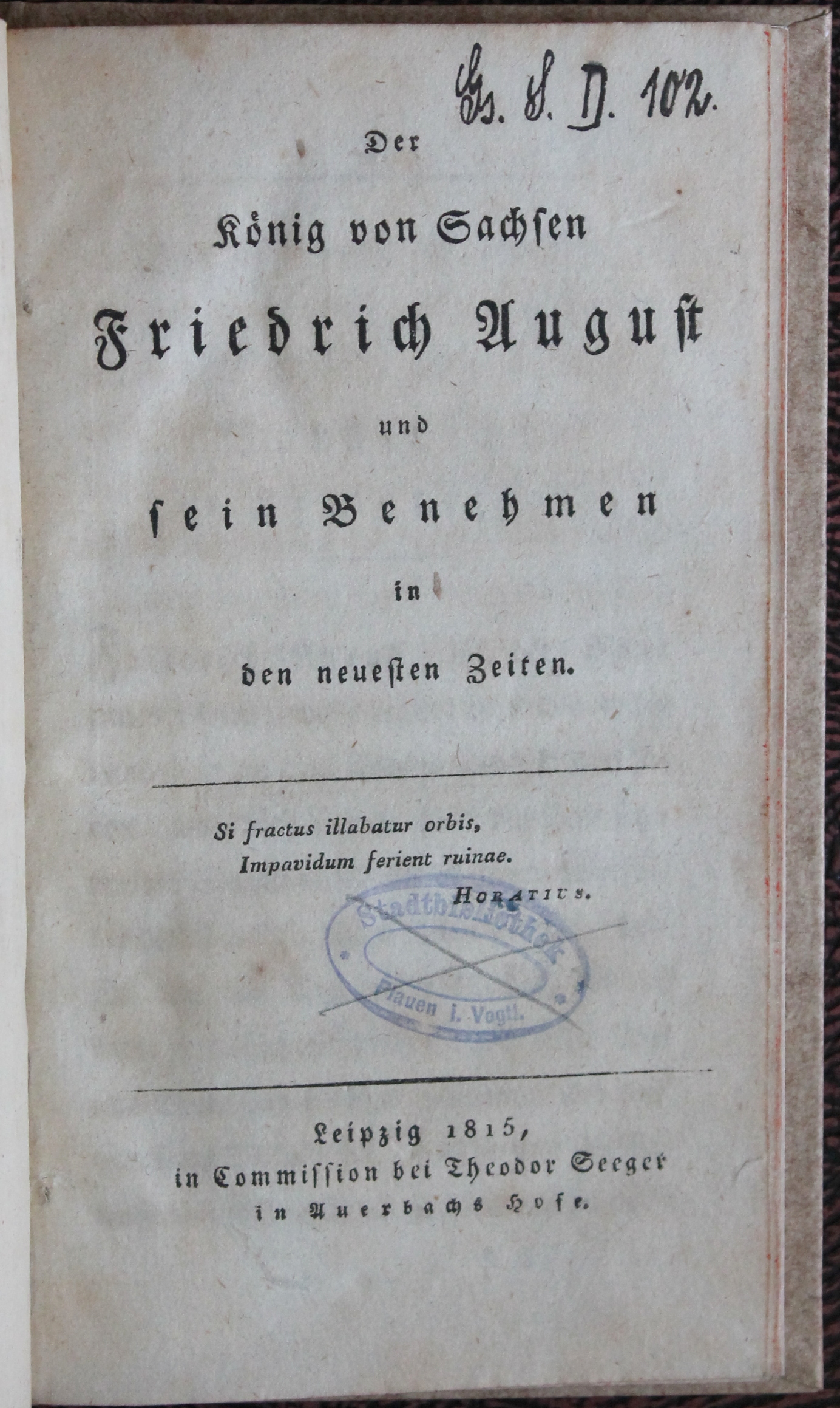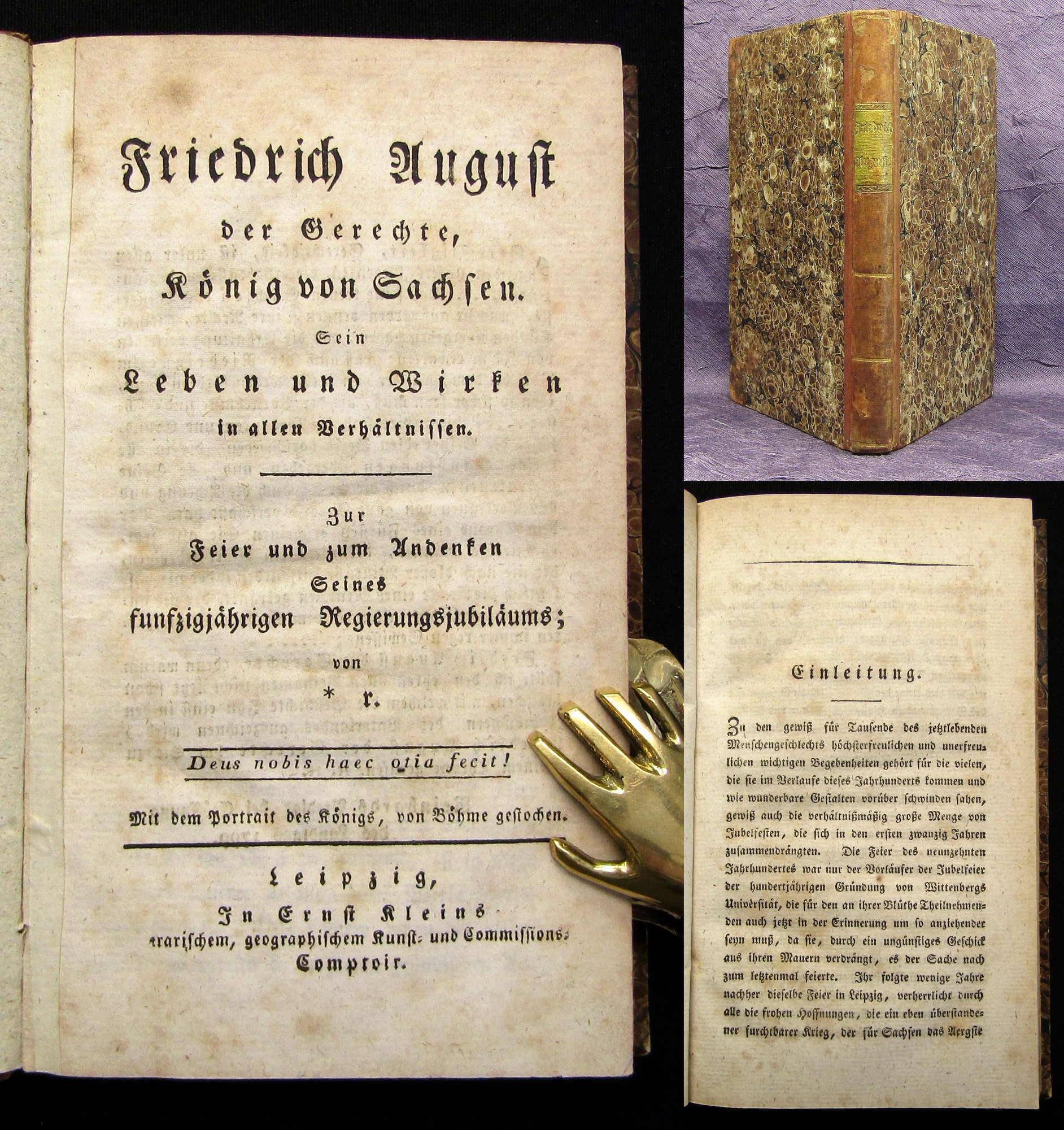 [Becker, Gottfried Wilhelm]. Friedrich August der Gerechte, König von Sachsen : sein Leben und Wirken in allen Verhältnissen. Zur Feier und zum Andenken seines funfzigjährigen Regierungsjubiläums / von *r [i.e. Gottfried Wilhelm Becker]. Mit einem Portrait des Königs, von J. C. Böhme gestochen. Leipzig, Ernst Klein, 1818. 8°, mit gest. Portrait sowie einer gest. Tafel, VII, 209 (1) S., 1 Bl., neuer Kleisterpapierumschlag im Stil d. Zt. Holzm.-Boh. II, 4264 NA - Papier etwas gebräunt und braunfleckig, vorgebundene Tafel und Titel mit altem Bibliotheksstempel, letzte 4 Blatt mit alter Knickspur und leicht eselsohrig. Bestell-Nr: 8-1-292..........verkauft | ||