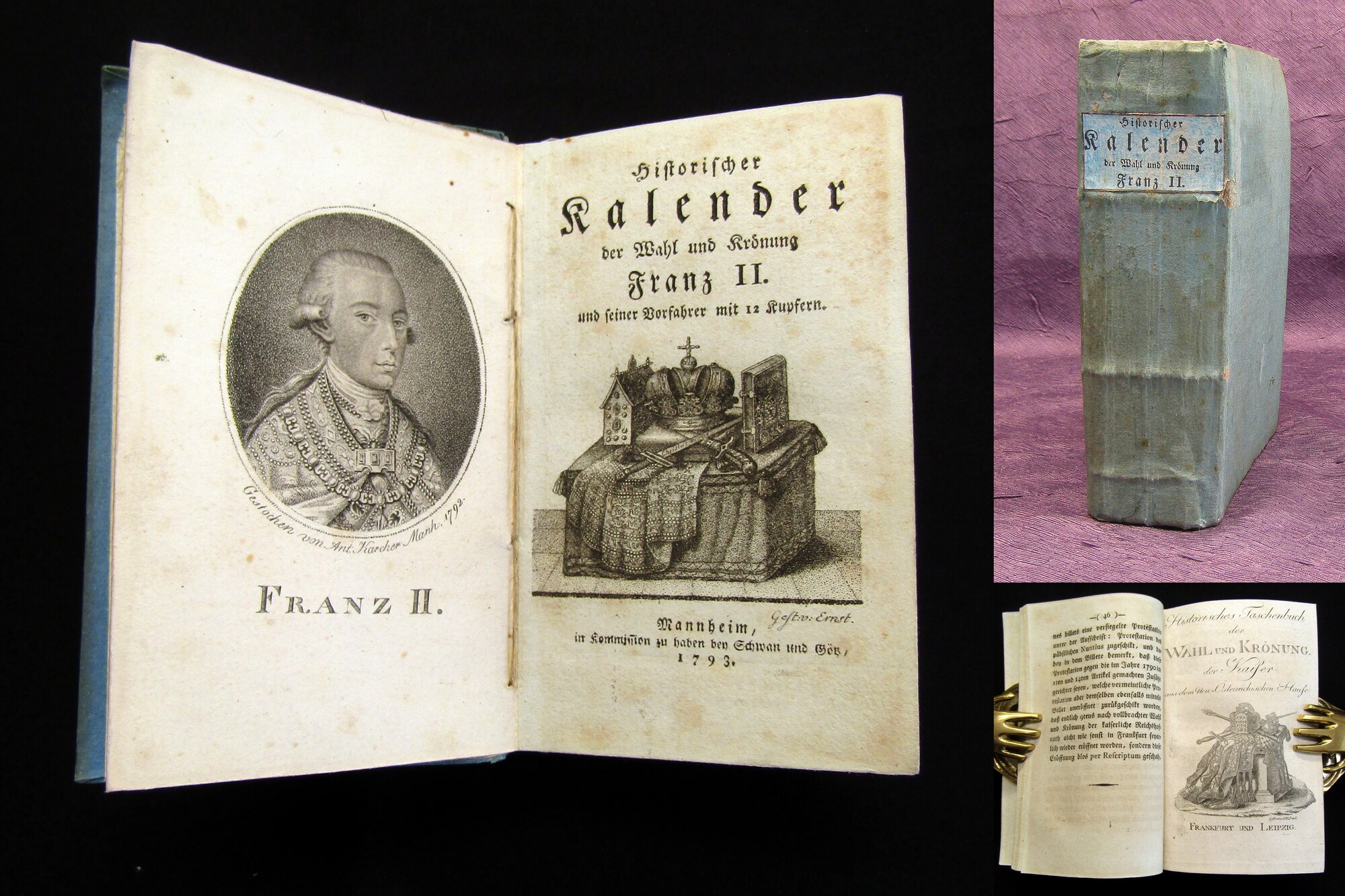 . Historischer Kalender der Wahl und Krönung Franz II. und seiner Vorfahrer - 4 Teile in 1 Bd.. Mannheim, Schwan, 1793. 12°(13x8cm), Frontispiz, gestochene Titelvignette, 12 Kupferstiche, 19 Bll., 46 S., 146 S., 192 S., 130 S., Pappeinband. Seltenes Exemplar! - Einband berieben und bestoßen, Papier altersbedingt leicht gebraunt. Bestell-Nr: 8-0-558..........verkauft | ![]() | |