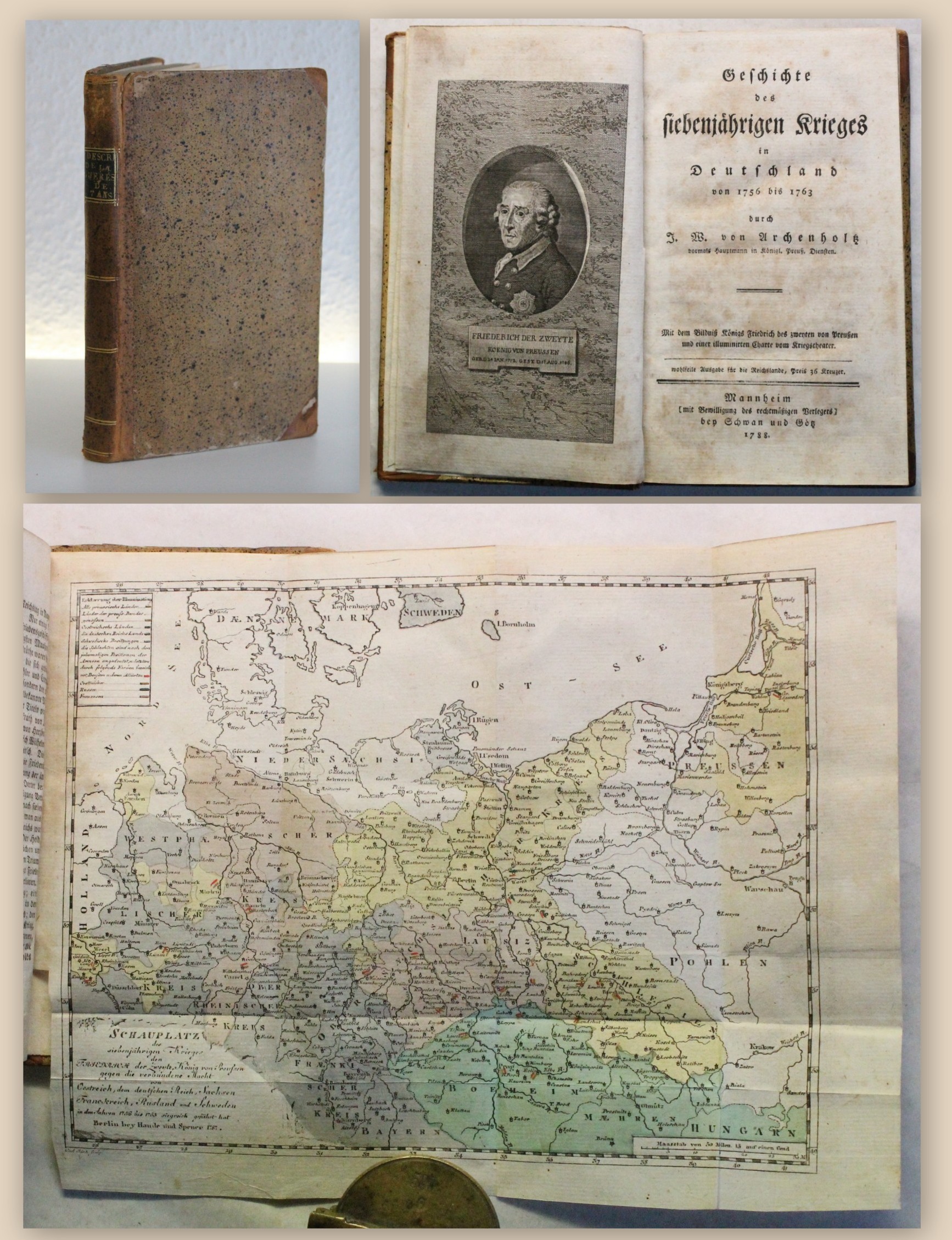 Archenholtz, Johann Wilhelm von. Geschichte des siebenjährigen Krieges in Deutschland von 1756 bis 1763. Mit dem Bildnis Königs Friedrich des zweyten von Preußen und einer illuminierten Charte vom Kriegstheater. Mannheim, Schwan und Götz, 1788. Kl.-8°, mit eienm Frontispiz und einer kol. Karte, 180 (recte 178)S., HLdr. d. Z.. Erste Auflage der seltenen Beschreibung des siebenjährigen Krieges. Einband leicht berieben und bestoßen, vorderes Gelenk ca. 3 cm Eingerissen, innen leicht gebräund und braunfleckig. Gesamt gutes Exemplar. Bestell-Nr: 8-0-59..........verkauft | ![]() | |
