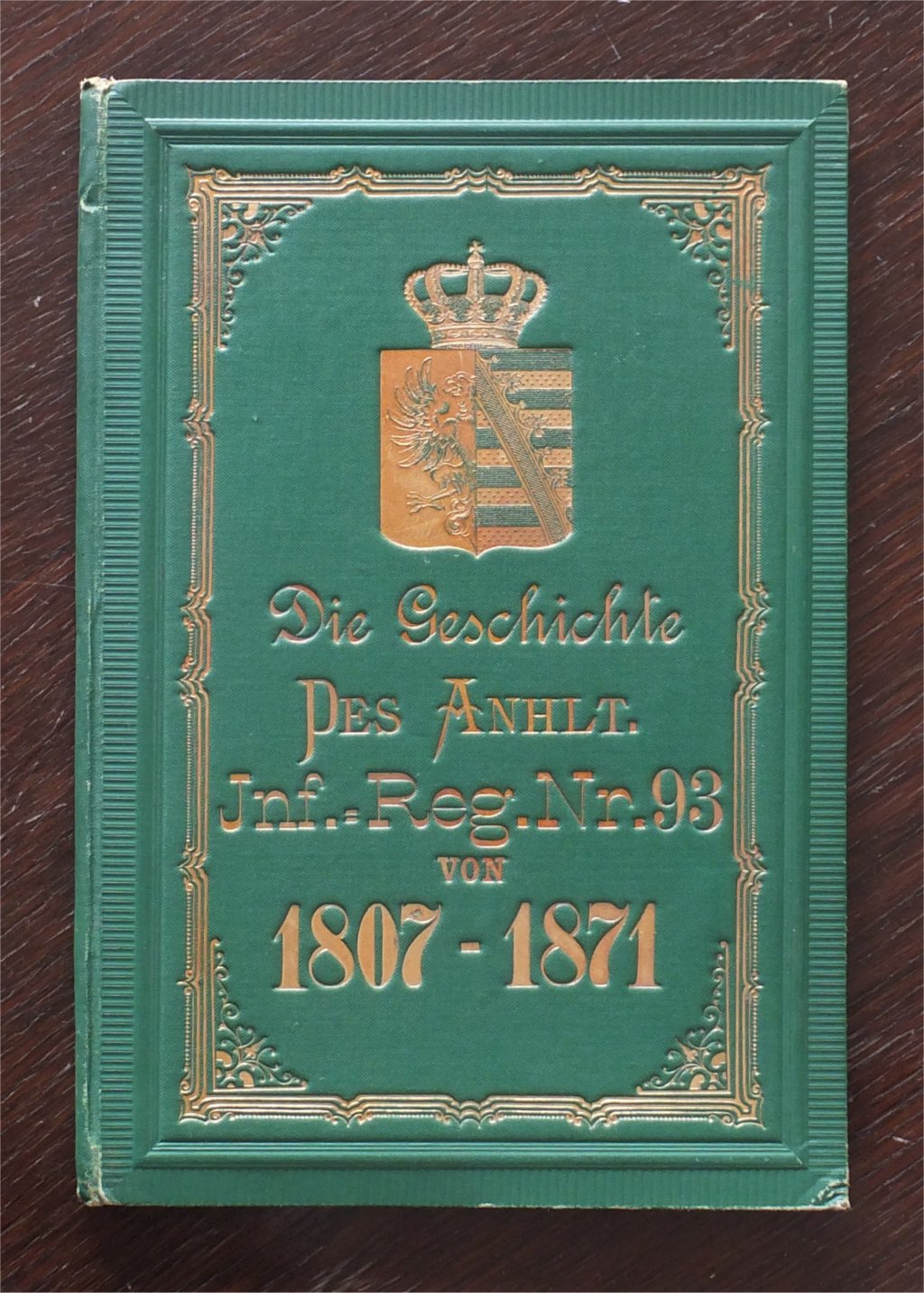 Bodenhausen, Kraft Freiherr v. 1807-1871. Teilnahme der Anhaltinischen Bataillone und des Anhaltinischen Infanterie-Regiments Nr. 93 an den Kriegen obiger Zeit - Für das Regiment und seine Freunde mit Benutzung amtlicher Quellen bearbeitet [...]. o.O. (Spandau), o.V., o.J. (um 1882). gr. 8°, 36 S., goldgepr. OLn. Einband an Kapitalen Ecken und Kanten etwas berieben und bestossen. Block und Bindung stark gelockert, fast gelöst. vorderer Vorsatz und Titel gelöst. Alter Stempel der Reservistenkameradschaft des Regiments auf vorderem Vorsatz. Seltener Titel. Bestell-Nr: 8-0-61..........verkauft | ![]() | |