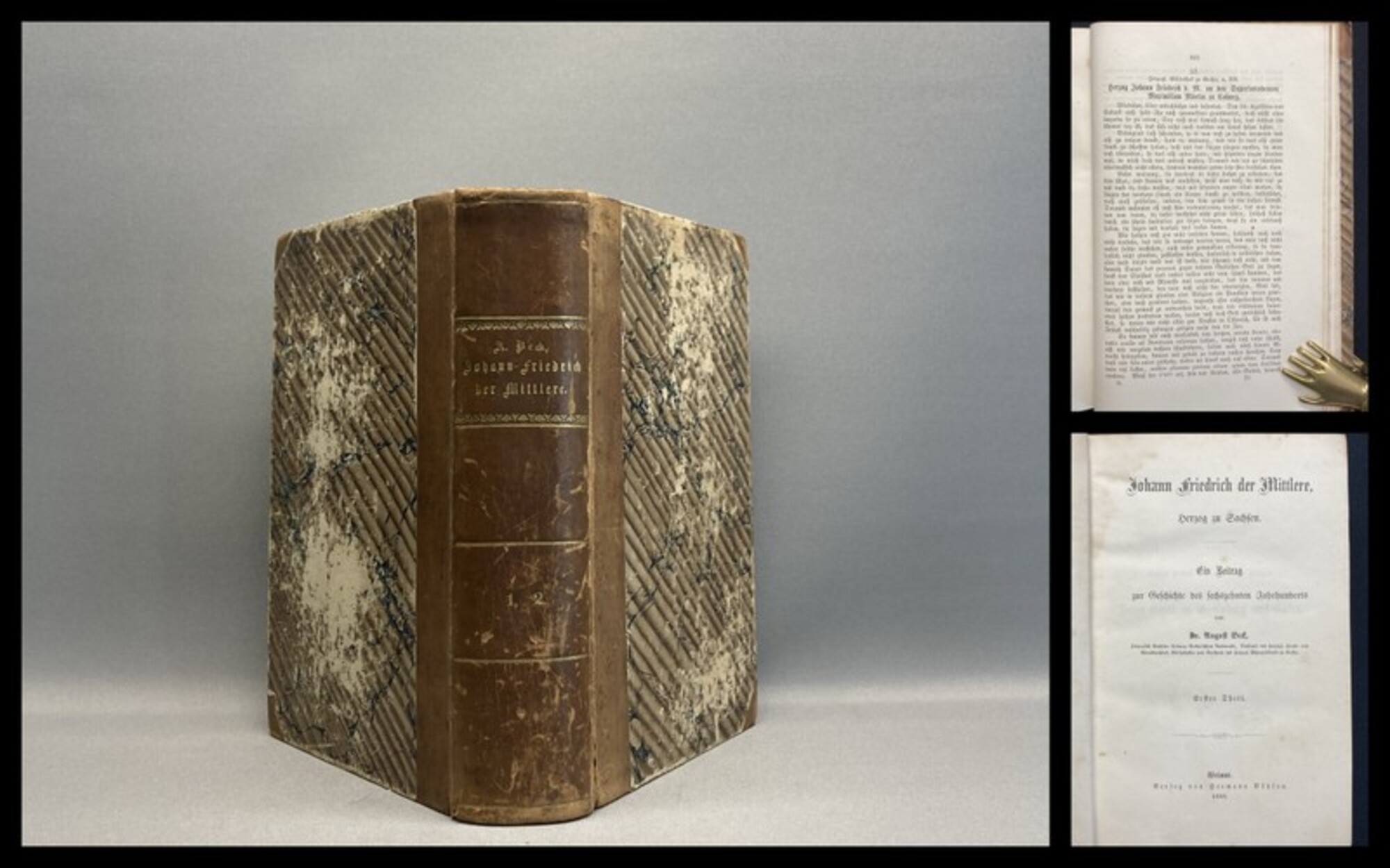 Beck, August Dr. . Johann Friedrich der Mittlere, Herzog zu Sachsen. Ein Beitrag zur Geschichte des sechzehnten Jahrhunderts. 2 Bde. in 1. Weimar, Hermann Böhlau, 1858. 8°(21x13,5cm), 599 s., 352 s., Halbleder mit marmoriertem Schnitt und Rückenverzierung. August B4eck war ein deutscher Historiker und Archivar(28. Januar 1812 in Gotha; † 7. August 1874 ebenda), er studierte Theologie und Philologie. - Einband beschabt und bestossen, Falz unten 1,5 cm eingerissen. Papier durchgehend gering gebräunt und vereinezelt mit Anstreichungen aus Blei. Bestell-Nr: 8-0-612..........150,00 € (inkl. MwSt. zzgl. Versand) | ![]() | |