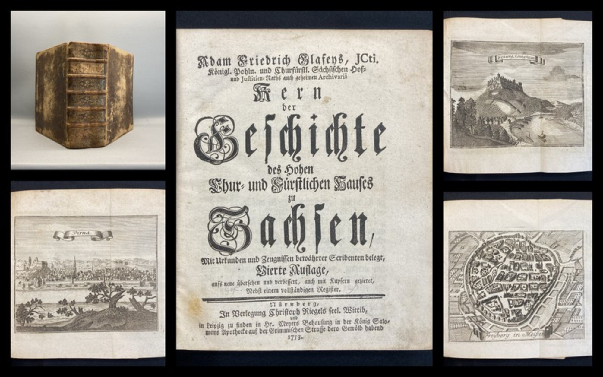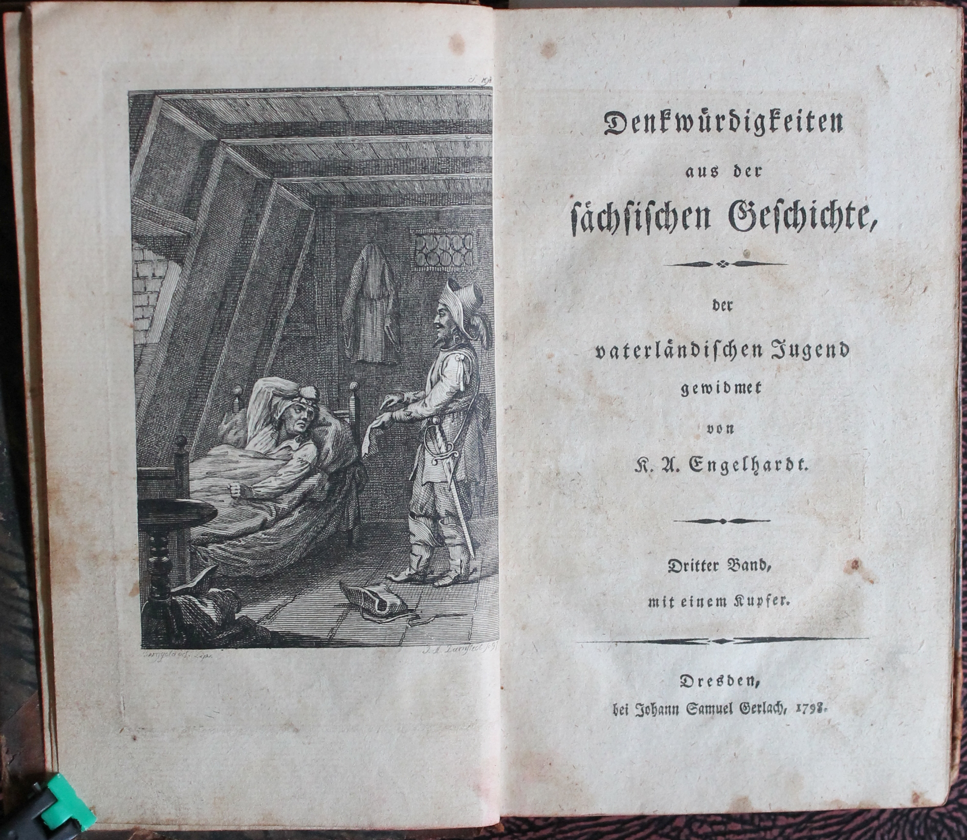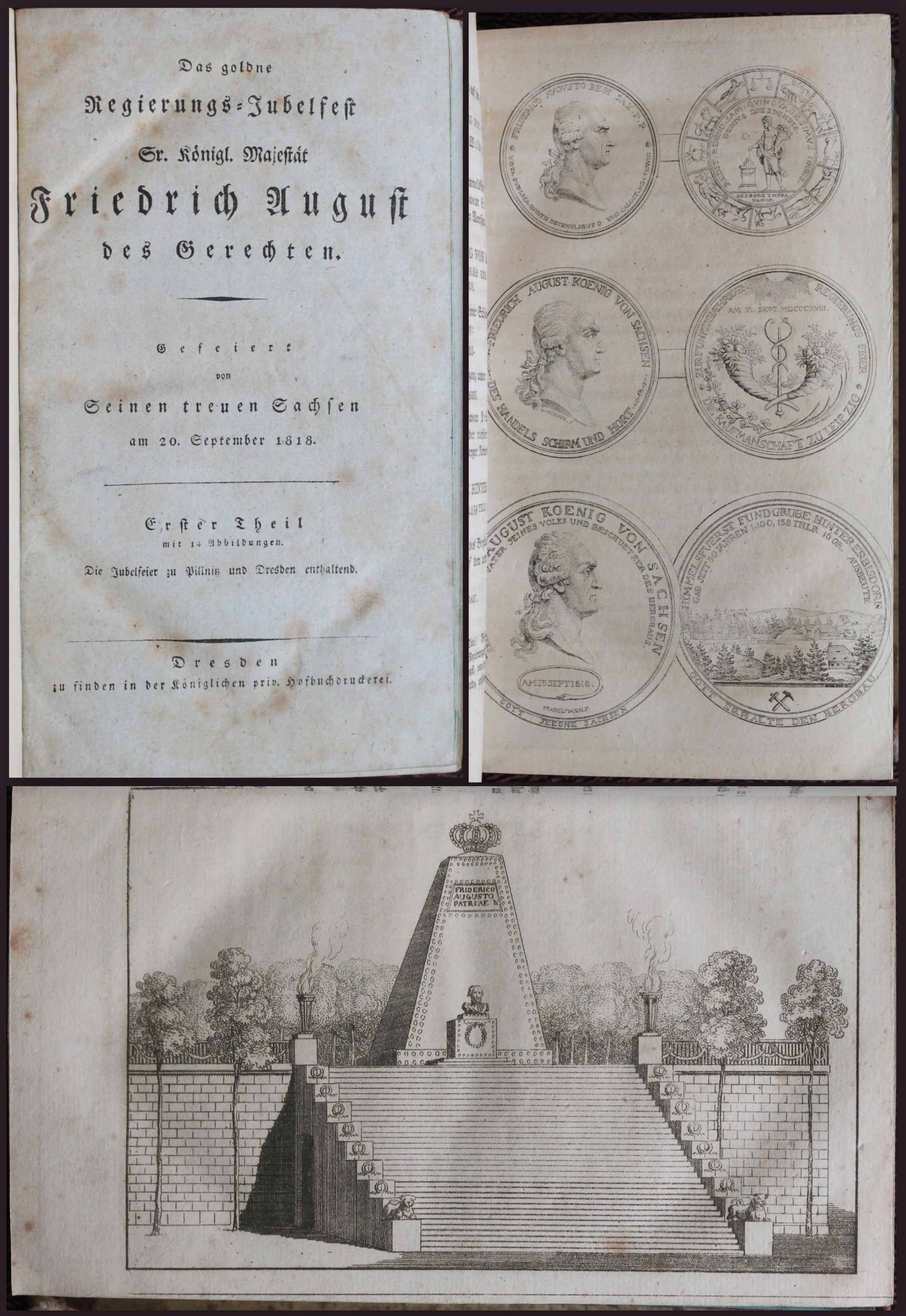 Anonym [Engelhardt, Carl August]. Das goldne Regierungs-Jubelfest Sr. Königl. Majestät Friedrich August des Gerechten. Gefeiert von Seinen treuen Sachsen am 20. September 1818. 1. + 2. Teil (v. 3) in 1 Bd. Dresden, Hgl. priv. Hofbuchdruckerei, 1818. gr. 8°, mit 5 (1 gefalt.) Holzschnitten und 18 (2 gefalt.) Kupferstichen, VIII, 84 S., 115 S.; VIII, 244, 158 S., 1 Bl., Ldr. d. Zt. mit RS. Goedeke IX, 276, 18; Holzm.Boh. III, 11263 - Erste Ausgabe. Band 1 beschreibt die Feierlichkeiten in Pillnitz und Dresden, Band 2 im Meißner, Leipziger und Erzgebirgischen Kreis. Der geflammte Einband mäßig berieben und bestossen. Papierbedingt etwas gebräunt, leicht braunfleckig. Eine Tafel mit kleinem seitlichen Einriss. Gutes Exemplar. Bestell-Nr: 8-1-106..........verkauft | ![]() | |