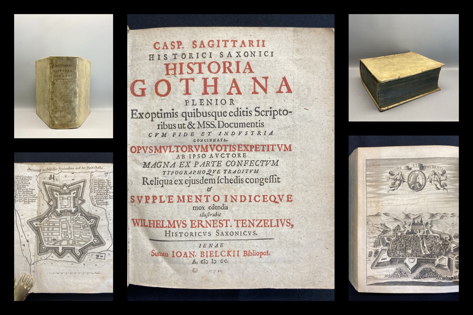 Wolf, Johann. Geschichte und Beschreibung der Stadt Heiligenstadt mit Urkunden. Göttingen, Rosenbusch, 1800. 8°, mit gest. Stadtplan als Frontispiz und gest. Titelvignette, XVI, 272 S., 104 S., 4 Bll., HLdr. d. Zt. Seltene erste Ausgabe der Chronik. Einband berieben, etwas bestoßen, Vorsatz, Titel, und Titel verso mit alten Besitzstempeln, Titel und vorderer Spiegel mit alten hs. Besitzeinträgen. Papier altersbedingt etwas gebräunt, vereinzelt etwas braunfleckig. 1 Blatt der Vorrede mit längerem, alt geklebten Einriss, dadurch etwas Buchstabenverlust. Seite 1 mit etwas dunklerer Stelle durch eingelegtes Papierstück. Gutes Exemplar. Bestell-Nr: 8-2-209..........verkauft | ||
