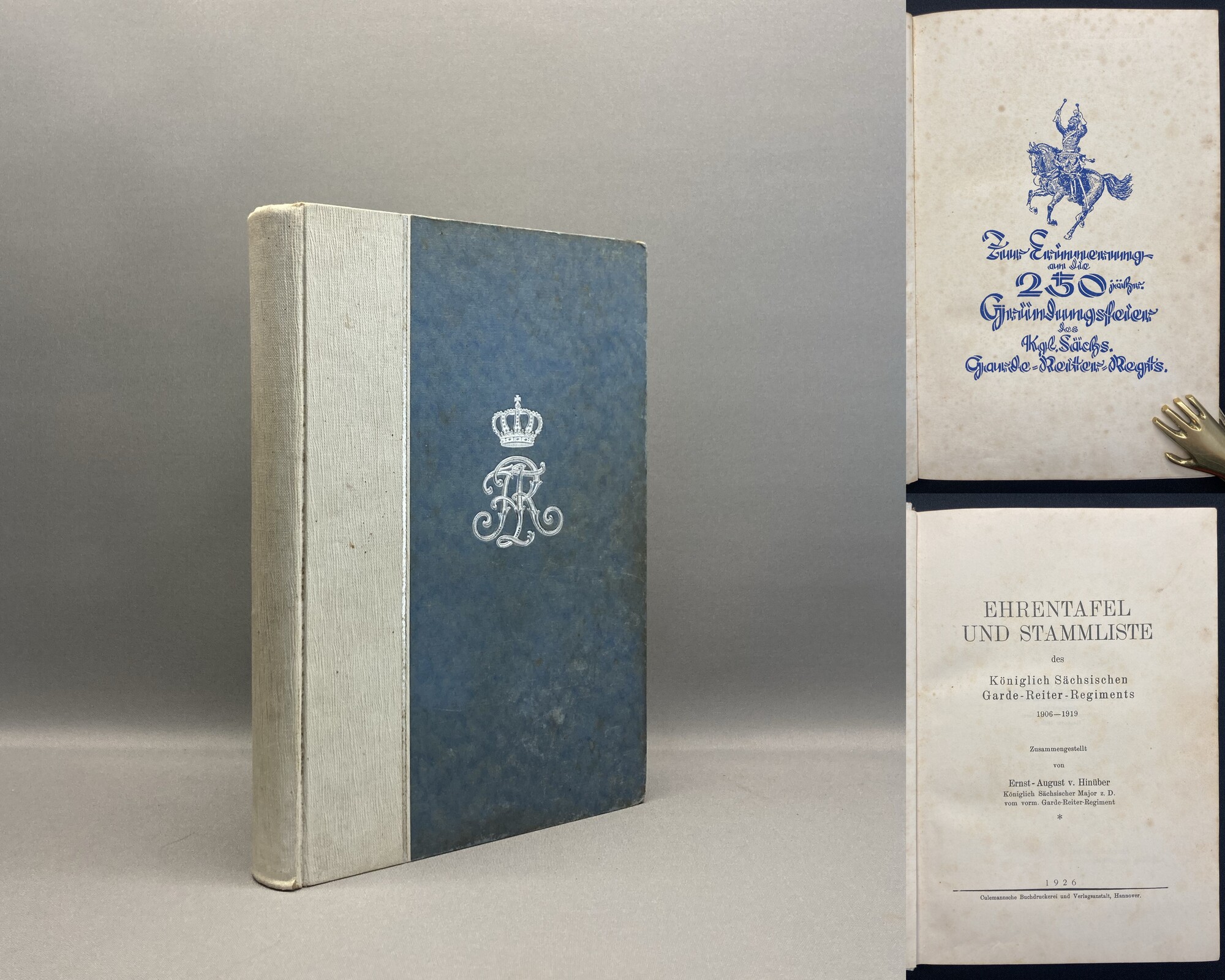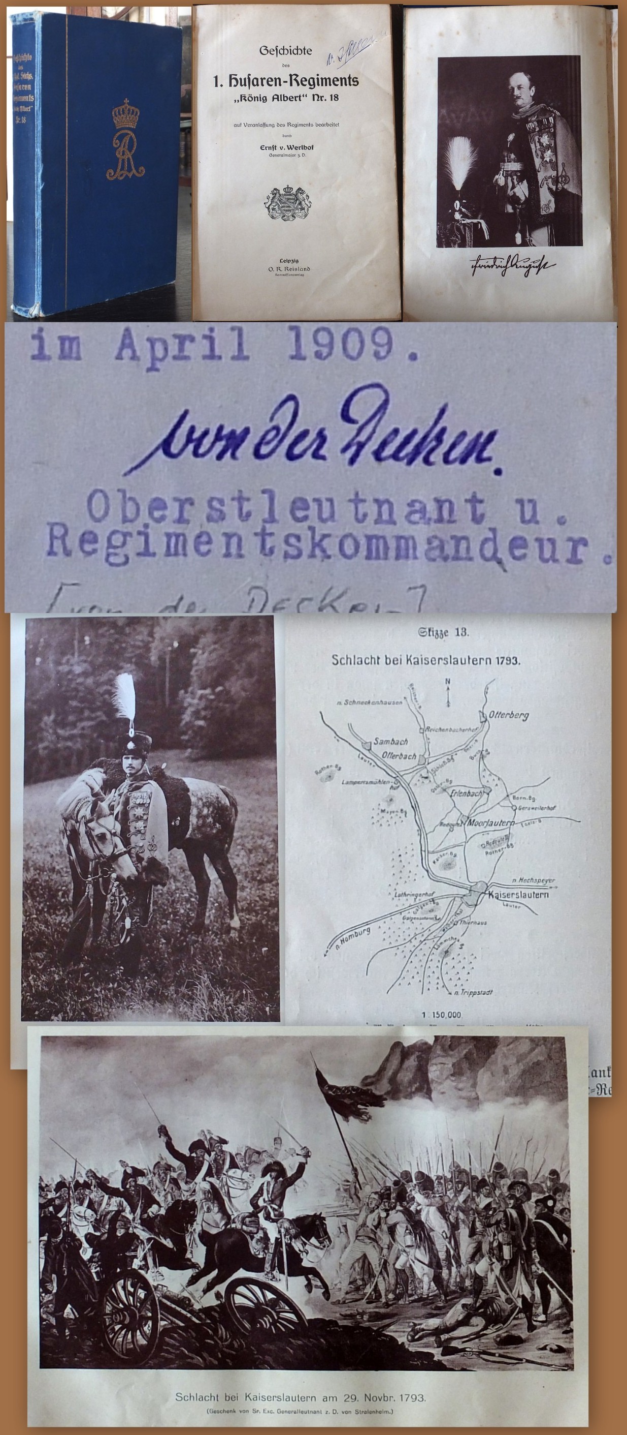 Werlhof, Ernst v.. Geschichte des 1. Husaren-Regiments "König Albert" Nr. 18. Leipzig, O. R. Reisland, o. J. (1909). 4°, mit Widmung und Unterschrift des Kommandeurs Oberstleutnant von der Decken auf vorderem Spiegel, einigen Abbildungen auf Tafeln und im Text sowie 4 Karten, VIII, 411 S., 162 S., 1 Bl., OLn. Einband berieben und bestossen, Kapitale etwas ausgefranst, hinterer Deckel lleicht fleckig. Papier sauber, vereinzelt etwas braunfleckig. Titel mit altem Besitzeintrag, wenige Seiten mit hs. Notizen. Bestell-Nr: 8-0-68..........verkauft | ![]() | |