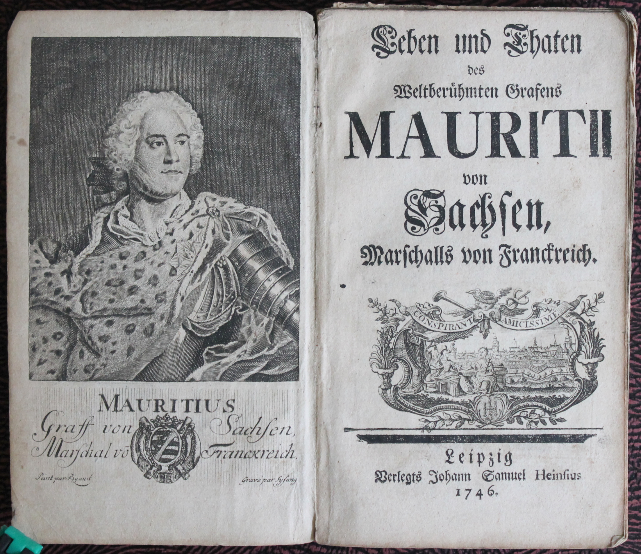 Anonym [Ranft, Michael]. Leben und Thaten des Weltberühmten Grafens Mauritii von Sachsen, Marschalls von Franckreich. Leipzig, Johann Samuel Hensius, 1746. 8°, mit gest. Portrait von Sysang nach Pigaud und gest. Titelvignette, 3 Bll., 293 (recte 294) S., Brosch. d. Zt.. Holzmann/Bohatta III, 688 - Erste Ausgabe. Enthält die Lebensbeschreibung von Graf Moritz von Sachsen, zugleich erste Biografie des bedeutenden Feldherren. Broschur berieben, etwas fleckig, Kapitale etwas abgegriffen. Eine Lage etwas überstehend, dadurch im Rand gebräunt. Papier etwas gebräunt, vereinzelt etwas fleckig, Spiegel je mit alten Bleistifteinträgen. Gutes Exemplar des seltenen Titels. Bestell-Nr: 8-0-88..........verkauft | ![]() | |
