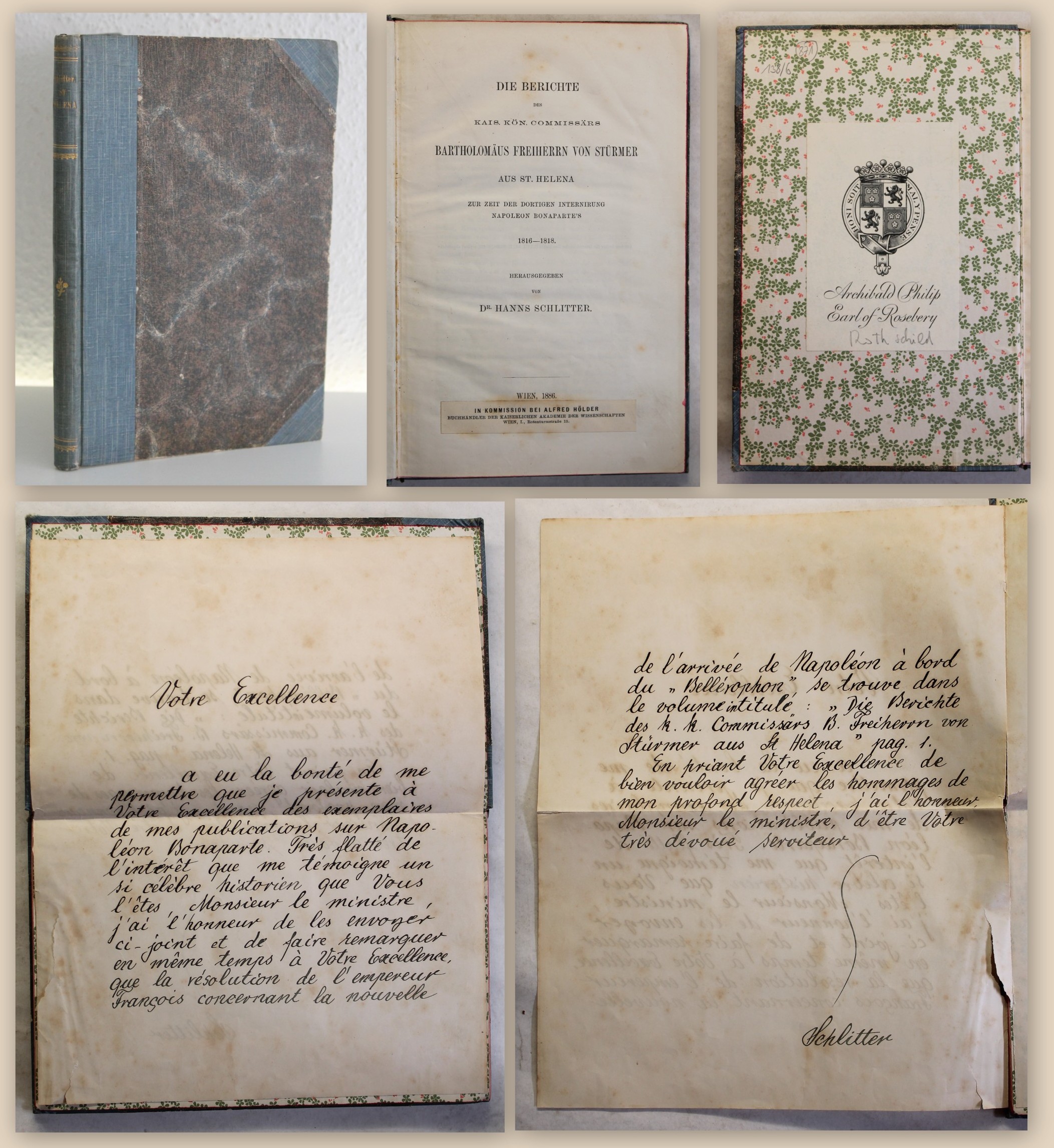 Schlitter, Dr. Hanns. Die Berichte des Kais. Kön. Commissärs Bartholomäus Freiherrn von Stürmer aus St. Helena zur Zeit der dortigen Internirung Napoleon Bonapartes 1816-1818 [...]. Wien, in Komm. Alfred Hölder, 1886. gr. 8°, 210 S., HLn. d. Zt. Das vorliegende Exemplar mit Exlibris aus der Bibliothek des Britischen Premierministers Archibald Philip Primrose - 5. Earl of Roseberry. Es enthält auf den vorderen Spiegel montiert den 4-seitigen Widmungsbrief des Verfassers an obigen Premier. Roseberry war mit Hanna Rothschild, einer der einflussreichsten und reichsten Frauen seiner Zeit verheiratet. Einband etwas berieben und bestossen. Papier sauber, montierter Brief, Titel und letzte Seite gering braunfleckig. 1 Seite mit hs. Korrektur des Verfassers. Sehr gutes Exemplar des seltenen Titels mit Widmung und höchst interessanter Provinienz. Bestell-Nr: 8-0-93..........verkauft | ![]() | |