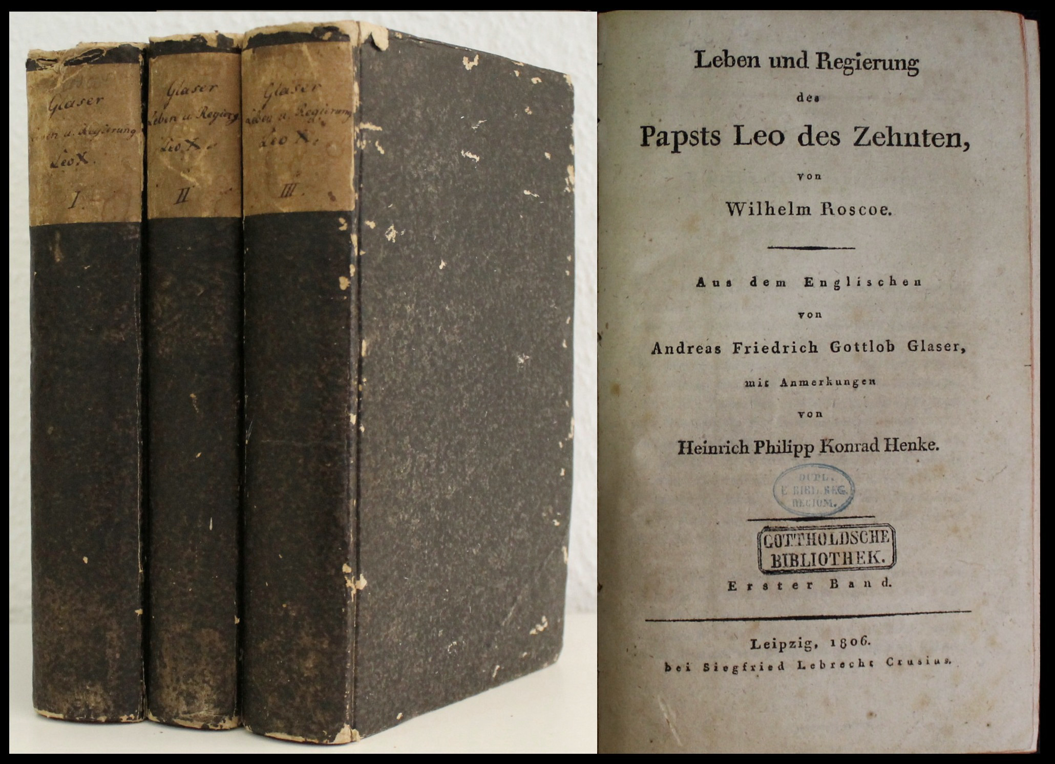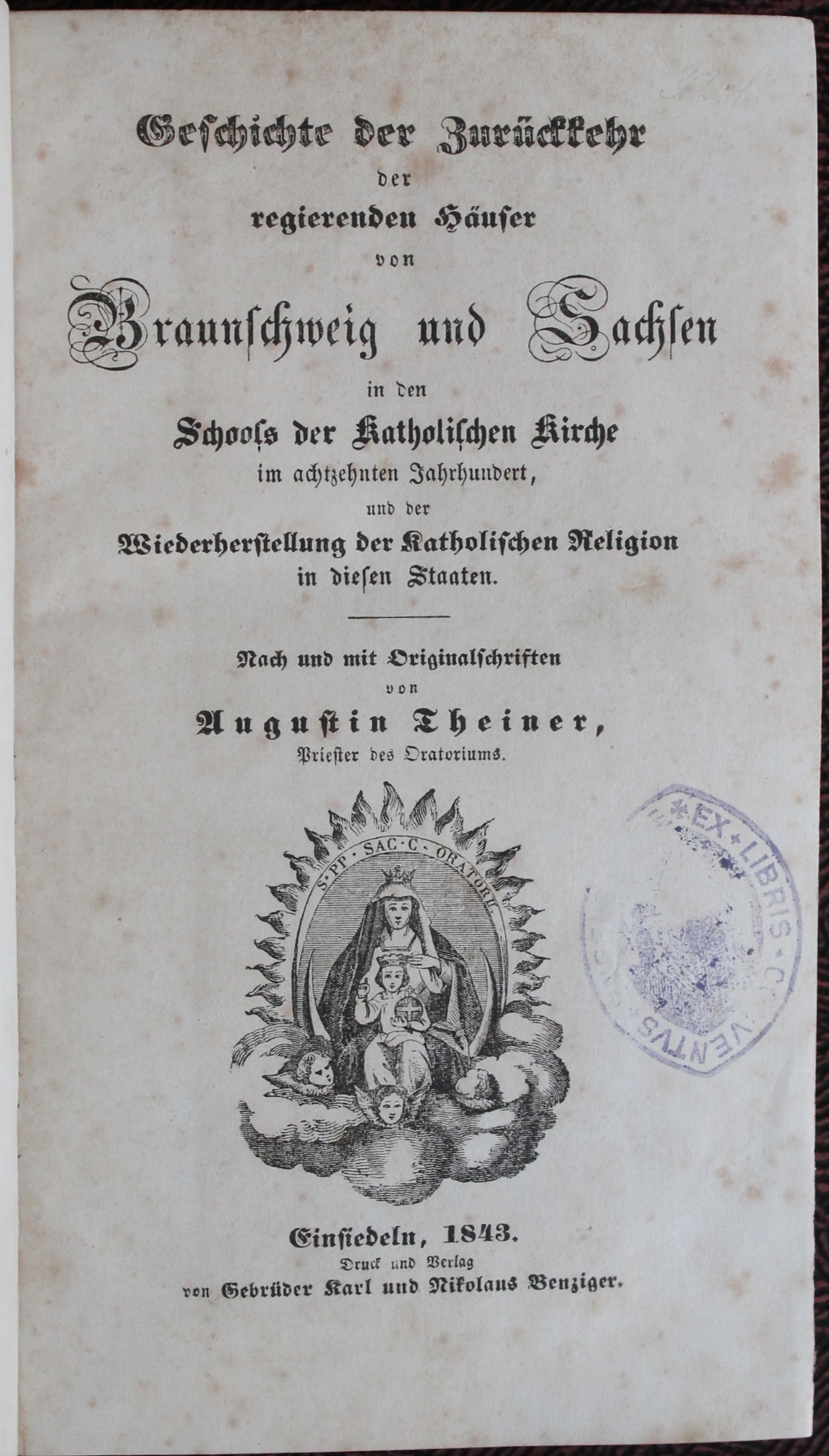 Theiner, Augustin. Geschichte der Zurückkehr der regierenden Häuser von Braunschweig und Sachsen in den alten Schooss der Katholischen Kirche im achtzehnten Jahrhundert, und der Wiederherstellung der katholischen Religion in diesen Staaten. Nach und mit den Originalschriften [...]. Einsiedeln, Karl und Nikolaus Benziger, 1843. gr. 8°, VIII, 221(1) S., 154 S.(Urkundenbuch), Ppbd. d. Zt. mit Rs. ADB 37, 675 - Einband etwas berieben, kaum bestossen. Papierbedingt leicht gebräunt und etwas braunfleckig. Vorderer Spiegel mit Resten eines alten Exlibris, 4 Blatt des Registers oben mit hinterlegtem Einriss im weissen Rand. Bestell-Nr: 8-1-104..........verkauft | ![]() | |