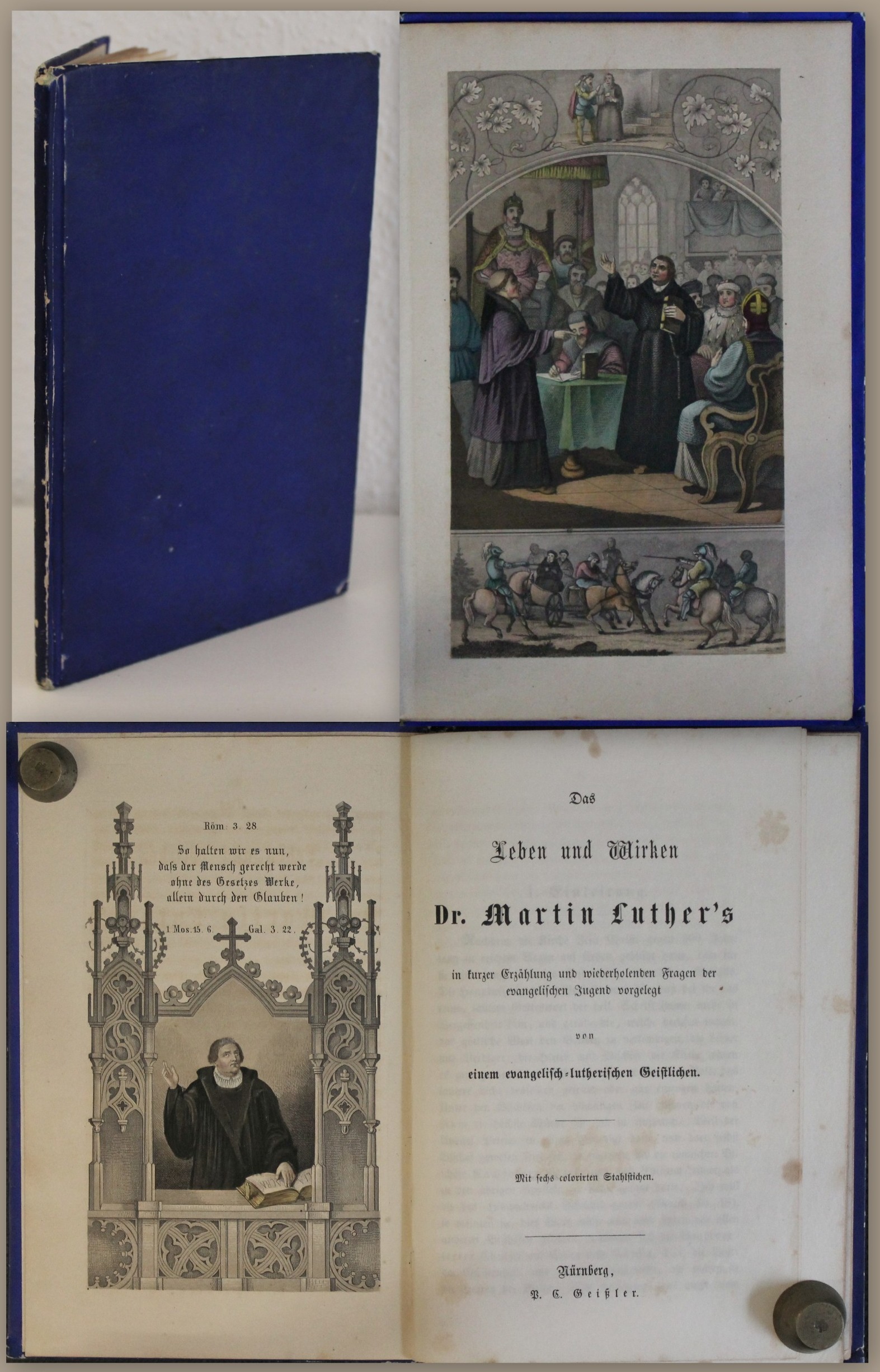 Anonym. Das Leben und Wirken Dr. Martin Luther's in kurzer Erzählung und wiederholenden Fragen der evangelischen Jugend vorgelegt [...]. Nürnberg, P. C. Geißler, o.J. (um 1860). 8°, mit 6 fein handkolorierten Stahlstichen, 38 S., Ppbd. d. Zt. Einband etwas berieben und bestossen, Kapitale abgegriffen. Papierbedingt etwas gebräunt, Text etwas braunfleckig. DIe schönen Tafeln gleichmäßig leicht gebräunt, eine Tafel mit kaum merklicher alter Knickspur im äußersten weissen Rand. Bestell-Nr: 8-0-97..........verkauft | ![]() | |