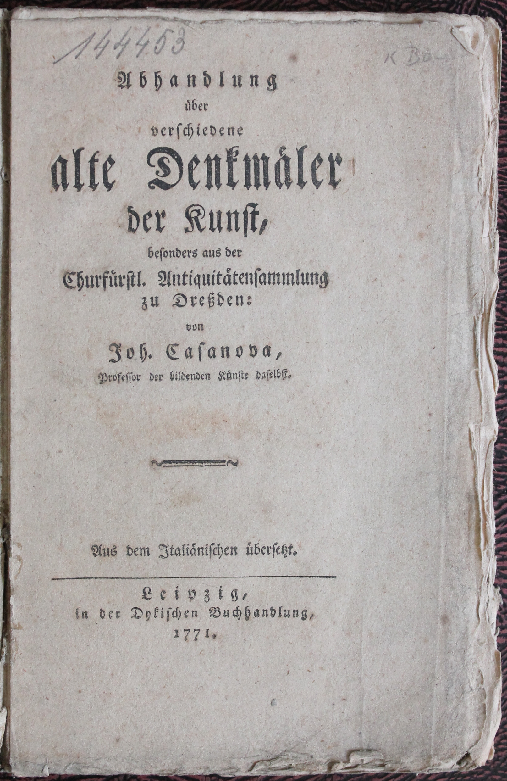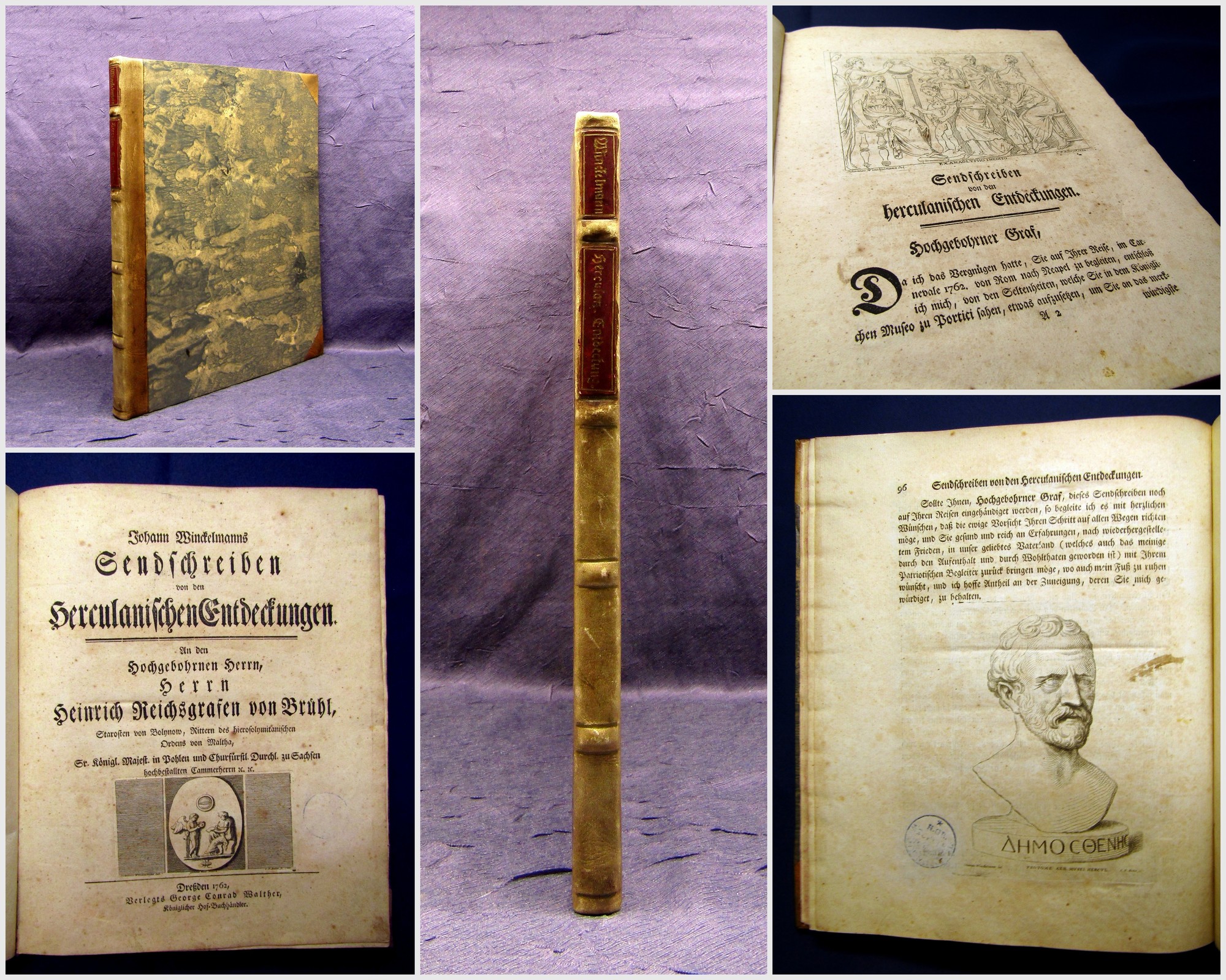 Winckelmann, Johann [Joachim]. Sendschreiben von den Herculanischen Entdeckungen. An den Hochgebohrnen Herrn, Herrn Heinrich Reichsgrafen von Brühl [...]. Dresden, Georg Conrad Walther, 1762. 4° (25x21 cm), mit gestochener Titel-, Kopf- und Schlussvignette von Christian Friedrich Boëtius nach Winckelmann, 96 S., neuerer HLd. im Stil d. Zt. Goedeke IV/1, 301, 9; Rümann 1279. - Erste Ausgabe. Zusammenfassung der Ergebnisse seiner zweiten, in Gesellschaft des Grafen Heinrich von Brühl durchgeführten, Italien-Reise. "Eine fern von städtischem Treiben, in der behaglichen Stille des Landsitzes des Cardinals Albani, auf Castel Gandolfo, niedergeschriebene summarische, aber vortrefflich erläuternde Uebersicht über die Resultate der Ausgrabungen, die sich des größten Beifalls erfreute" (ADB). - Einband nahezu ohne Gebrauchsspuren. Papier gebräunt und etwas braunfleckig. Titel und letztes Blatt mit altem Besitzstempel (kaum entzifferbar). Gutes Exemplar. Bestell-Nr: 8-3-498..........verkauft | ![]() | |