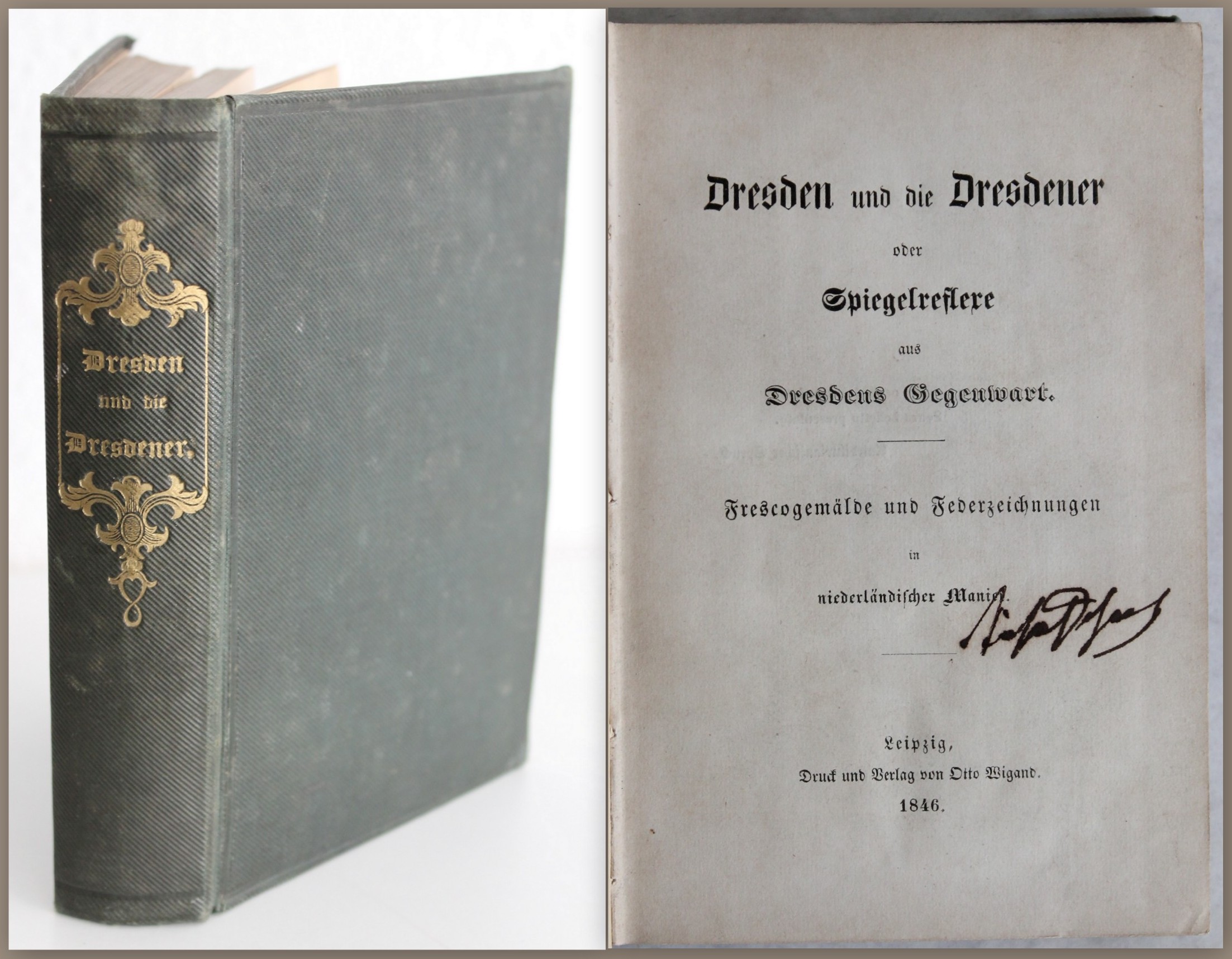 Anonym [Wanderer, Treumund]. Dresden und die Dresdener oder Spiegelreflexe aus Dresdens Gegenwart. - Frescogemälde und Federzeichnungen in niederländischer Manier. Leipzig, Otto Wigand, 1846. 8°, 550 S., 1 Bl., Ln. d. Zt. mit goldgepr. Rücken. Einband gering berieben, kaum bestossen. Papierbedingt minimal gebräunt. Titel mit altem hs. Besitzvermerk. 1 Blatt im weißen Rand mit alt ergänzter Fehlstelle. Sehr gutes Exemplar. Bestell-Nr: 8-1-105..........verkauft | ![]() | |