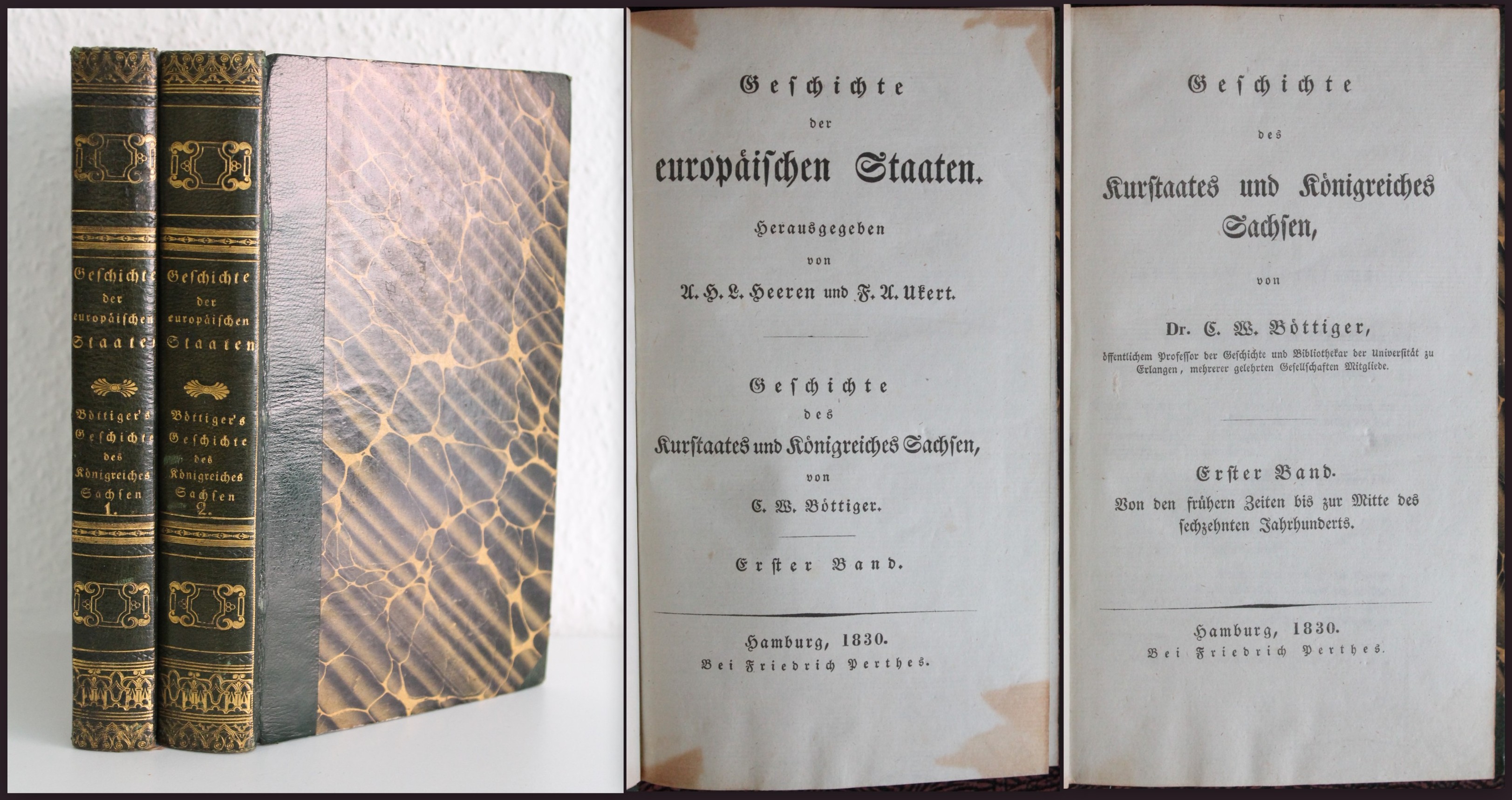 Weiße, D. Christian Ernst. Neueste Geschichte des Königreichs Sachsen seit dem Prager Frieden bis auf unsere Zeiten. Band 1 und 2 (v.3). Leipzig, J.C. Hinrichs, 1808. gr. 8°, XII, 438 S., 3 Bll.; X (recte VIII), 326 S., 1 Bl., Ppbd. d. Zt. Einbände berieben und bestossen. Kapitale abgegriffen, Rücken von Bd. 1 unten mit kleiner Bezugsfehlstelle, Rücken je mit altem Bibliotheksschild, Papier altersbedingt leicht gebräunt sonst sauber und frisch. Bestell-Nr: 8-1-123..........verkauft | ![]() | |