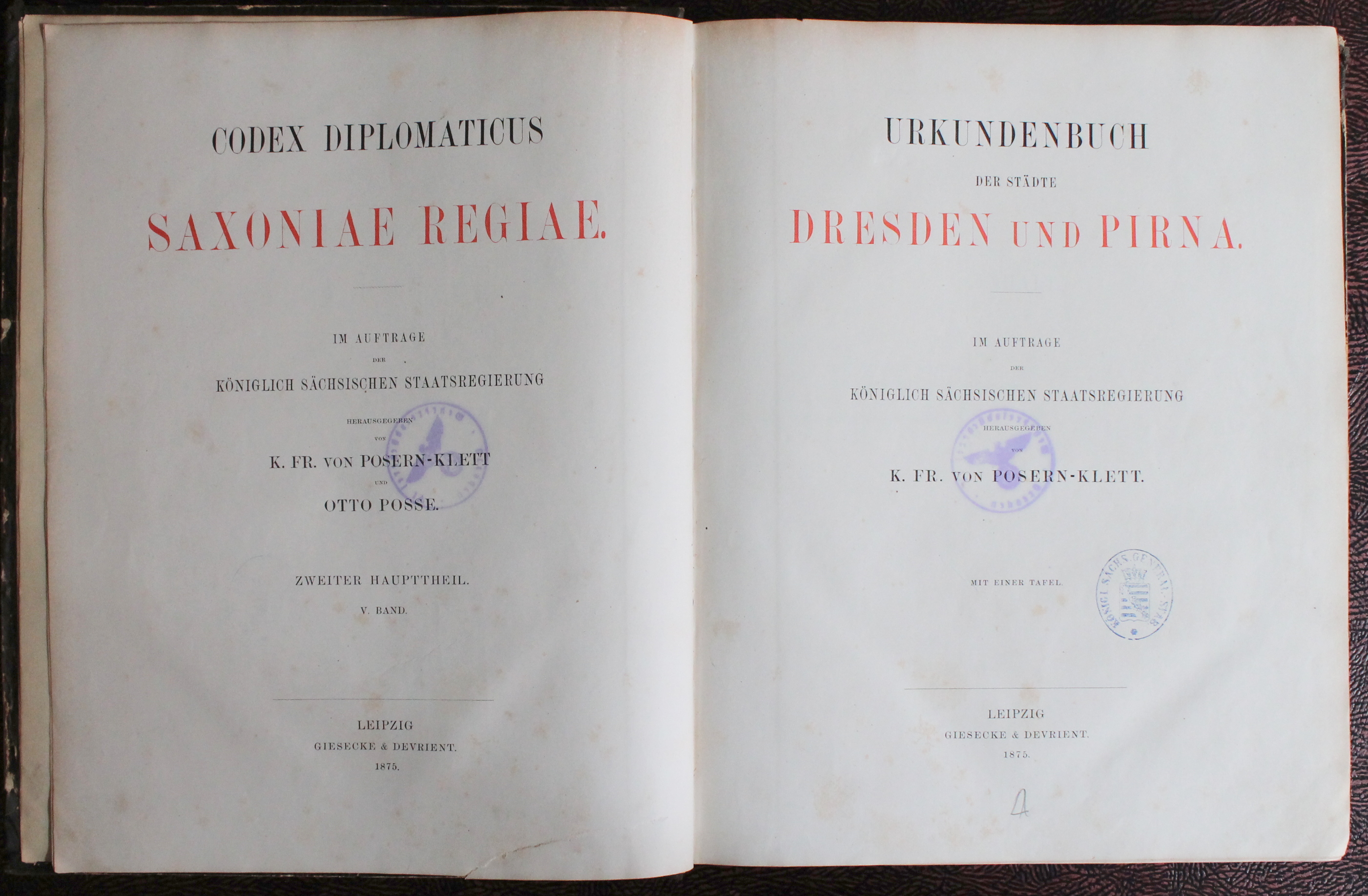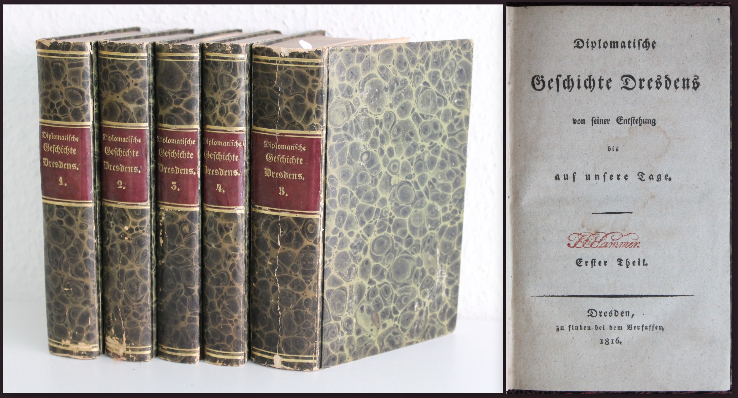 [Hasche, Johann Christian]. Diplomatische Geschichte Dresdens von seiner Enstehung bis auf unsere Tage. 5 Tle. in 5 Bd. + Urkundenbuch (bis Urkunde No. 256). Dresden, Selbstverlag, 1816-1820. 8°, XVI, 432 S.; XVI, 376 S.; XIV, 388 S.; VIII, 344 S.; VII, 156 S., 496 S.(Urkundenbuch), Ppbd. d. Zt. mit RS. Holzm-Boh. II, 6897 - Erste Ausgabe. Einbände etwas berieben und bestossen. Papierbedingt etwas gebräunt, sehr vereinzelt schwach feuchtigkeitsrandig. Titel jeweils mit kleinem alten Besitzstempel. Titel von Band 4 mit schwachen hs. Notizen von alter Hand. Wohl erhaltene Reihe des seltenen Titels.. Bestell-Nr: 8-1-111..........verkauft | ![]() | |