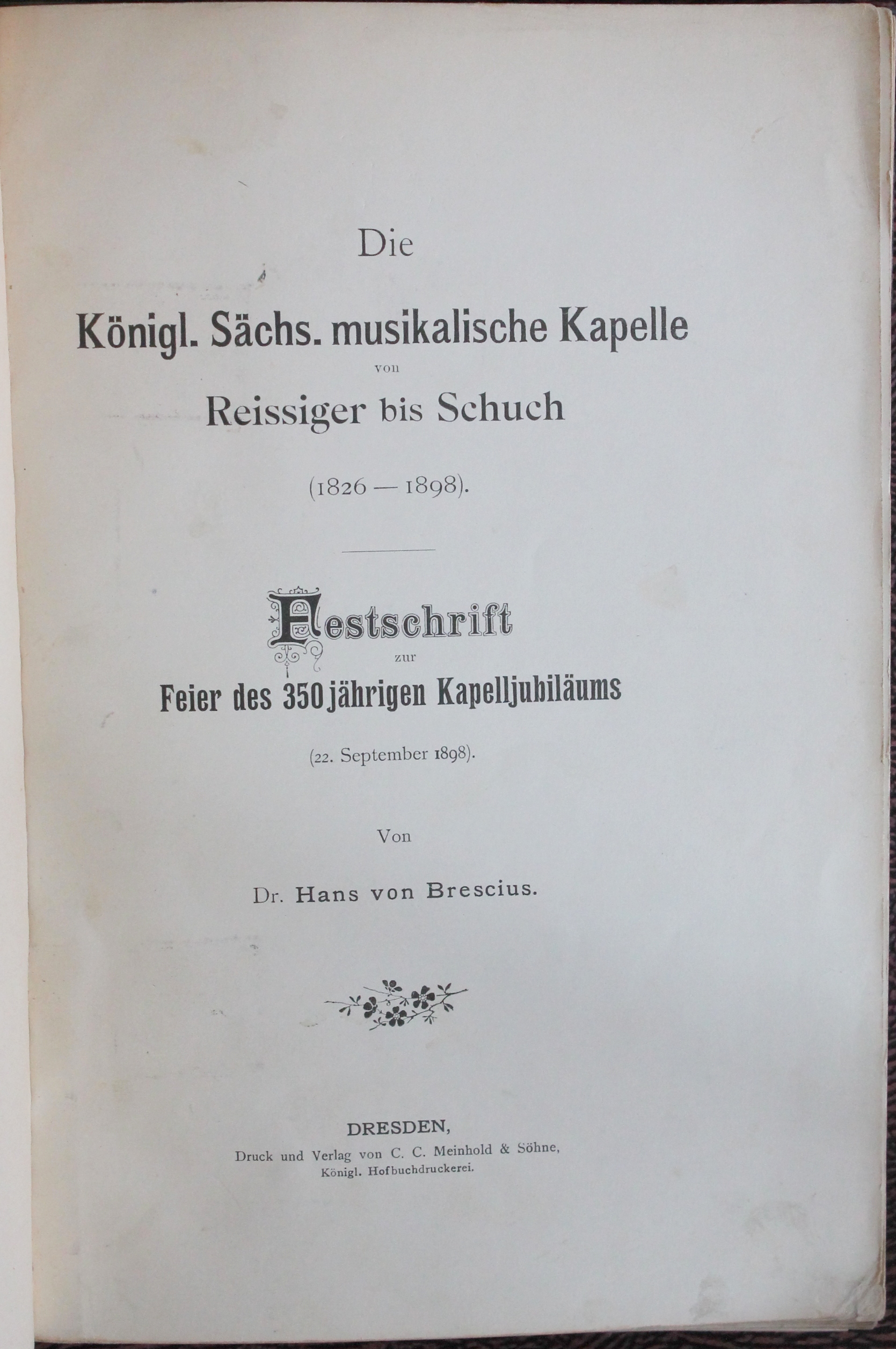 [Kuhn, Friedrich Adolf (Text) / Uber, Christian Friedrich Hermann (Komp.)]. Vorfeier der funfzigjährigen Regierung Sr. Majestät des Königs von Sachsen am 19. September 1818 in der Frauenkirche zu Dresden. o.O. [Dresden], Meinhold, o.J. (1818). 8°, 16 S., Rückenbroschur. Lobeshymne (ohne Noten) auf König Friedrich August. Etwas gebräunt, gering braunfleckig, gering eselsohrig. Sehr seltener Titel.. Bestell-Nr: 8-1-294..........verkauft | ||