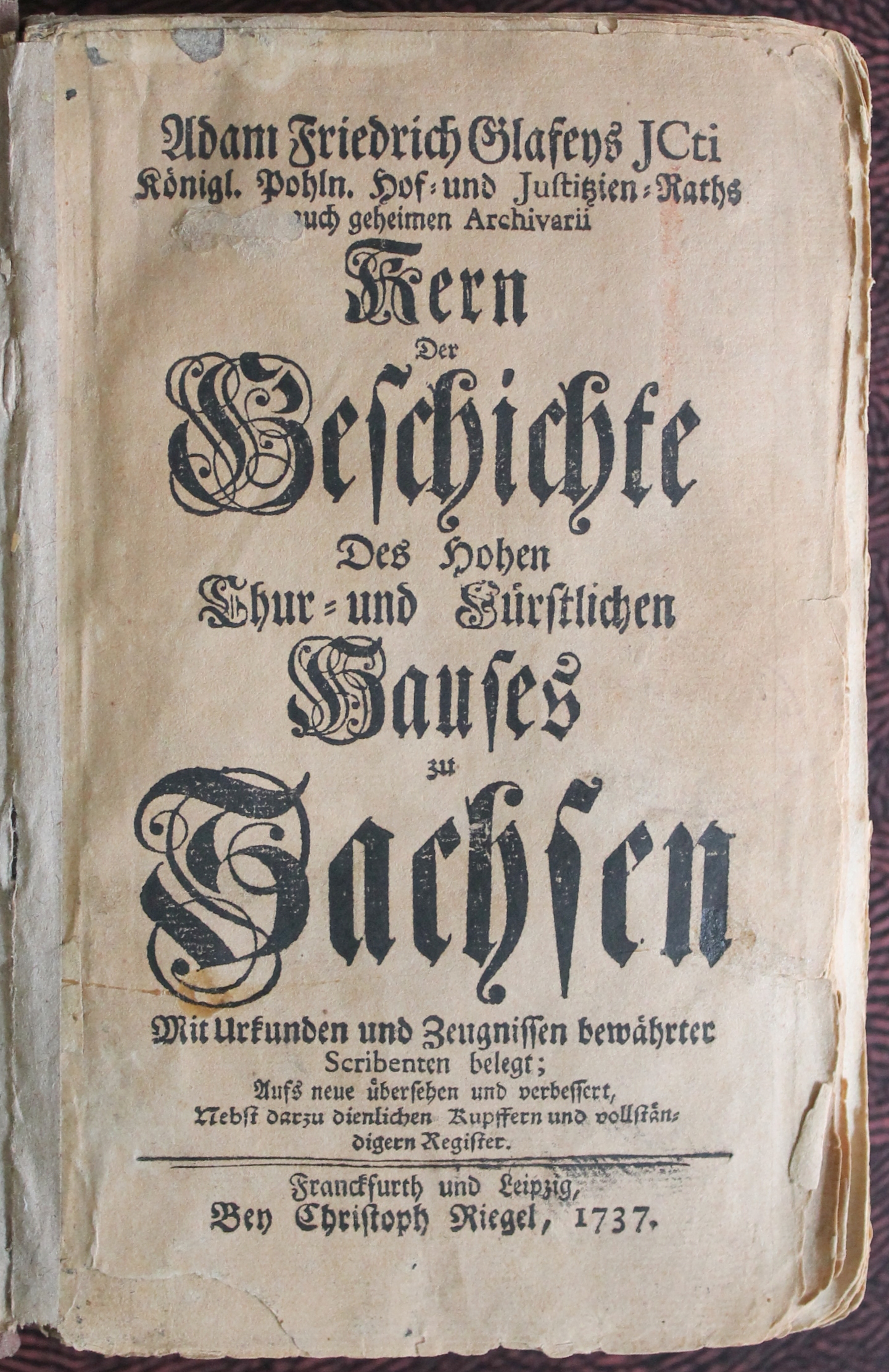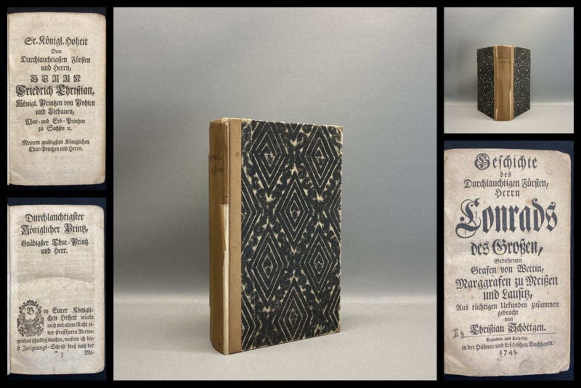 Schöttgen, Christian. Geschichte des Durchlauchtigen Fürsten Herrn Conrads des Großen, gebohrnen Grafen von Wettin, Marggrafen zu Meißen und Lausitz, aus tüchtigen Urkunden zusammen gebracht.. Dresden und Leipzig, Hübner und Leschisch, 1745. 8°(ca.18x11cm), mit einigen Abschlussvignetten und einer gestochenen Falttafel, 6 nn. Bll., 332 S., 10 nn. Bll. (Register), neuer Halbleinen unter Papierbezug. Bemmann-Jatzwauk I/1, 110. ADB XXXII, 412 ff. - Selten. Erste Ausgabe. Rare Biographie des Stammvaters des sächsischen Königshauses, Konrad I. (1098-1157). Wichtige Schrift des in Wurzen geborenen und bis 1716 in Leipzig tätigen Pädagogen und Universalgelehrten Christian Schöttgen (1687-1751), der später in Frankfurt/Oder und Dresden wirkte. - Einband etwas berieben und bestoßen, mit einigen kleinen Fehlstellen des Papierbezugs. Papier altersbedingt etwas gebräunt, durchgehend braun- und fingerfleckig. Letztes Blatt mit Abriss, einige Seiten an den Ecken etwas knickspurig.. Bestell-Nr: 8-1-608..........300,00 € (inkl. MwSt. zzgl. Versand) | ![]() | |