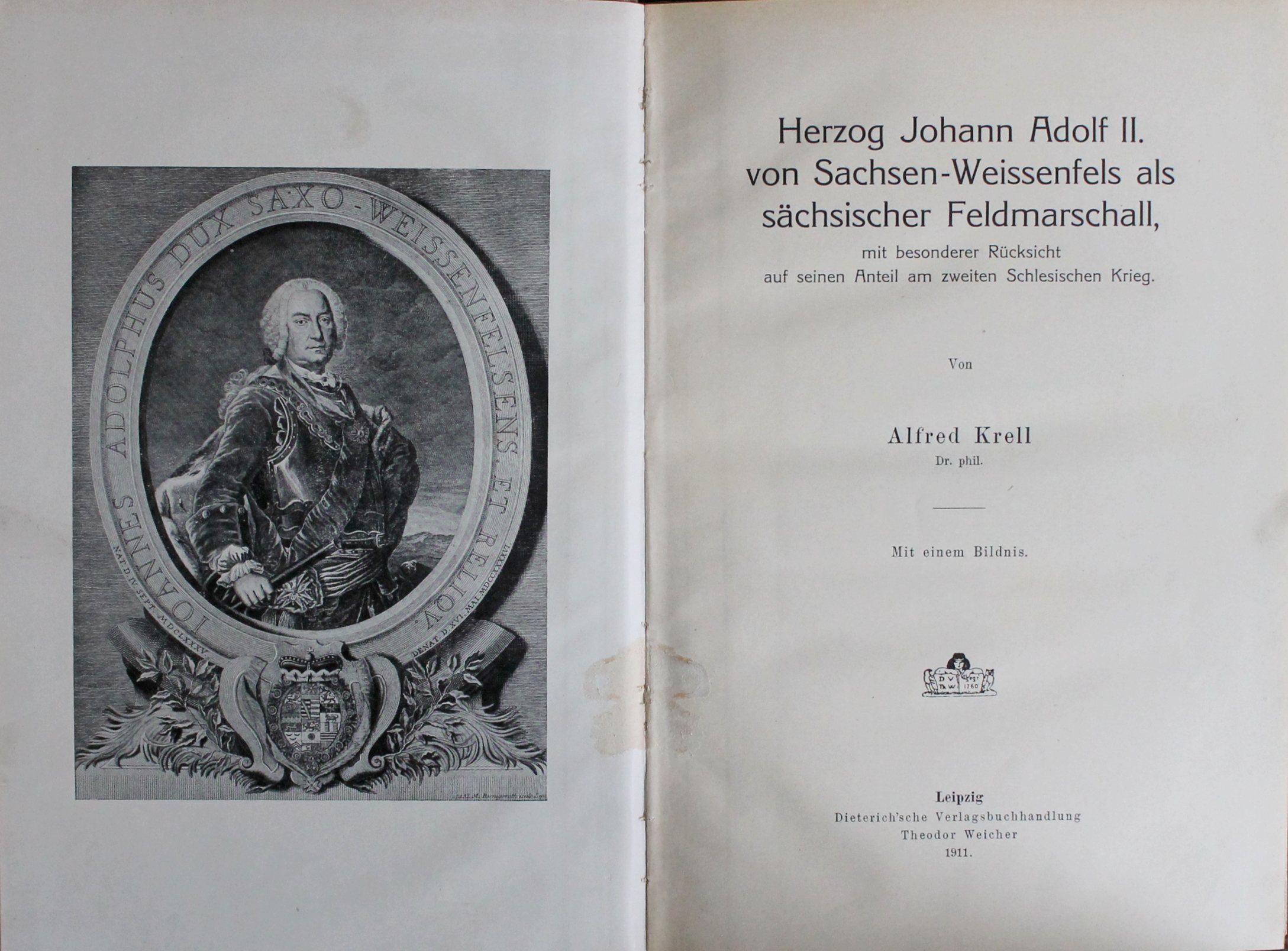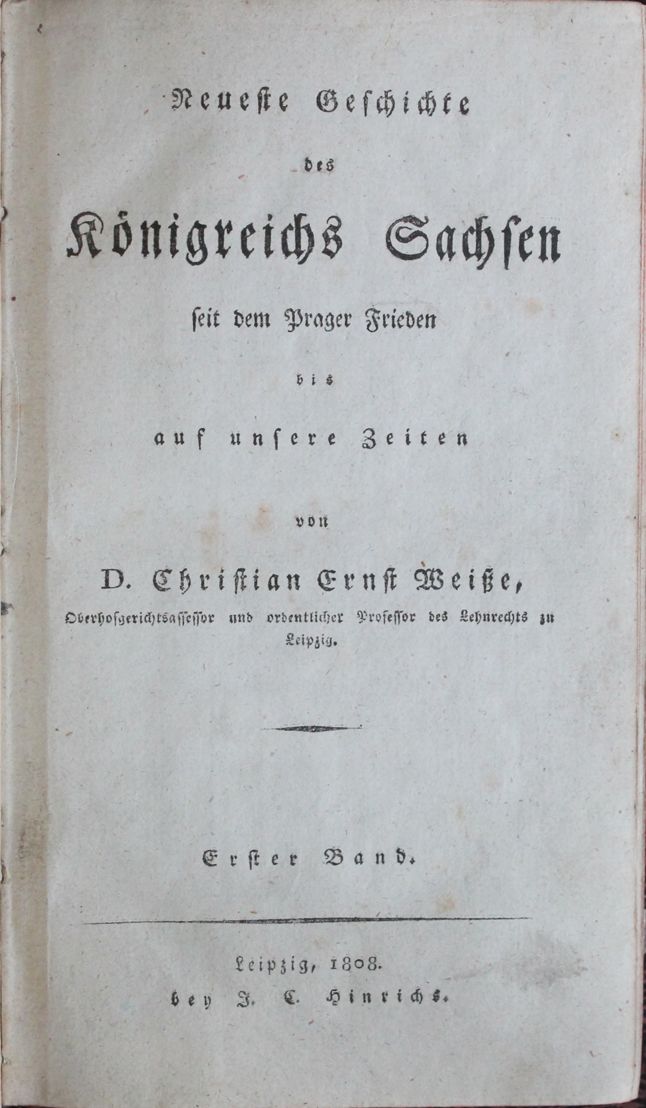 Weisse, D. Christian Ernst. Geschichte Friedrich Augusts Königs von Sachsen, Herzogs von Warschau etc.etc. bis zum Posener Frieden [...]. Leipzig, Hinrichs, 1811. gr. 8°, mit gest Portrait August des Starken und gest. Titel, XVI, 1 Bl., 252 S., geflammter Ppbd. d. Zt. Erste Ausgabe. Lebensgeschichte Friedrich August III., welcher 1806 König von Sachsen wurde. Einband berieben, Ecken alt mit Papier verstärkt, Bezugspapier in den Gelenken abgeplatzt. Papier sauber, sehr vereinzelt minimal braunfleckig. Titel mit altem hs. Besitzvermerk, ebenso der vordere Spiegel und das letzte Blatt im unteren weißen Rand. Gutes Exemplar. Bestell-Nr: 8-1-91..........verkauft | ||