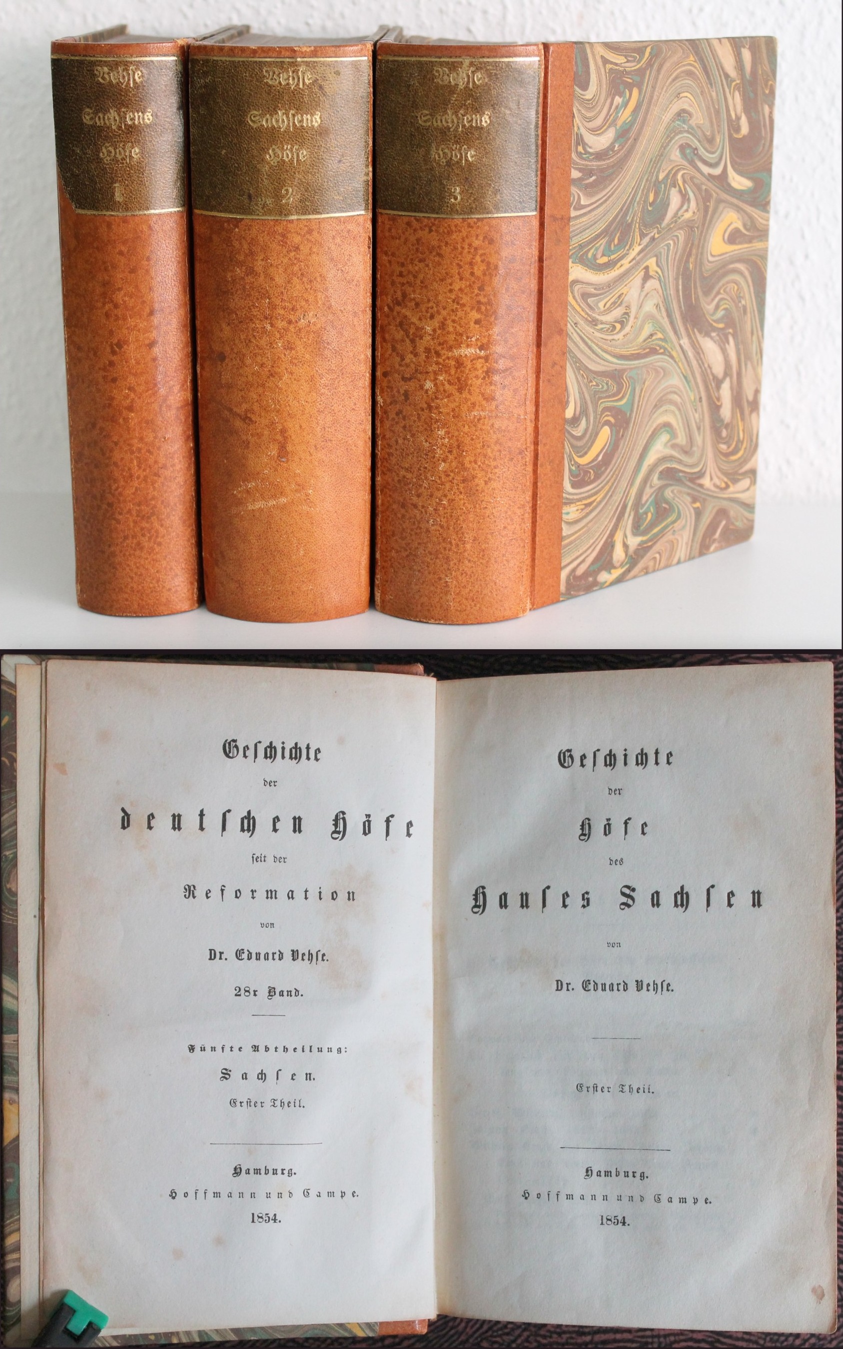Vehse, Dr. Eduard. Geschichte der Höfe des Hauses Sachsen. 7 Tle. in 3 Bd. Hamburg, Hoffmann und Campe, 1854. 8°, zus. ca. 2300 S., neuerer HLdr. im Stil d. Zt.. Hayn-Gotendorf VIII, 74 ; Bemmann-Jatzwauk I/1, 189 - Erste Ausgabe. Erschien als 5. Abteilung der Reihe "Geschichte der deutschen Höfe seit der Reformation" (Band 28-34). Einbände (um 1900) gering berieben, kaum bestossen. Papier gering gebräunt, sehr vereinzelt etwas braunfleckig. Gute Exemplare. Bestell-Nr: 8-1-128..........verkauft | ![]() | |