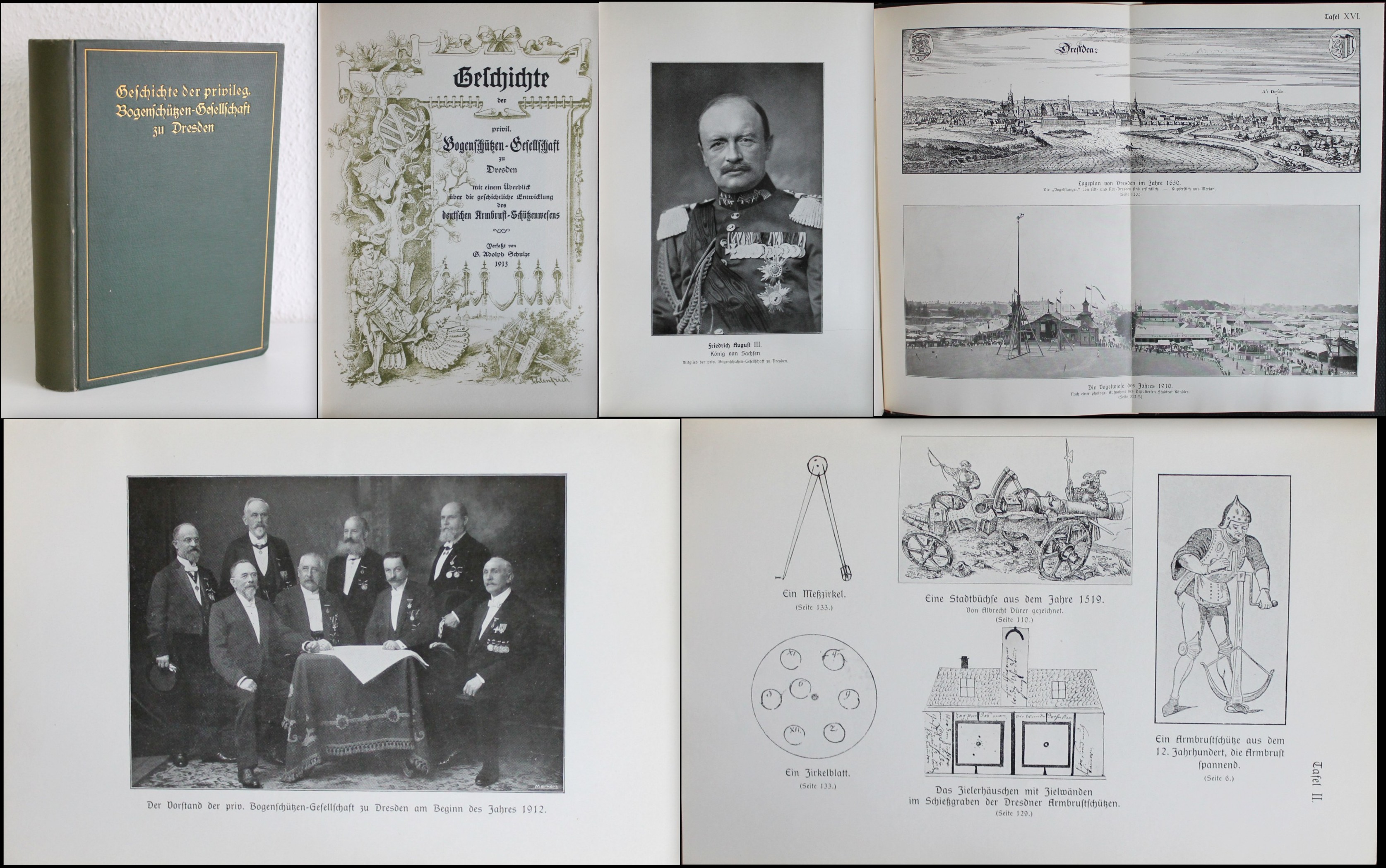 Schulze, G. Adolph. Geschichte der privil. Bogenschützen-Gesellschaft zu Dresden mit einem Überblick über die geschichtliche Entwicklung des deutschen Armbrust-Schützenwesens. Dresden, Gärtnersche Buchdruckerei Heinrich Riescher, 1913. gr. 8°, 319 S., 20 Taf., Ln.. Einband gering berieben und bestoßen, an den Kapitalen und Gelenken etwas mehr berieben. Rücken etwas aufgehellt. Papaierbedingt gebräunt und vereinzelt leicht fingerfleckig.. Bestell-Nr: 8-1-129..........verkauft | ![]() | |