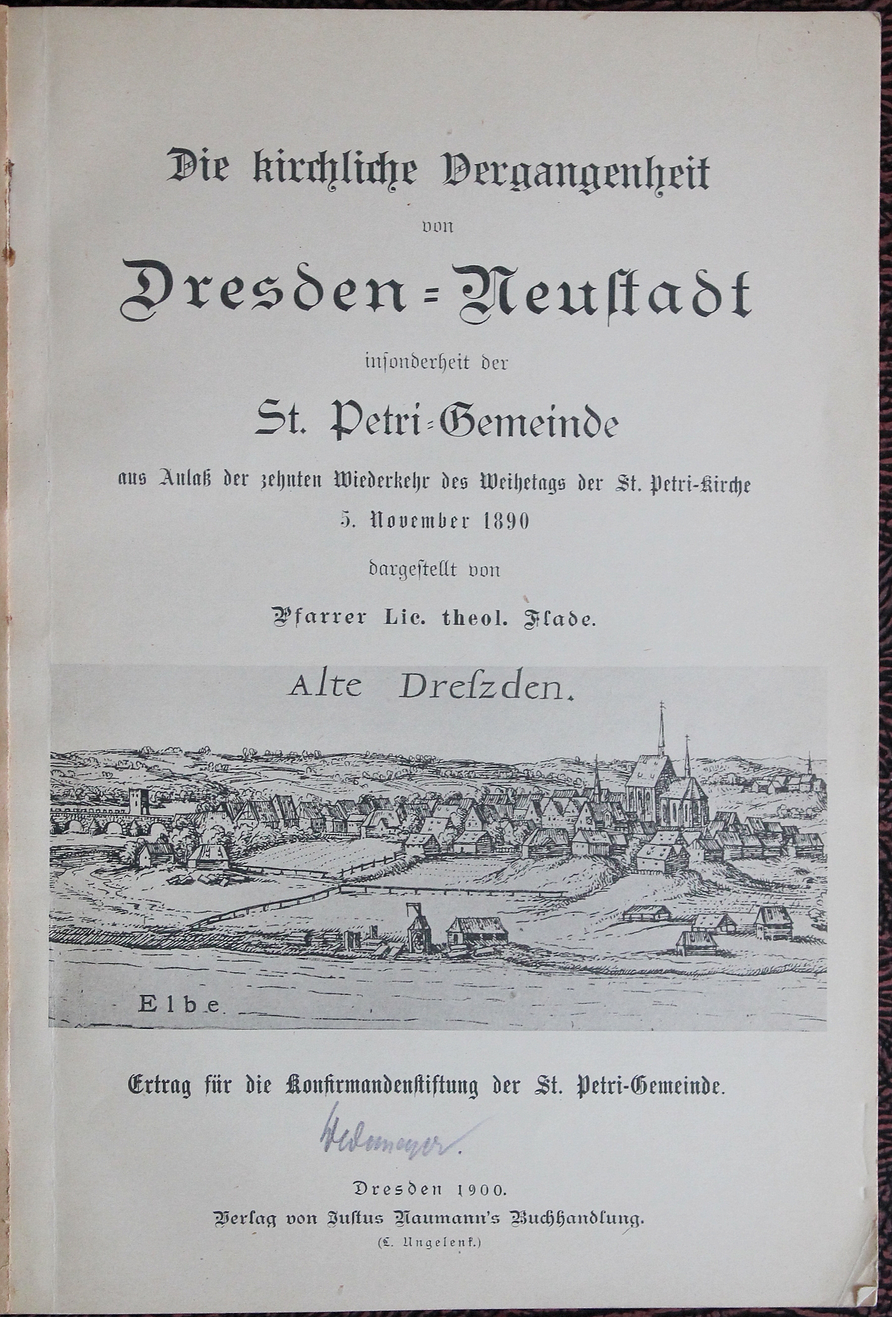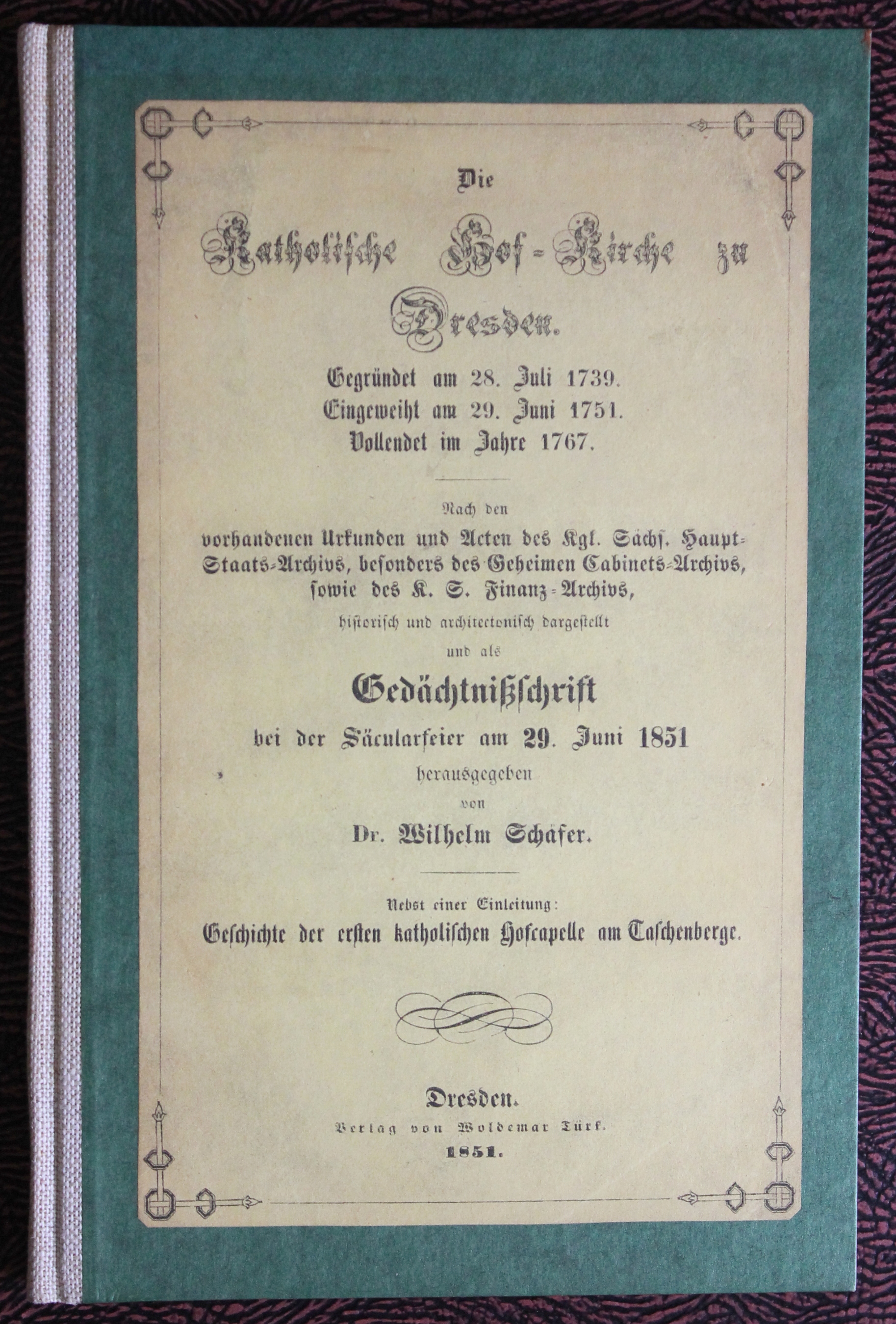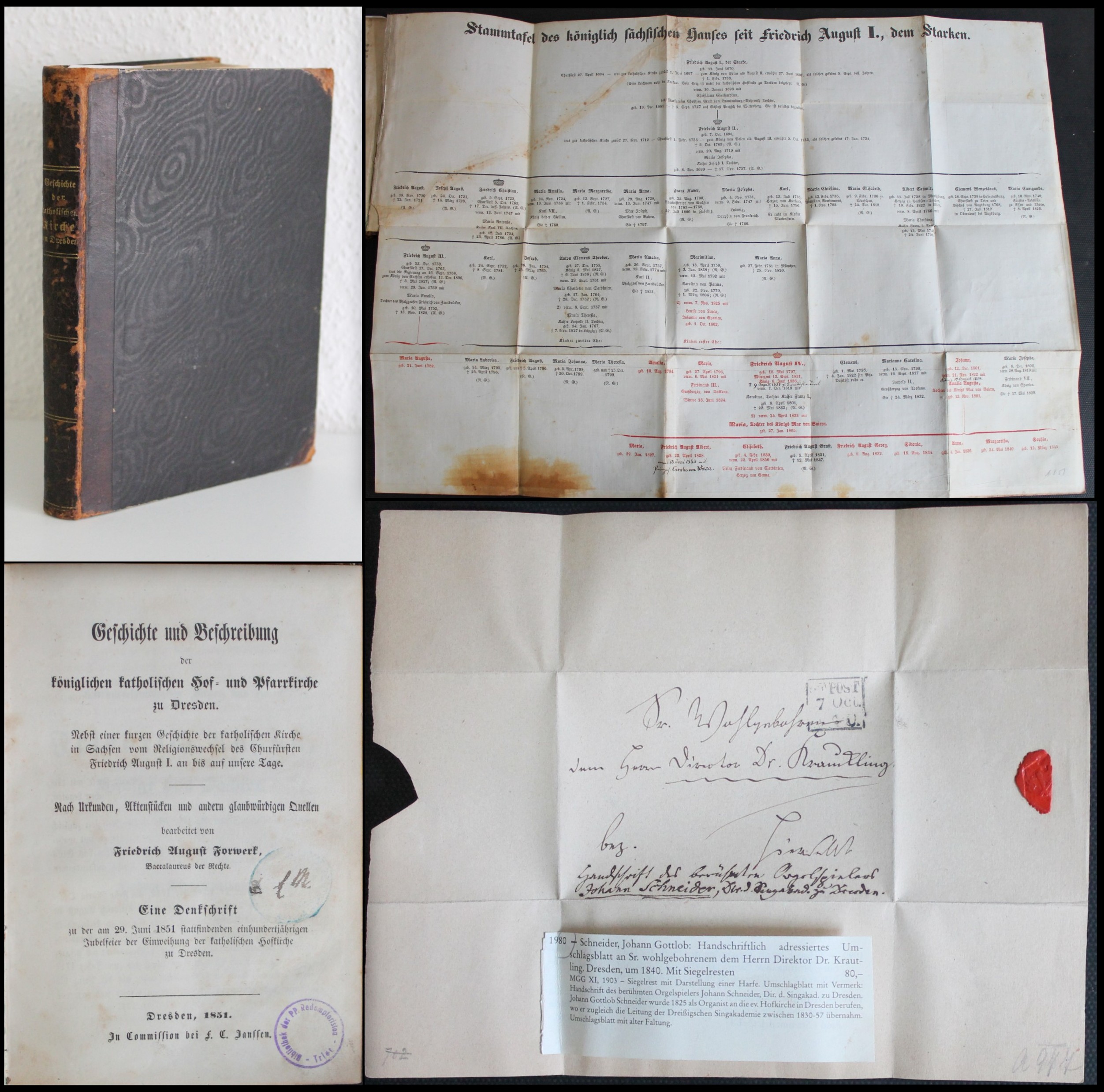 Böttger, Gustav. Die Geschichte der Annenkirche in Dresden. Eine Säcularschrift aus den Quellen bearbeitet und herausgegeben von [...]. Dresden, Adler und Dietze, 1860. 8°, mit 1 lithografierten Ansicht der Kirche, 71 S., OBrosch. Einband berieben und bestoßen. Block mittig geteilt. Broschur mit Ein- und Ausrissen im Rand. Papier altersbedingt gebräunt, vereinzelt gering fleckig. Ansicht der Kirche mit Feuchtigkeitsrand. Widmungsblatt mit Eckabriss. Bestell-Nr: 8-1-271..........65,00 € (inkl. MwSt. zzgl. Versand) | ||